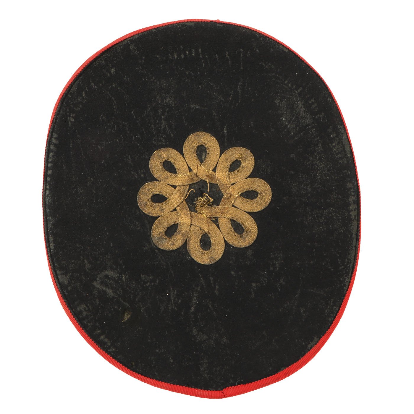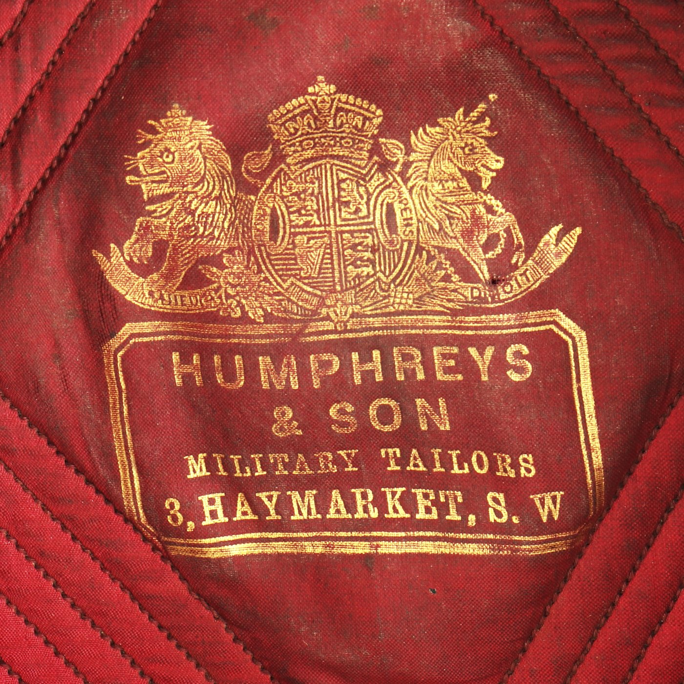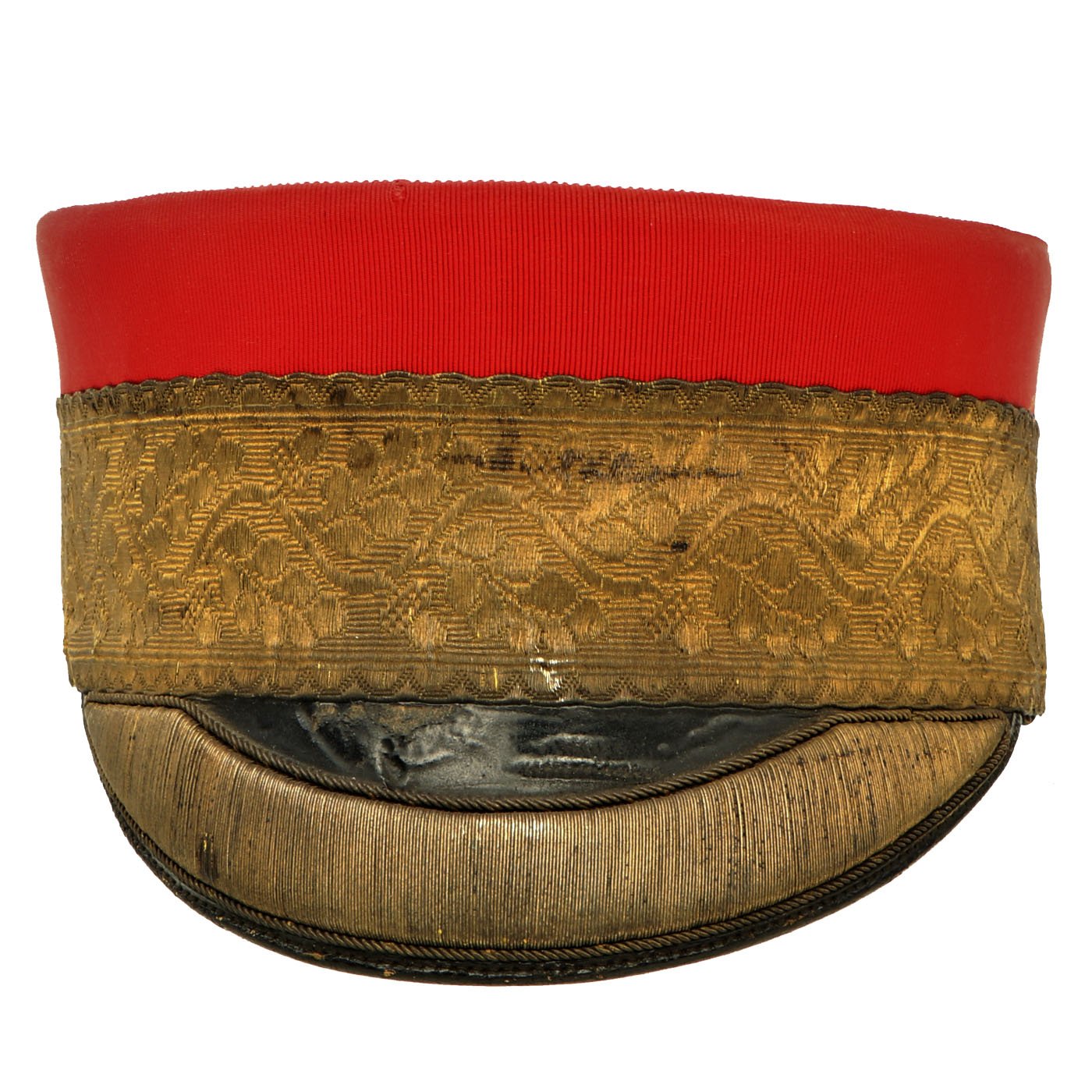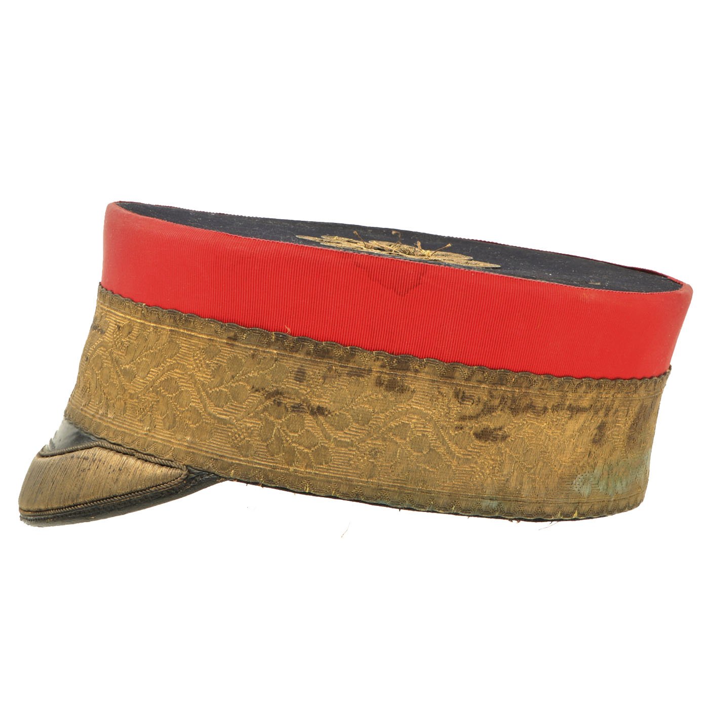 Original item: Only One Available. The round forage cap with drooping peak, was first introduced generally in 1880 (It had been worn for some time by the Foot Guards prior to 1880) and it was to replace the shallower, kepi style round cap with the flat straight peak that had been worn since just after the Crimean War. At first it had straight sides but after some time, it developed a bell top. The cap was worn by most branches of the army except the cavalry, Royal Artillery and Rifle regiments in the infantry who wore the pillbox cap. On the previous caps, infantry regiments had worn their cap badge which was the regimental number in gilt or brass and where appropriate, a regimental device above. When the Childers reforms of 1881 were enacted, the numbers disappeared and regimental badges were adopted in either embroidery or various metals like gilt or silver. These regimental badges and devices were first described in the Dress Regulations of 1883, and continued through to regulations of 1900. The badges themselves were quite elaborate and must have tested the skill of the embroiderer as it was all done by hand. Because of that, badges varied in detail (sometimes substantially) because the work was done at a different time or by a different firm.