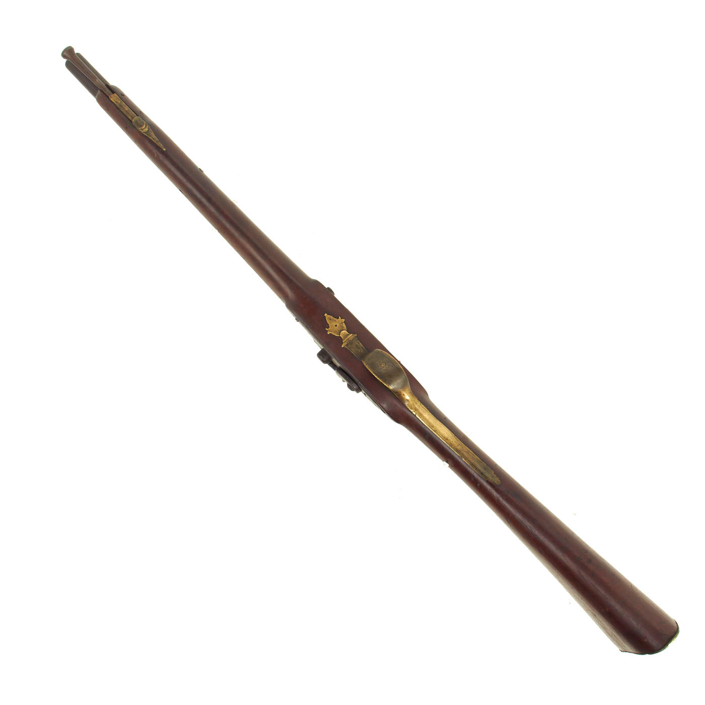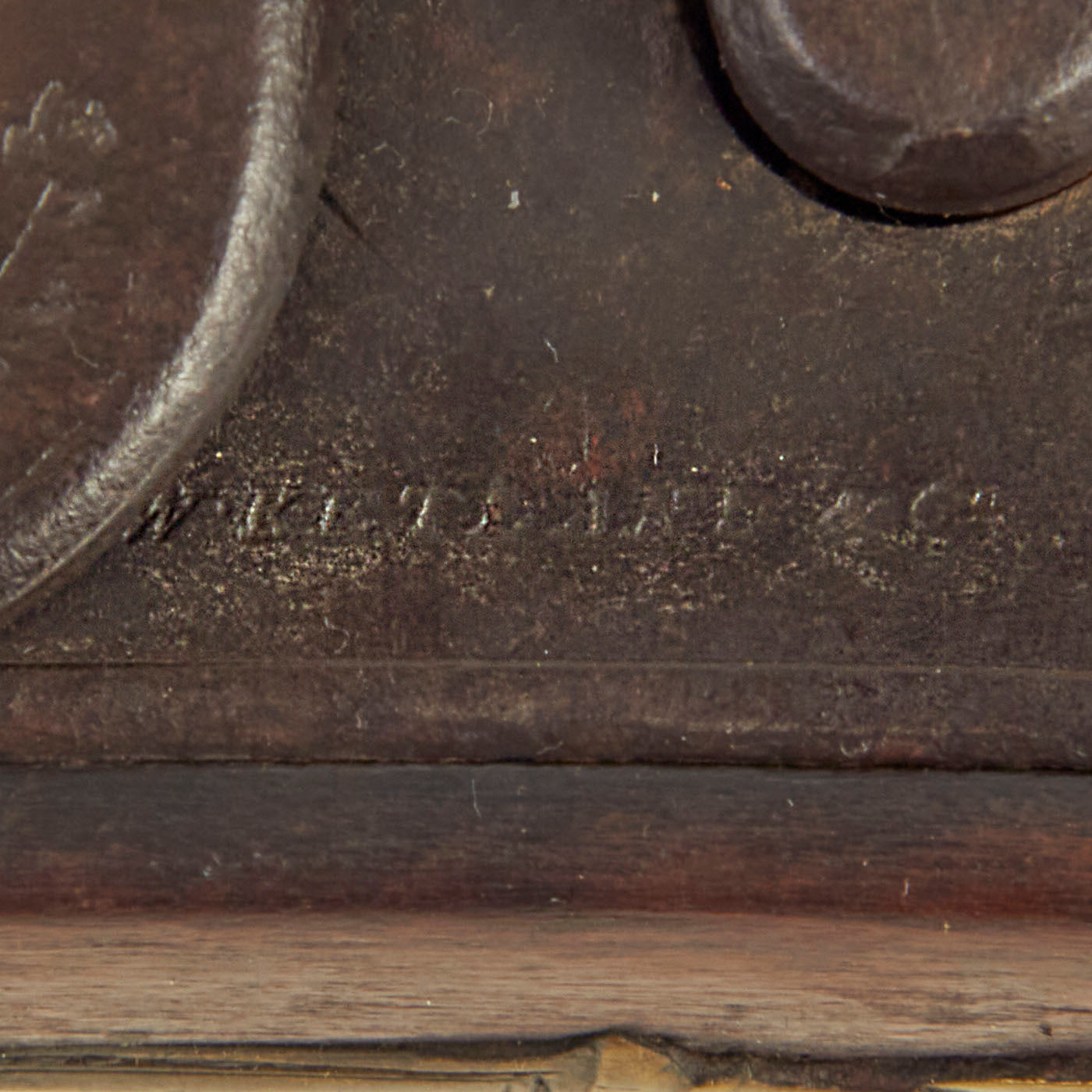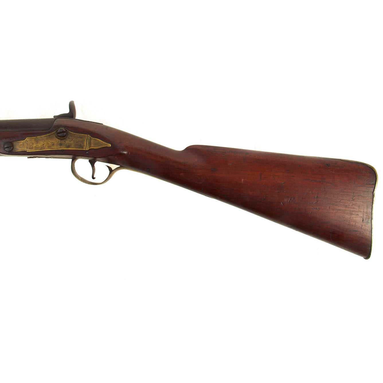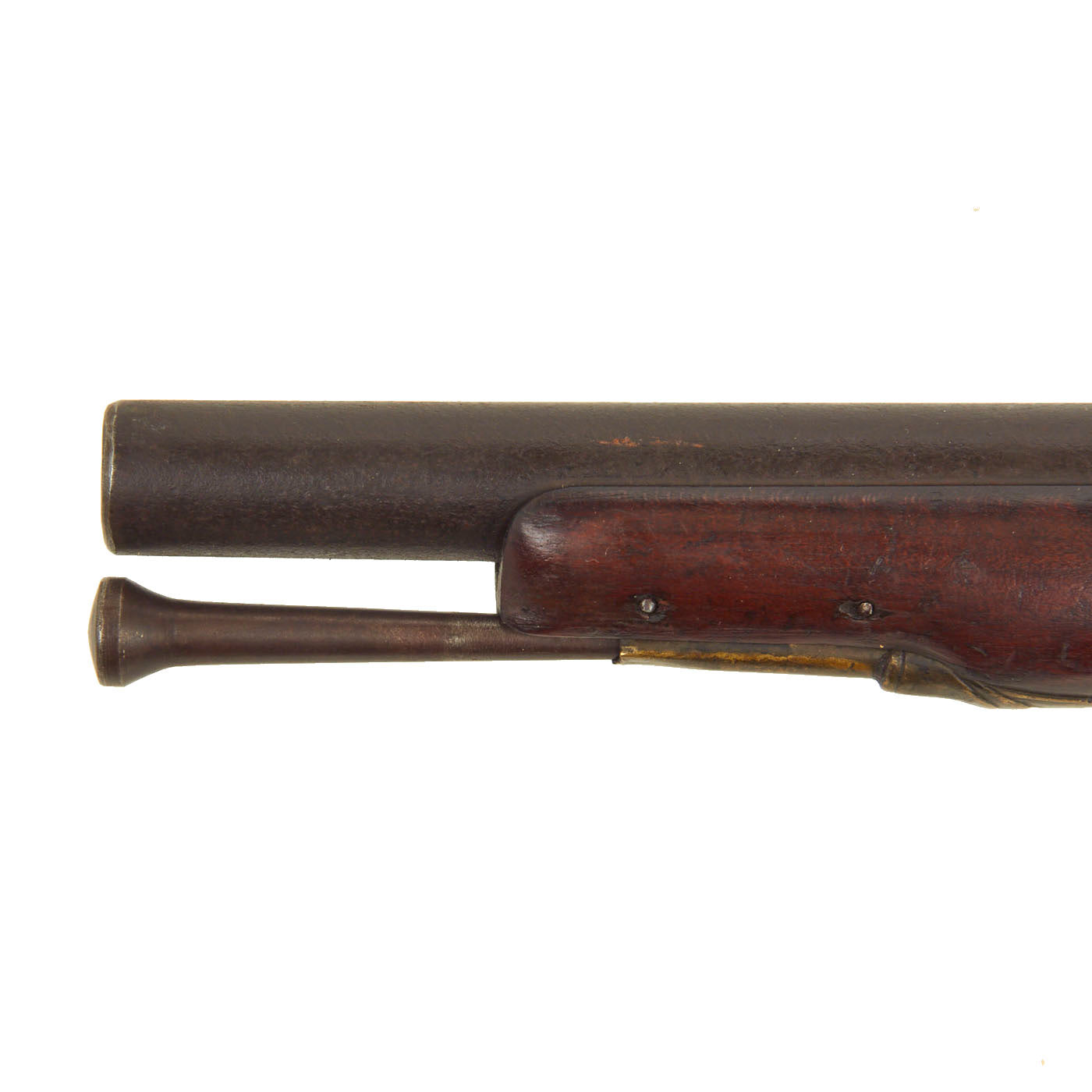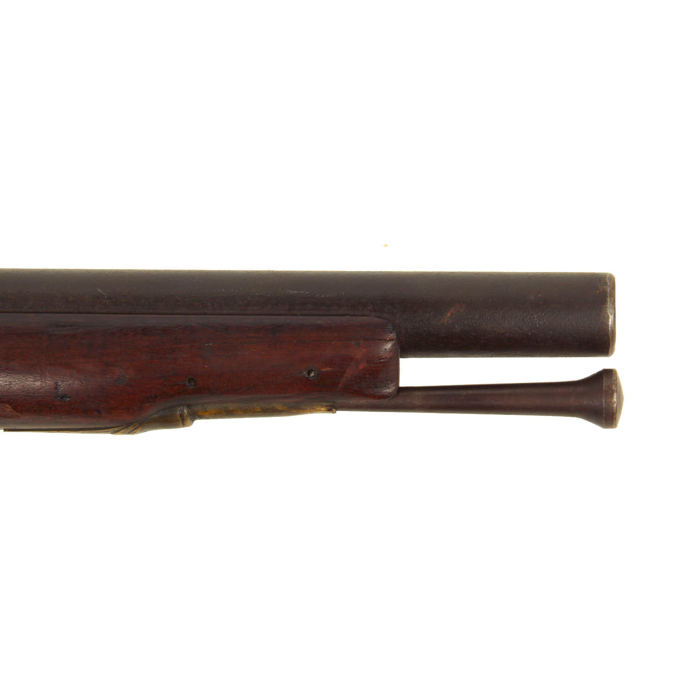 At some point after that, the barrel was cut down to just 16 ½ inches, becoming what we know as a BLANKET GUN, carried mostly by Native Americans in the Fur Trapping regions. The small gun would be hidden under a shoulder blanket for protection while attending traps. The gun is in very nice shape, and comes complete with a shortened steel ramrod. The lock is still fully functional, holding at half cock and firing at full, and the cap nipple looks to be a more recent replacement. The barrel shows some minimal engraving, but we can still see the faint CROWN / V “viewed” and CROWN / GP markings of the London Proof House.