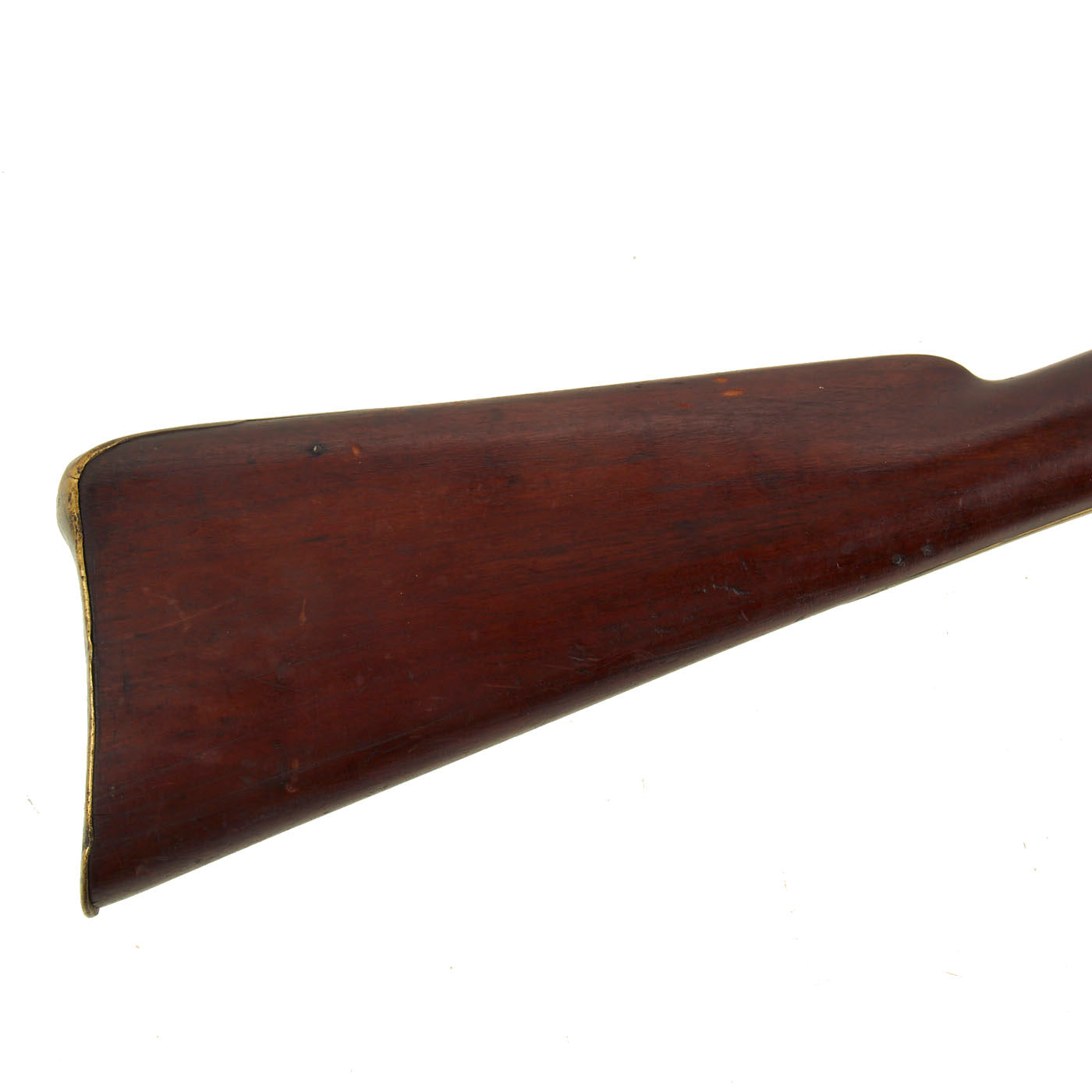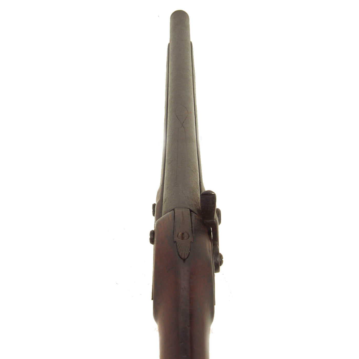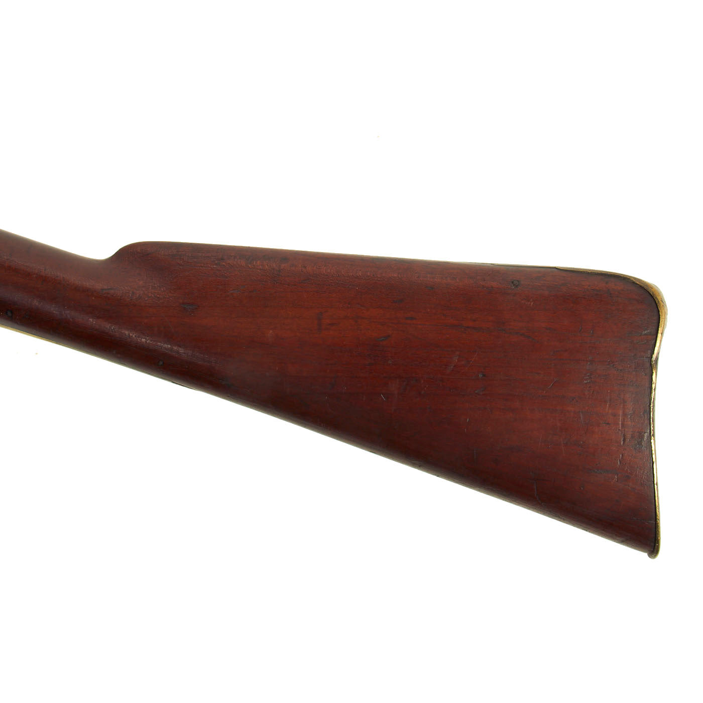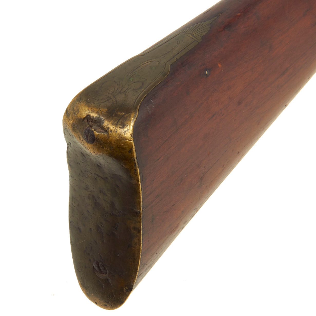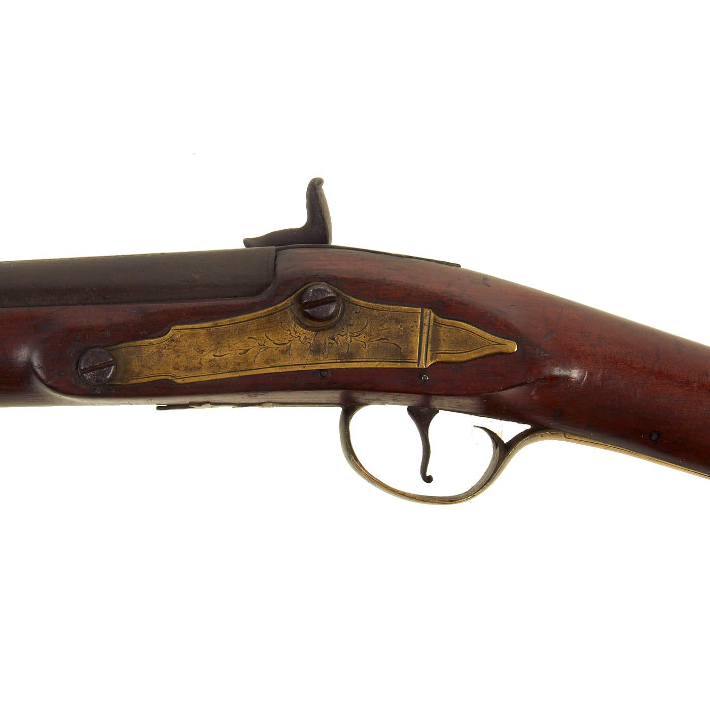 At some point after that, the barrel was cut down to just 16 ½ inches, becoming what we know as a BLANKET GUN, carried mostly by Native Americans in the Fur Trapping regions. The small gun would be hidden under a shoulder blanket for protection while attending traps. The gun is in very nice shape, and comes complete with a shortened steel ramrod. The lock is still fully functional, holding at half cock and firing at full, and the cap nipple looks to be a more recent replacement. The barrel shows some minimal engraving, but we can still see the faint CROWN / V “viewed” and CROWN / GP markings of the London Proof House.