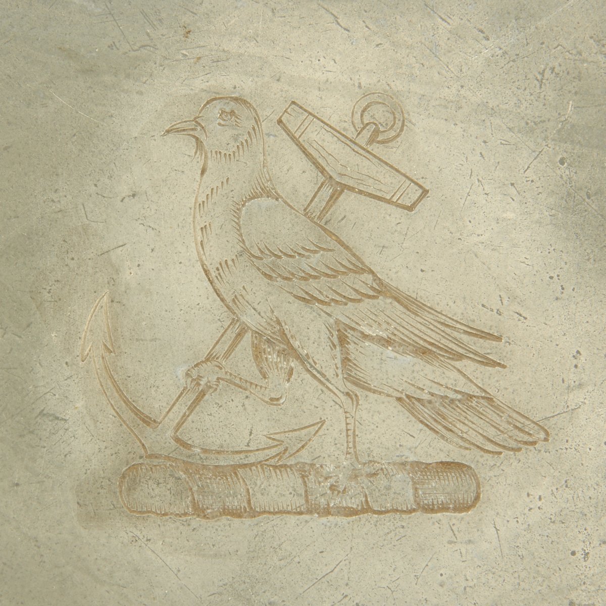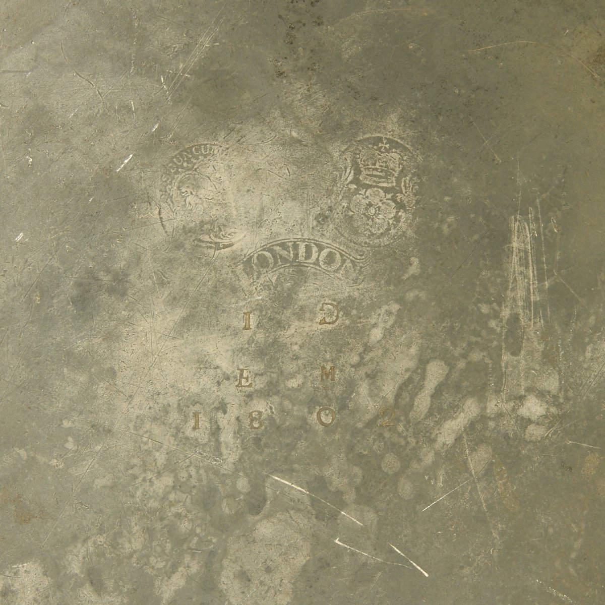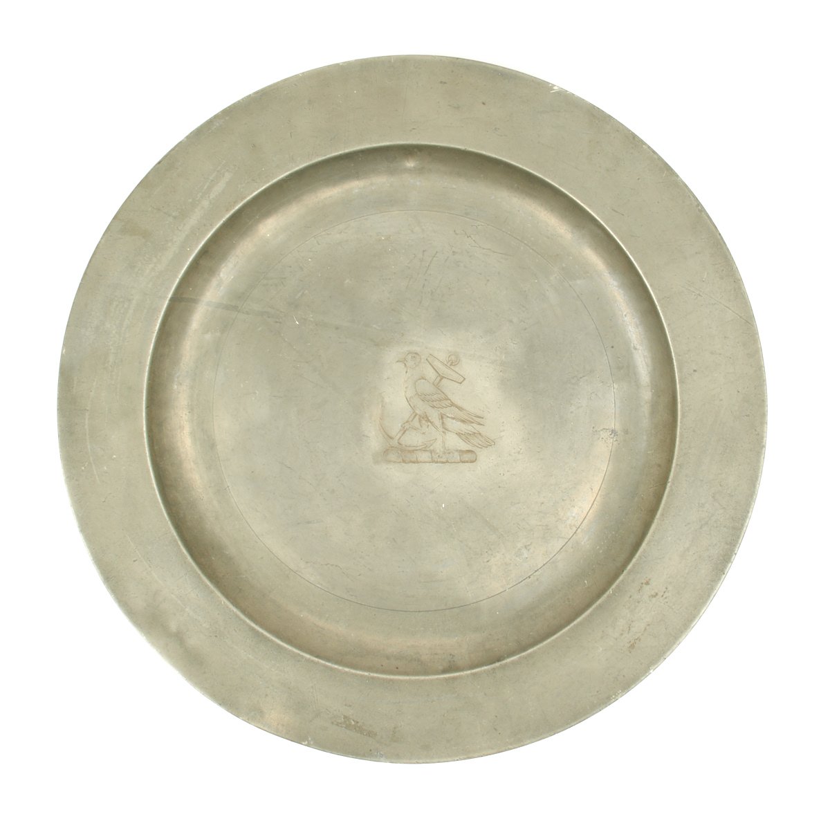 Original Item. One Only. This is a King George III Era pewter platter or charger, a huge 18" in diameter, bearing all the correct Maker's and Proof Markings to the rear, including the date of 1802. On the top in the center is the Family Crest of ADMIRAL SAMUEL HOOD R.N.: a Cornish Chough perched with its right claw on the fluke of an anchor.