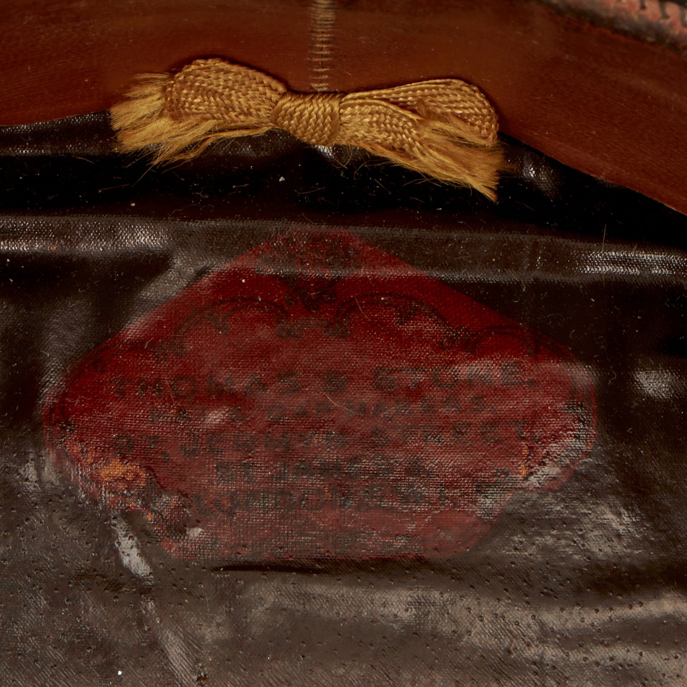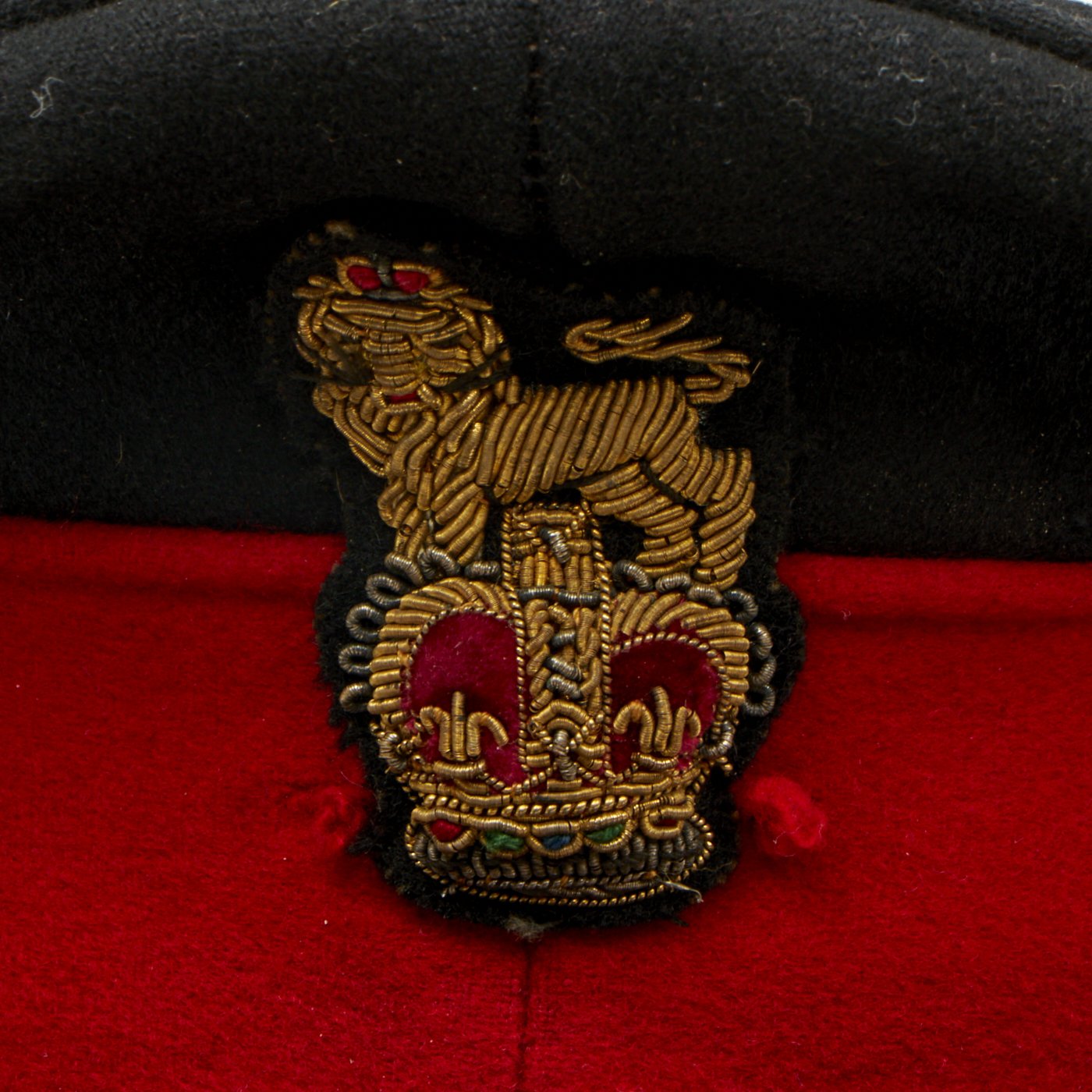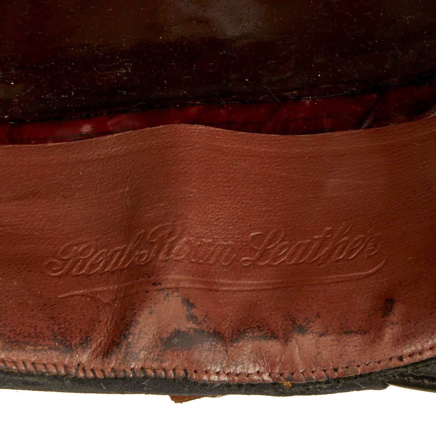 Dating from the mid-late 1950s, the style is pretty much identical to that used during WWII. The front has the correct Lion over a Queens's Crown embroidered bullion badge with red and black felt. The interior features Real Roam Leather sweatband, and the top celluloid sweat shield, though dark from age, still has the original makers label under it:
