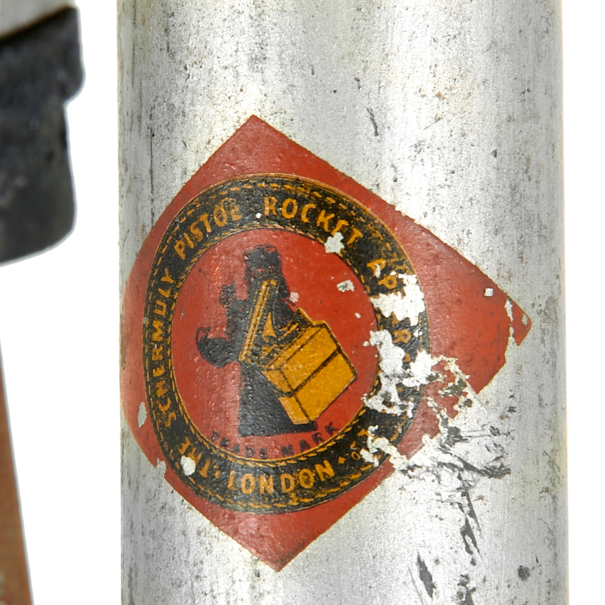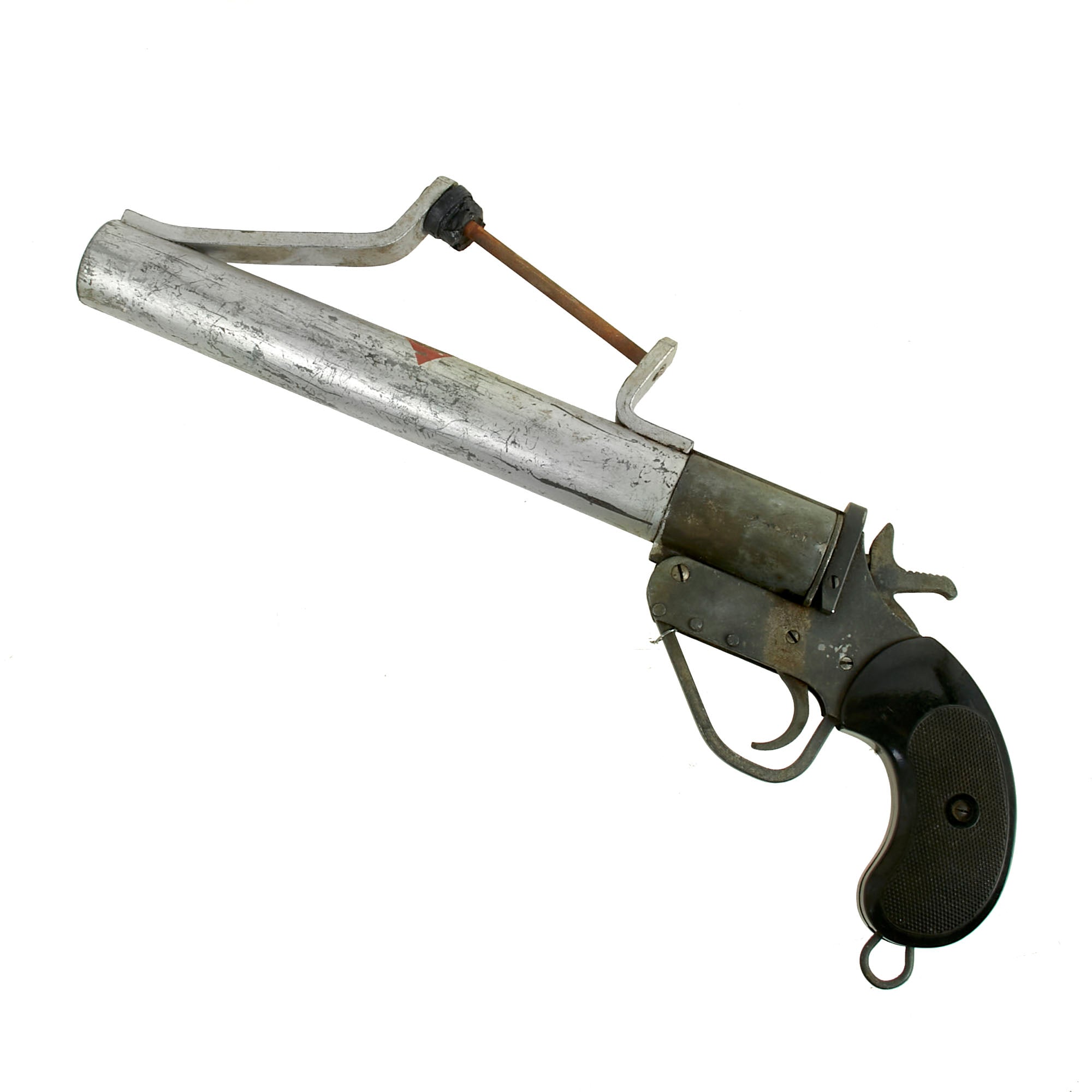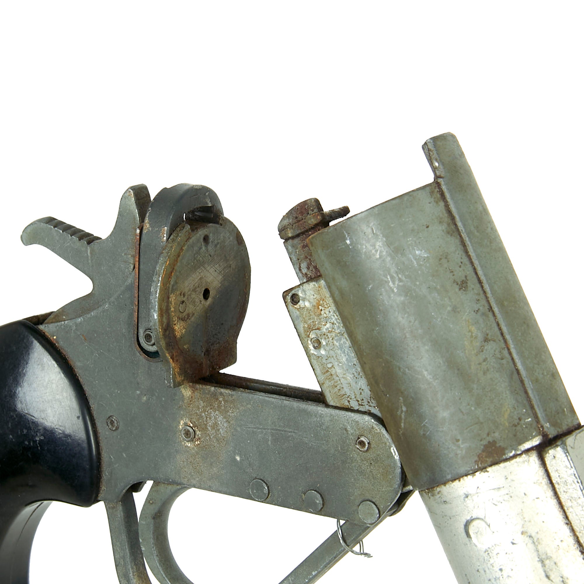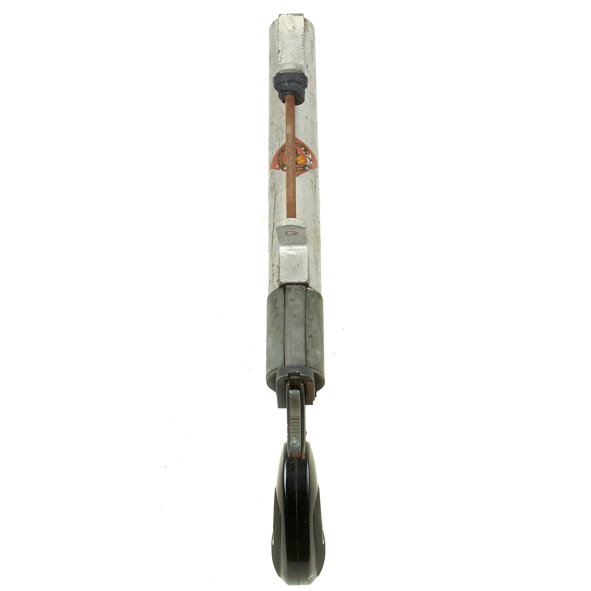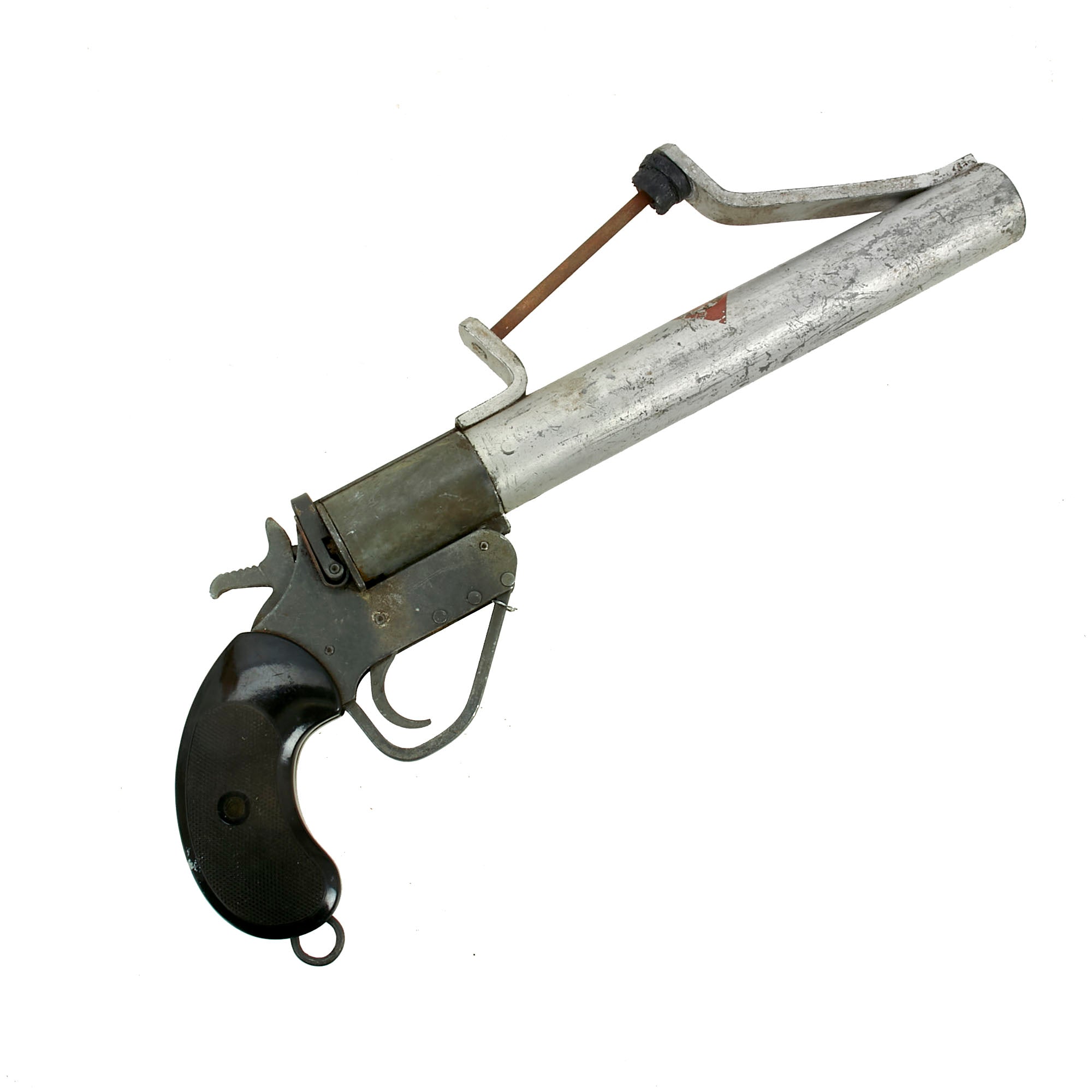 This is a Post-WWII variation of the Schermuly Pistol Rocket which was marketed as the Rocket Apparatus Yacht Rescue Set, in a smaller caliber than the WWII variation. This example is missing most of the grip handle, but retains the logo on top of the barrel. It breaks open and closes without issue, and dry fires well.