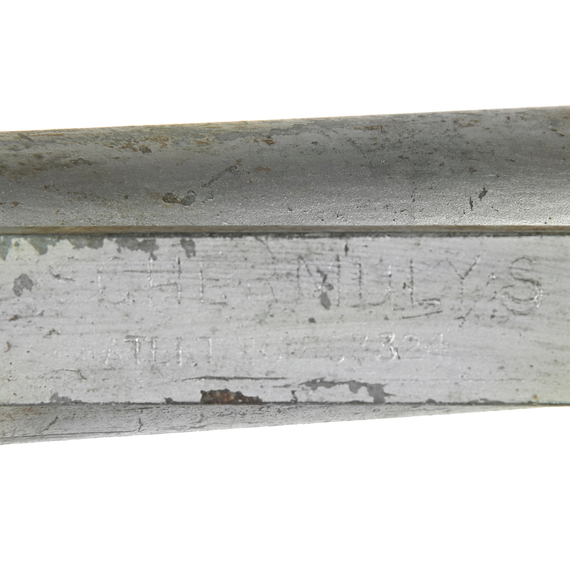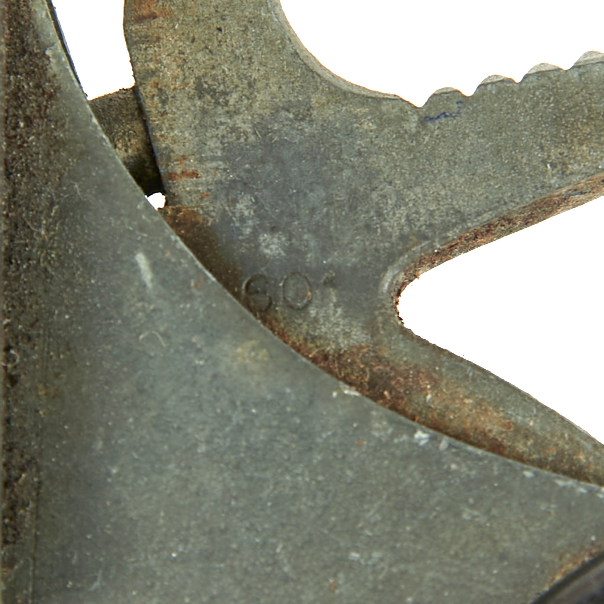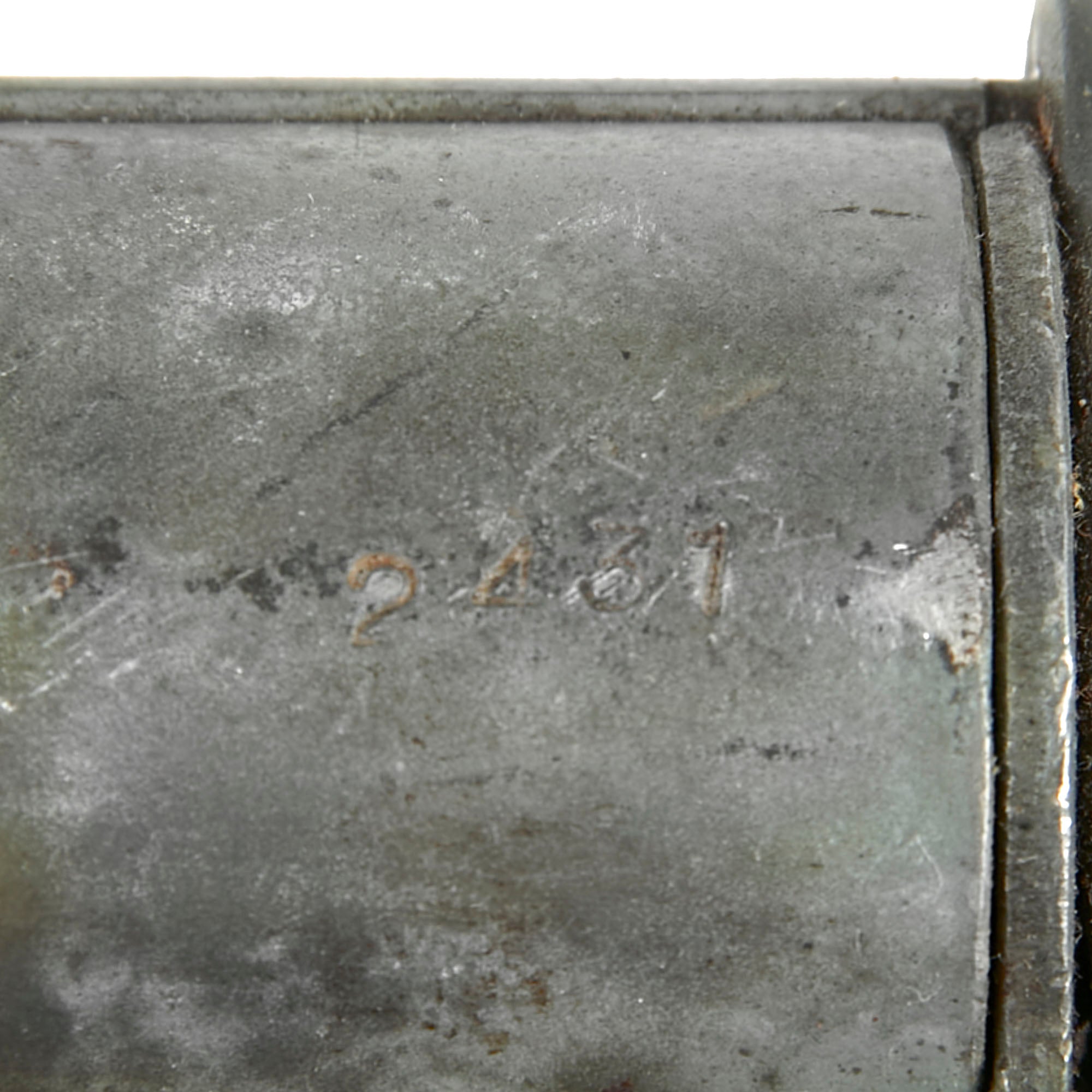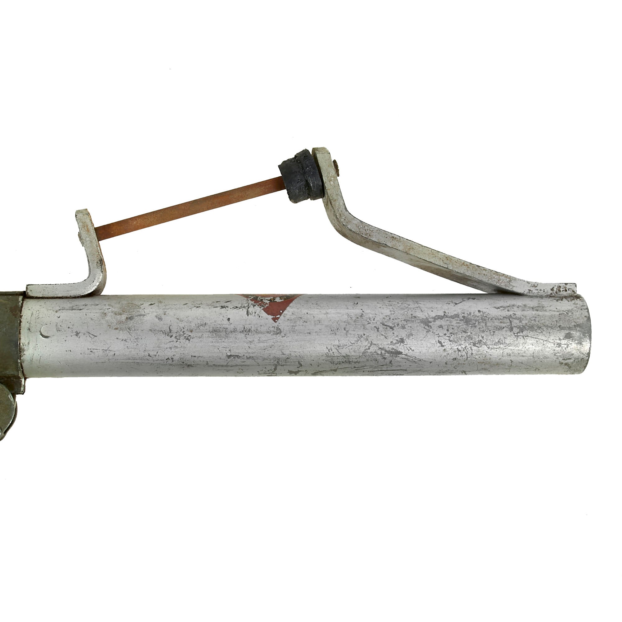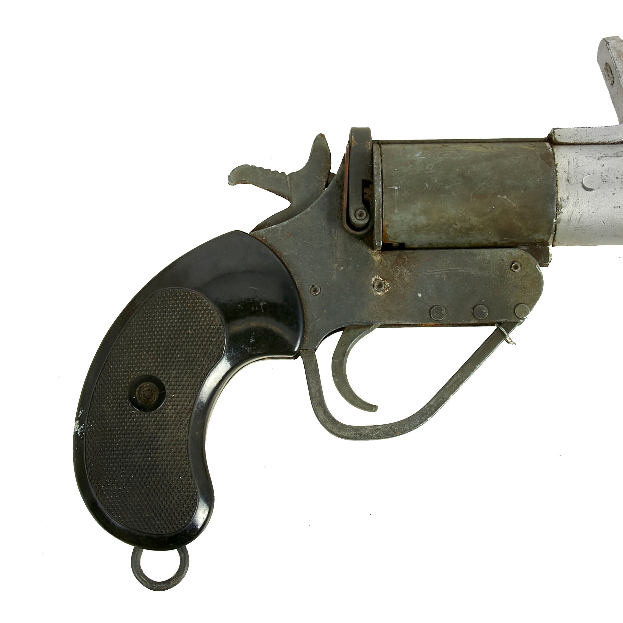 This is a Post-WWII variation of the Schermuly Pistol Rocket which was marketed as the Rocket Apparatus Yacht Rescue Set, in a smaller caliber than the WWII variation. This example is missing most of the grip handle, but retains the logo on top of the barrel. It breaks open and closes without issue, and dry fires well.