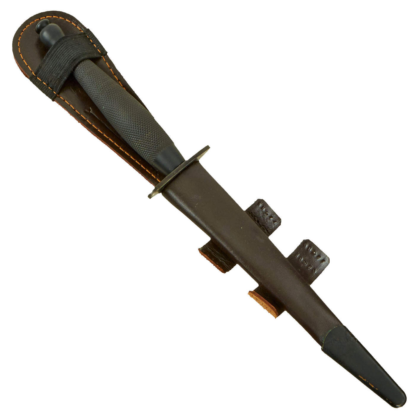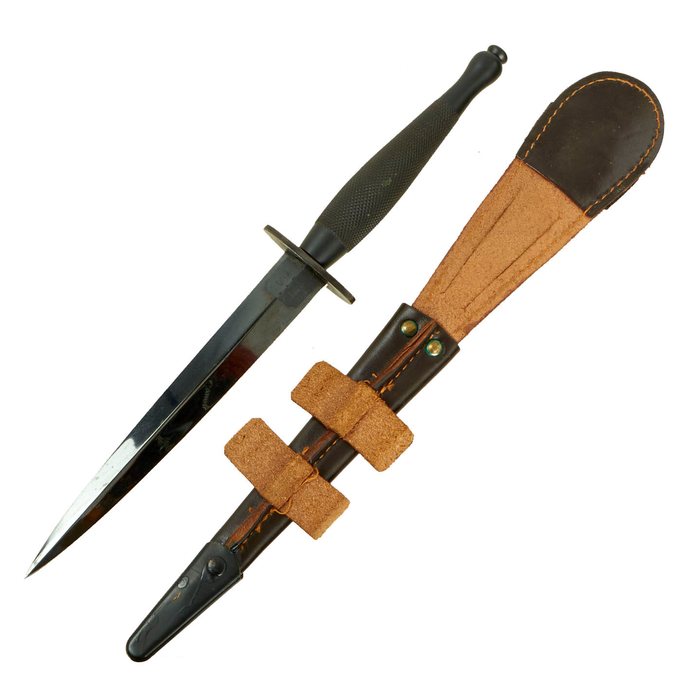 Original Item: Only One Available. This is a very nice, unissued example of a Second Pattern Fairbairn-Sykes fighting knives. Featuring a blackened brass handle, blackened blade, unstamped cross guard and a lovely leather sheath with tabs still present.