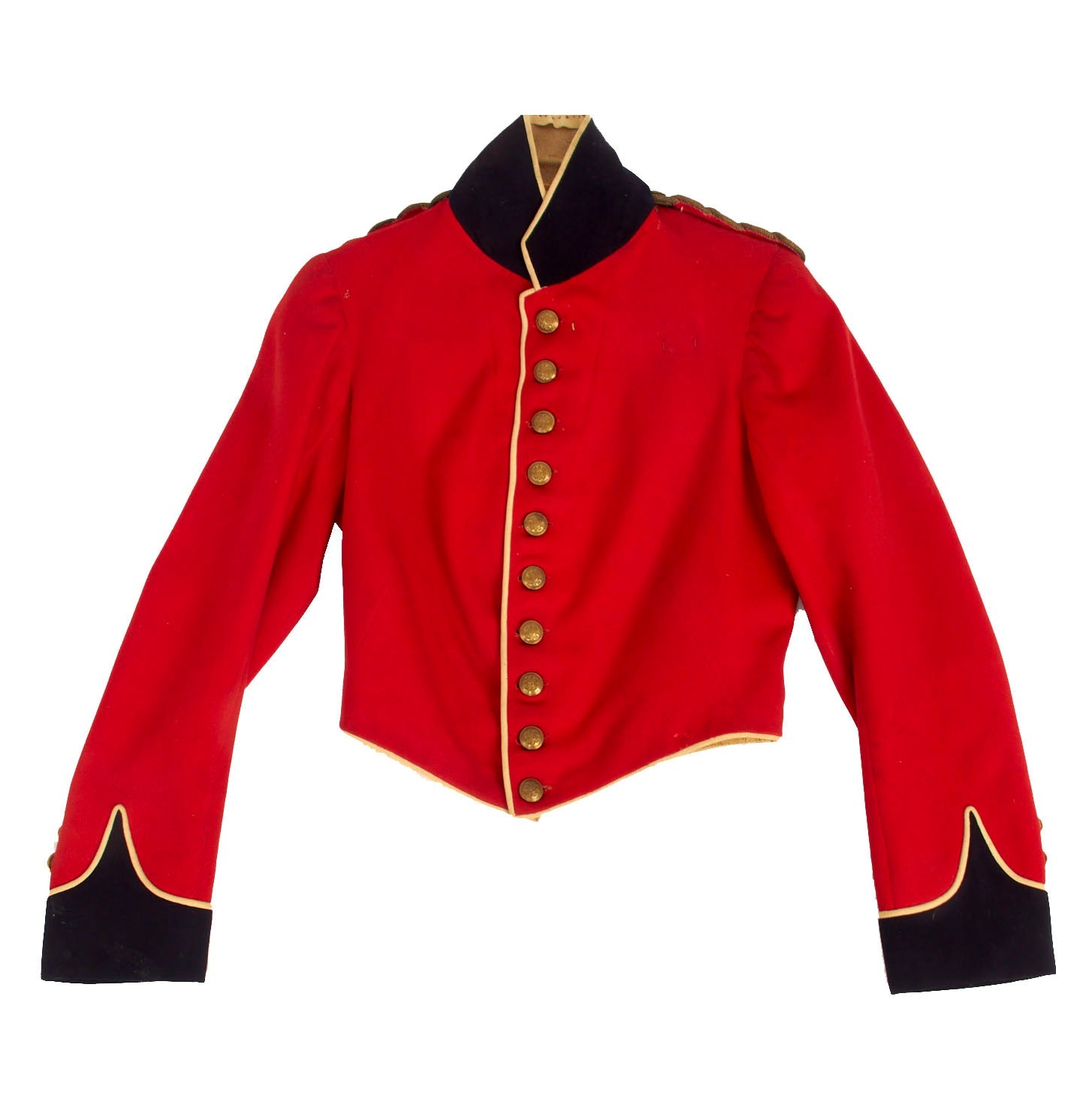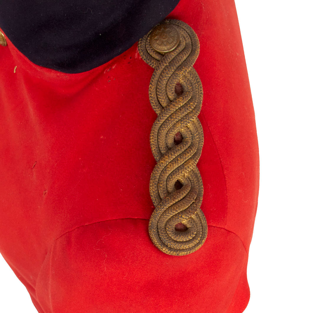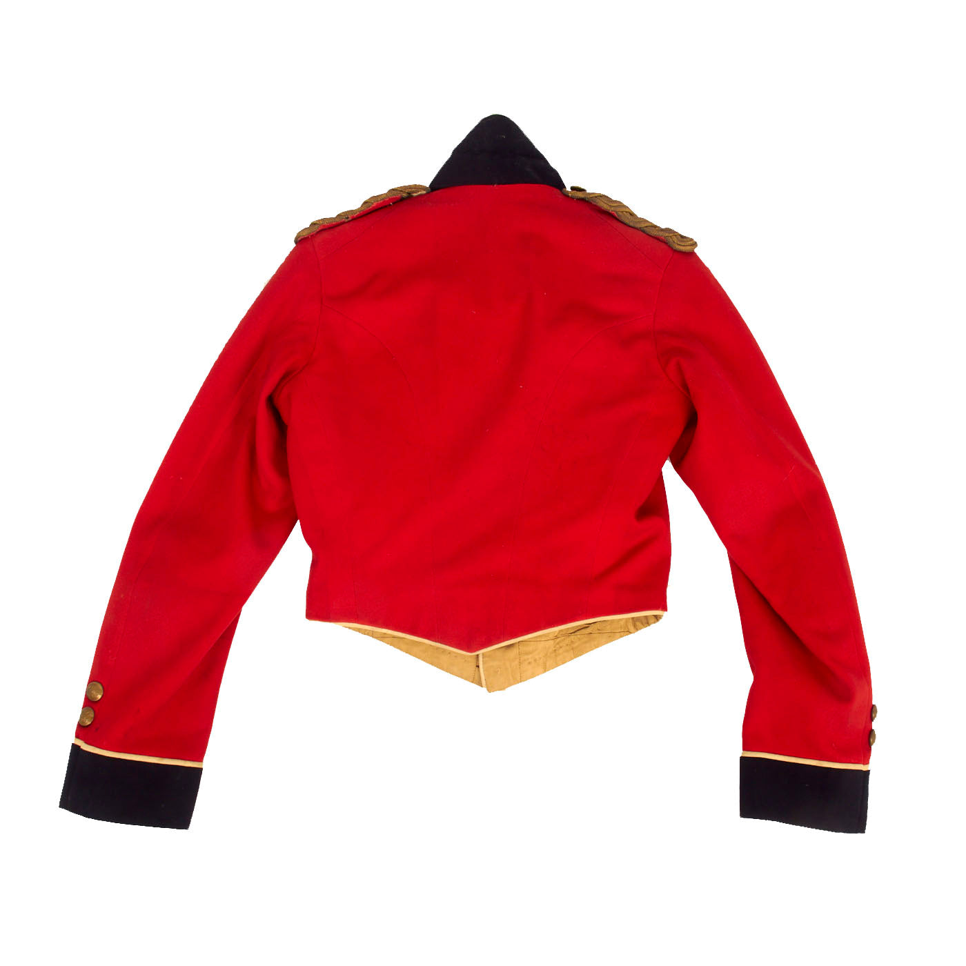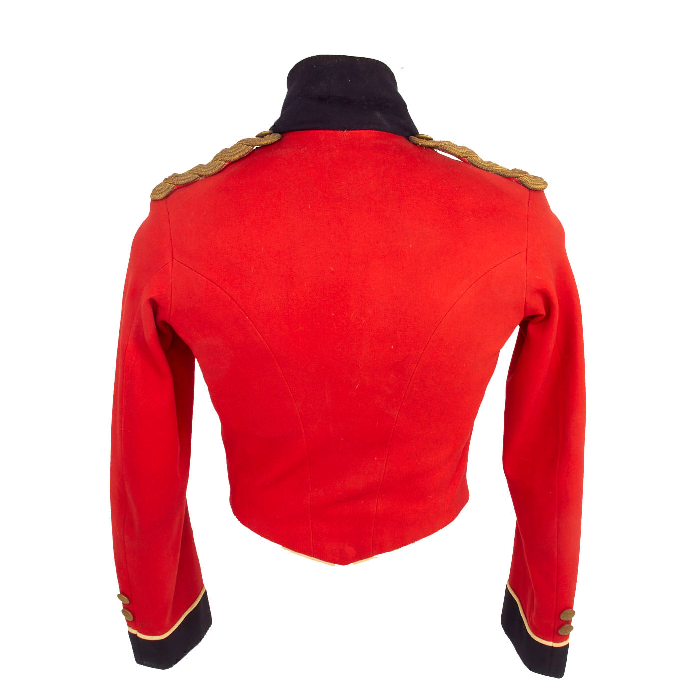 This ceremonial dress scarlet tunic once belonged to a Second Lieutenant in the famed Royal Highlanders Black Watch. This scarlet red uniform is in lovely condition with beautiful shoulder straps, not adorned with any pips for use by a Second Lieutenant. The jacket is in great condition with minor wear, as this was worn only for ceremonial purposes. There is minor staining and mothing present but nothing that subtracts from the beauty. Each button is the correct brass THE ROYAL HIGHLANDERS BLACK WATCH now tarnished to a lovely patina.