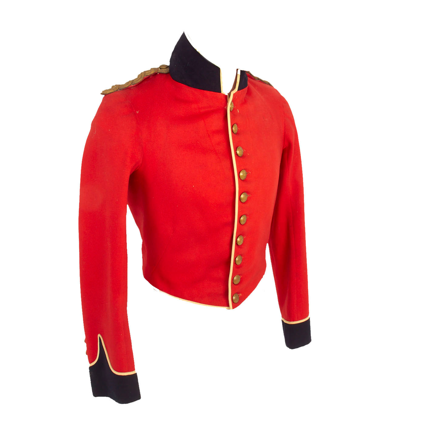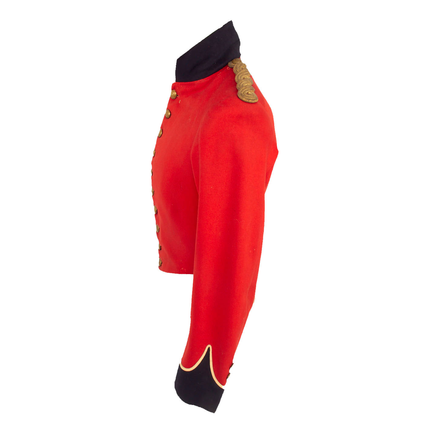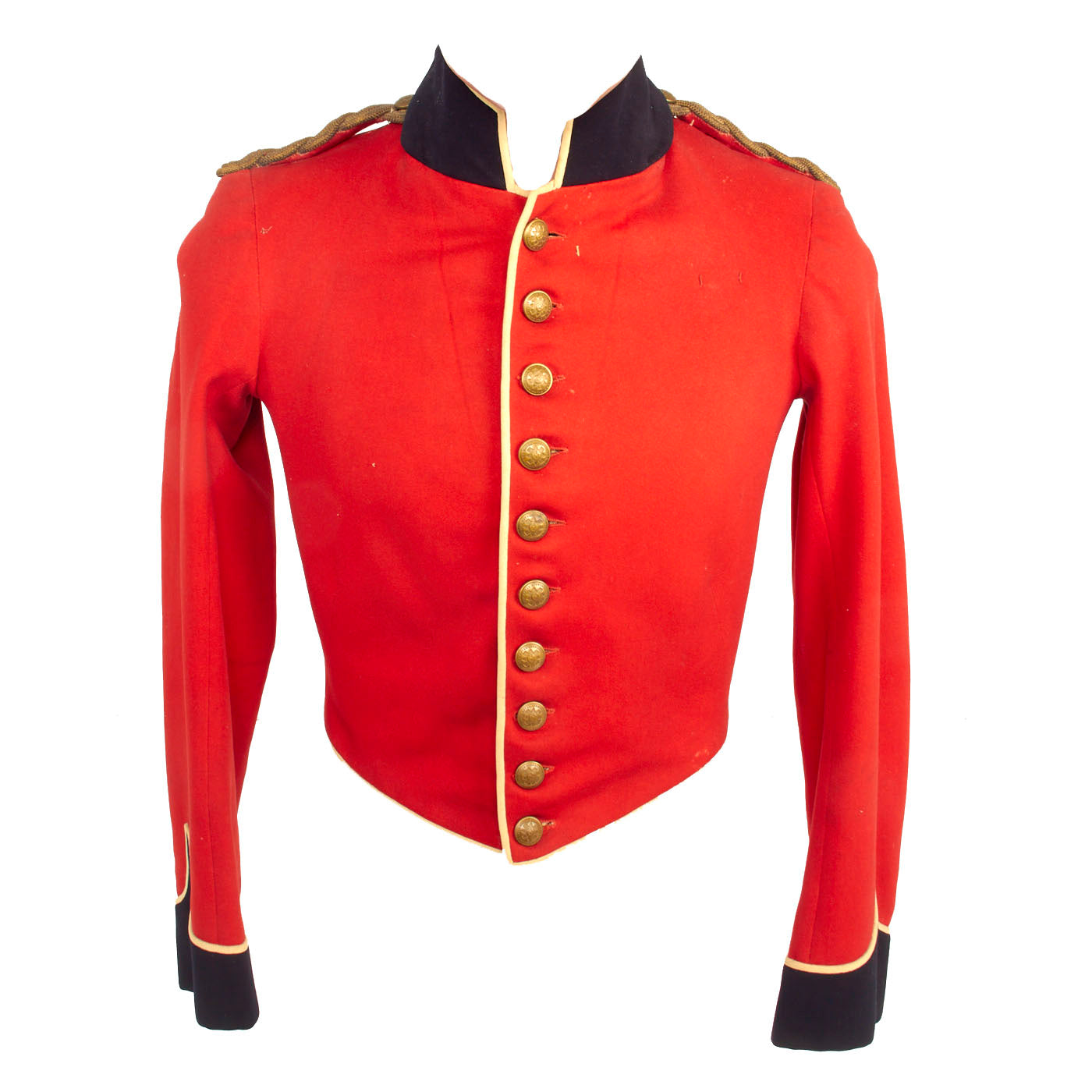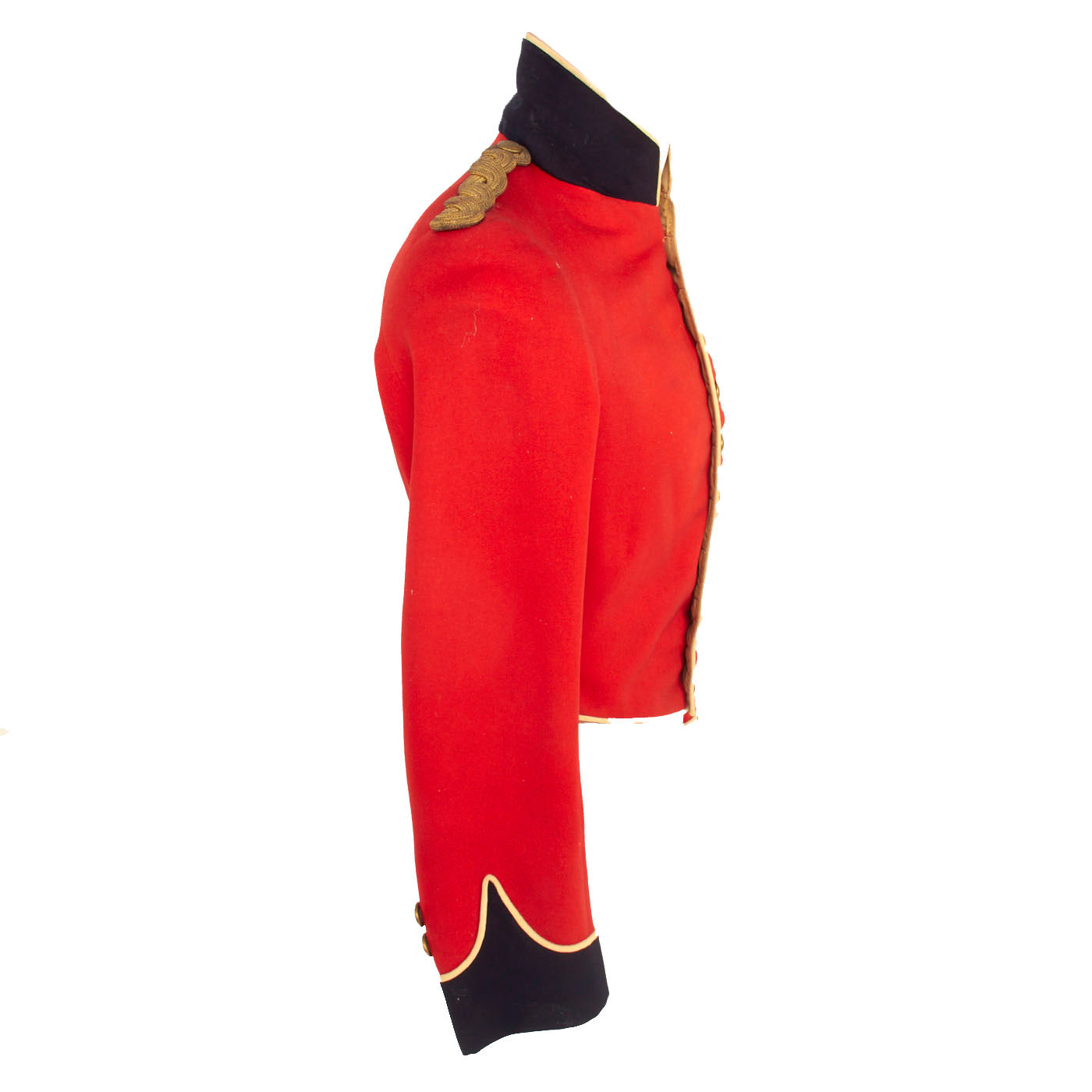 This ceremonial dress scarlet tunic once belonged to a Second Lieutenant in the famed Royal Highlanders Black Watch. This scarlet red uniform is in lovely condition with beautiful shoulder straps, not adorned with any pips for use by a Second Lieutenant. The jacket is in great condition with minor wear, as this was worn only for ceremonial purposes. There is minor staining and mothing present but nothing that subtracts from the beauty. Each button is the correct brass THE ROYAL HIGHLANDERS BLACK WATCH now tarnished to a lovely patina.