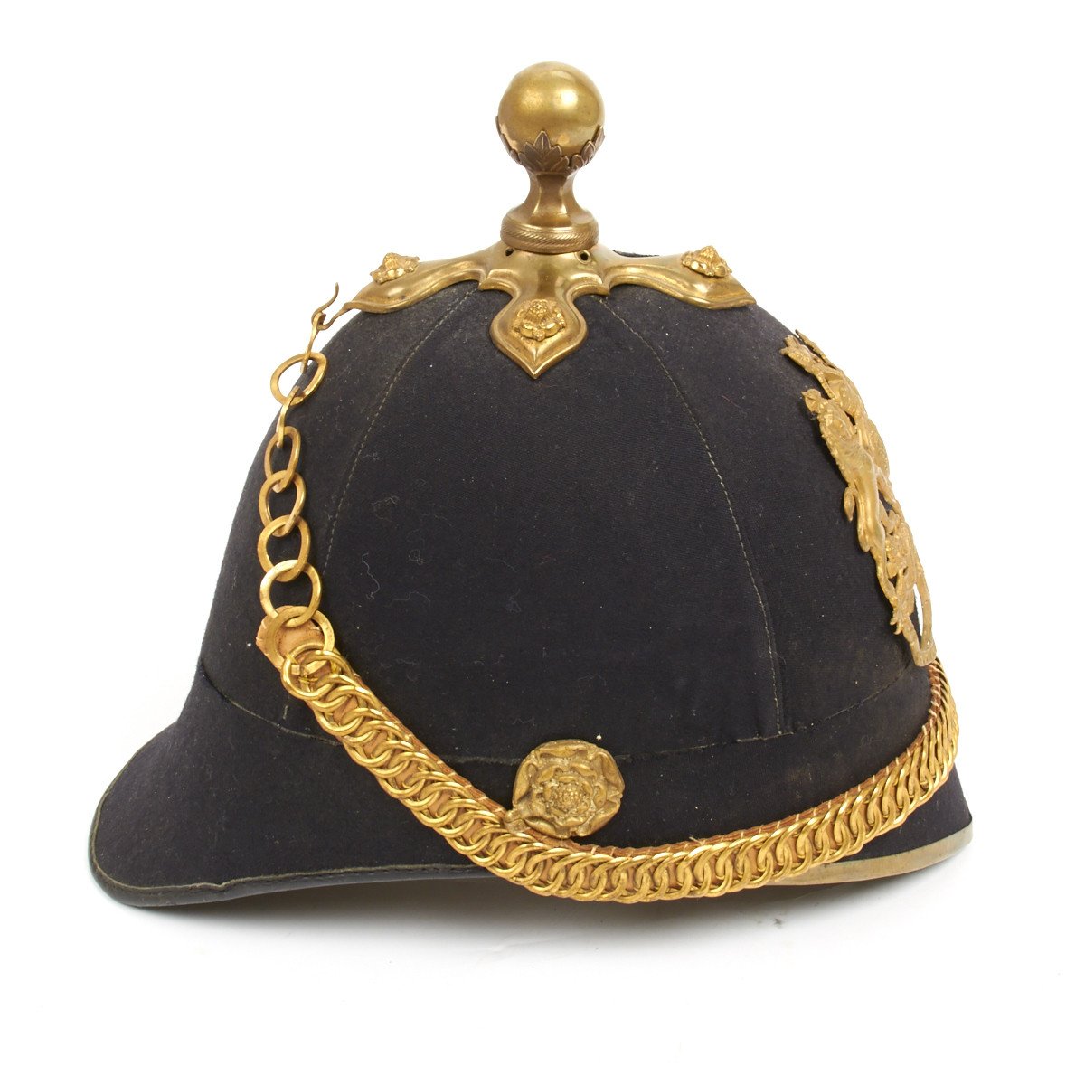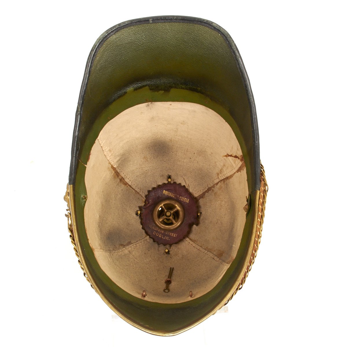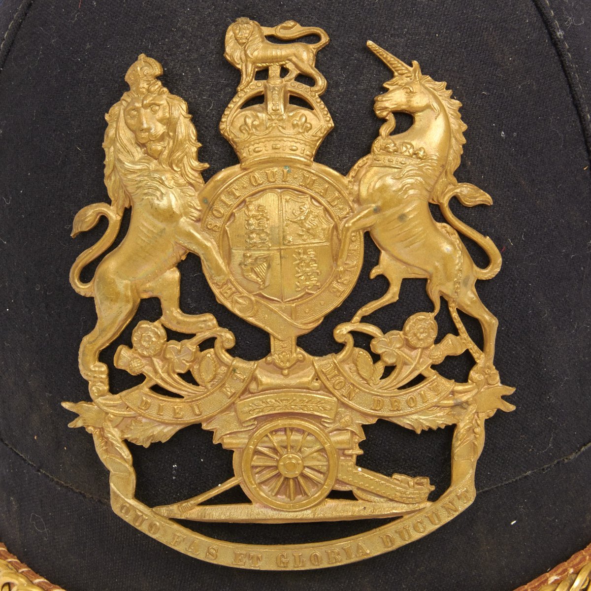 The cork body of this helmet is covered by blue cloth and all the mounts are gilded brass. The helmet plate (badge) shows the regimental cypher of Lion and Unicorn over the Royal Artillery regiment Napoleonic wheeled cannon. Leather liner sweatband now absent. Complete with with original ringed chin scales. The helmet is maker marked on the interior: