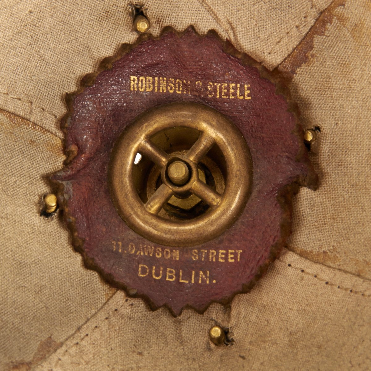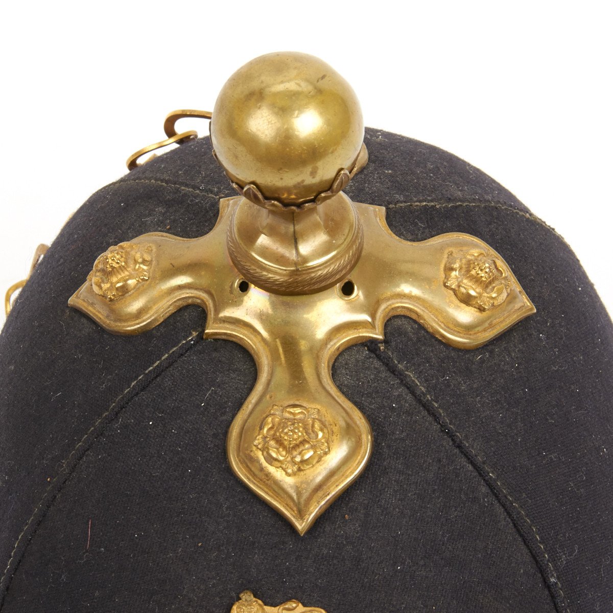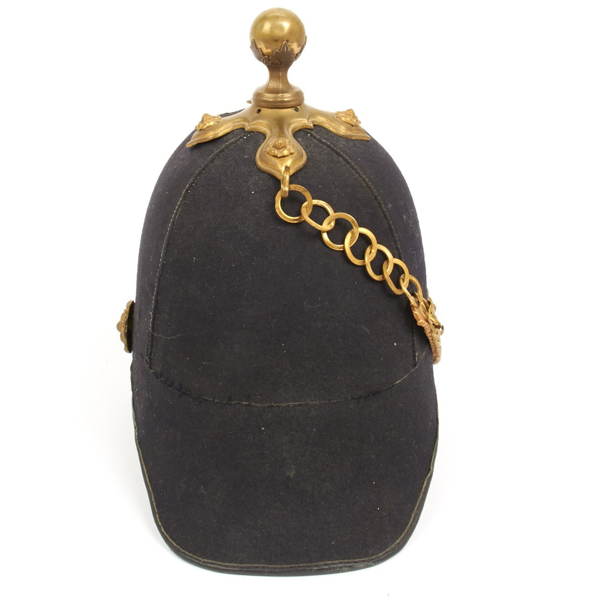 The cork body of this helmet is covered by blue cloth and all the mounts are gilded brass. The helmet plate (badge) shows the regimental cypher of Lion and Unicorn over the Royal Artillery regiment Napoleonic wheeled cannon. Leather liner sweatband now absent. Complete with with original ringed chin scales. The helmet is maker marked on the interior: