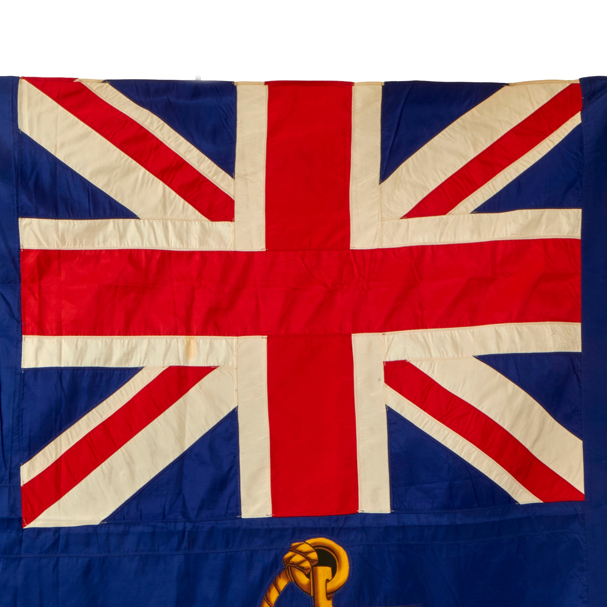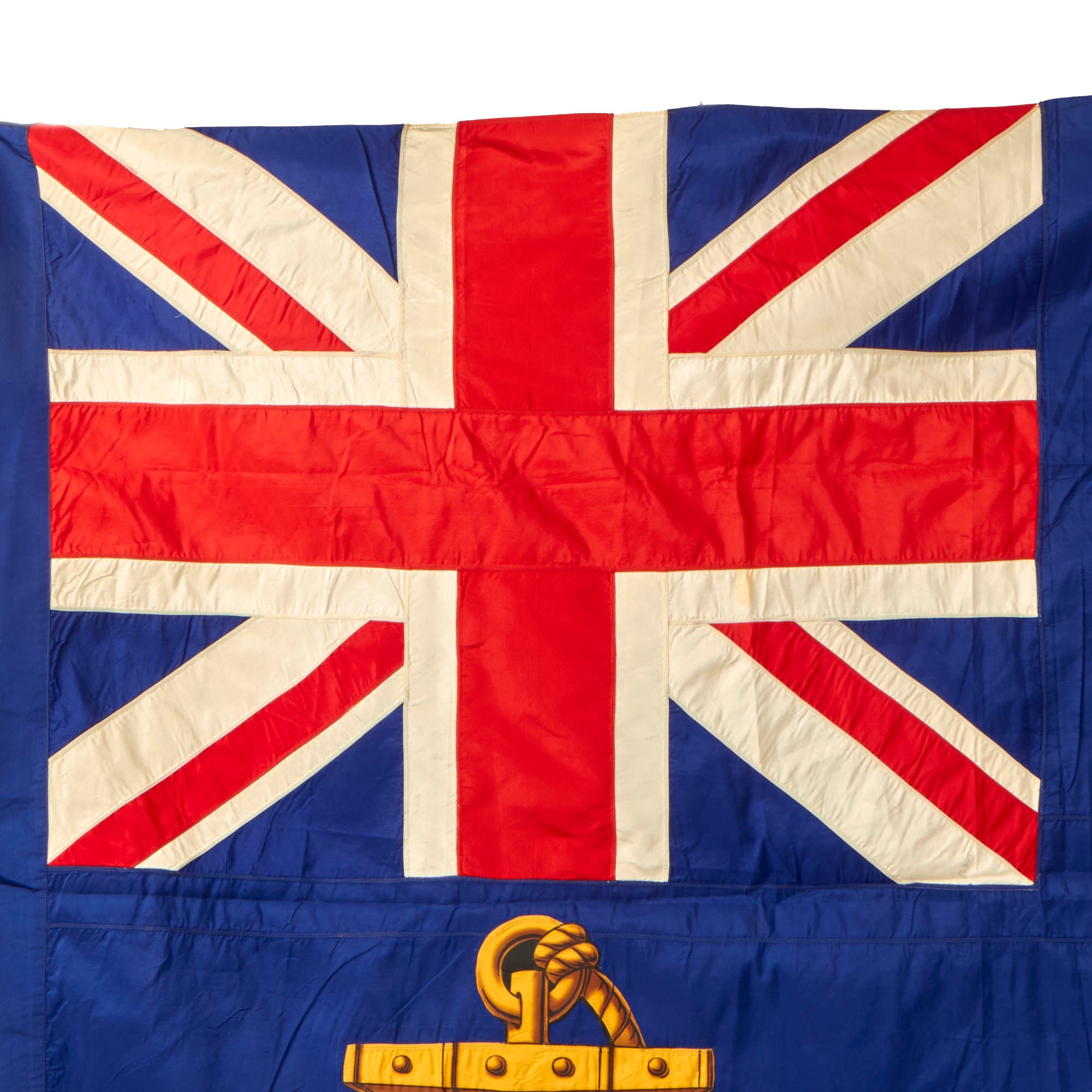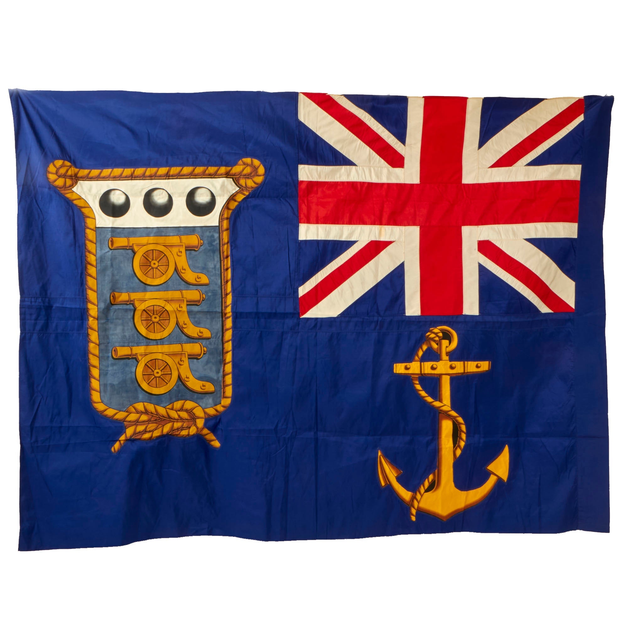 This phenomenal reference material helps us date the flag between 1891 and 1922, but we believe it to be later on that scale due to the condition. We assume it was made at the very end and then put into long storage, as they were no longer used. The flag has a header for affixation to a pole. The painted section of the flag (the three cannons and cannonballs within a roped shield) is rather stiff from having been painted, so the flag does not fold up normally. The paint does not glow under a black light which is consistent with its age, and the stitching is early machine applied. The flag is multi-piece constructed of silk, with the shield and anchor being separate sewn-on pieces. The Union Jack is also multi-piece with each stripe being distinct. We believe the flag to be made of silk, and was meticulously preserved for decades. This flag would look best displayed in a frame!