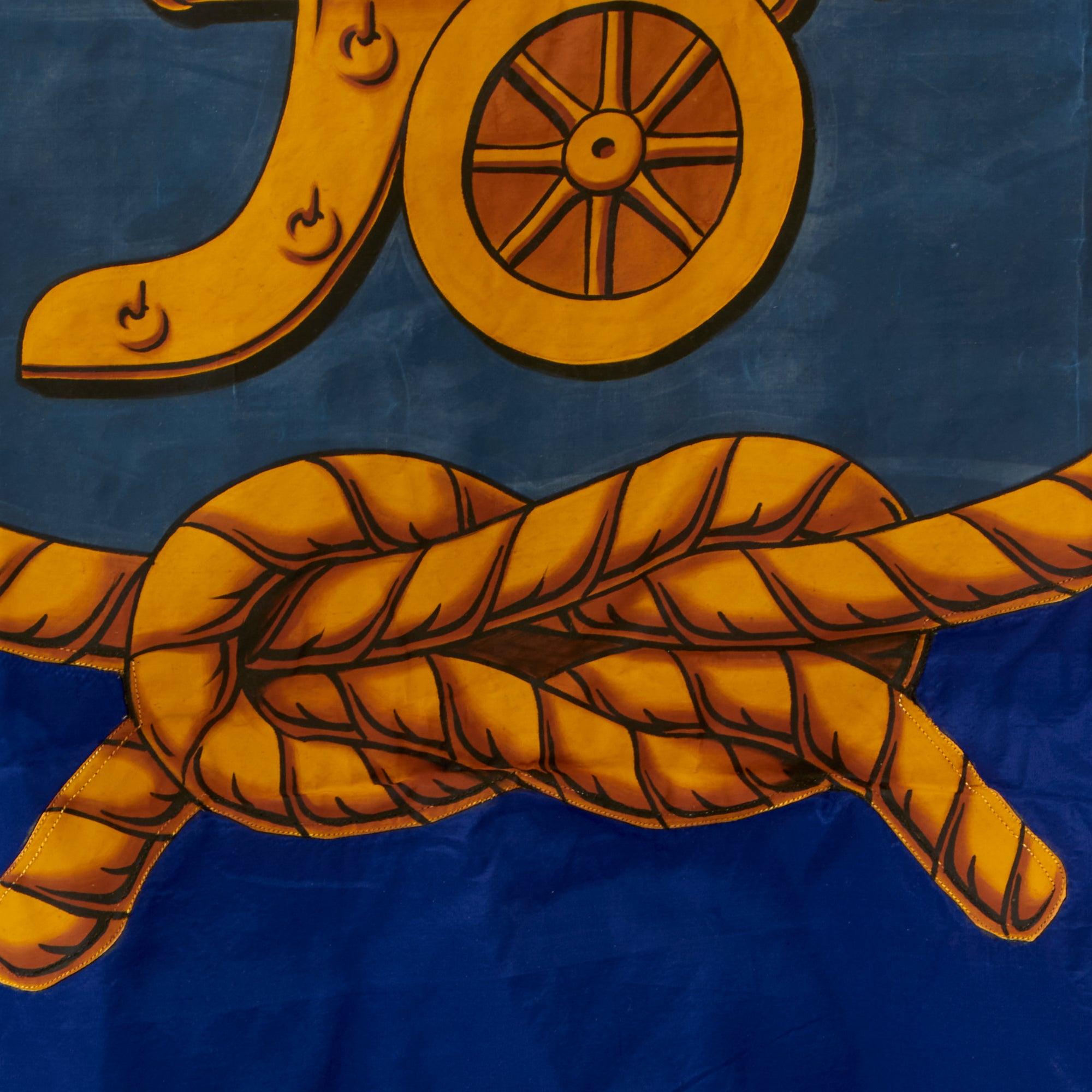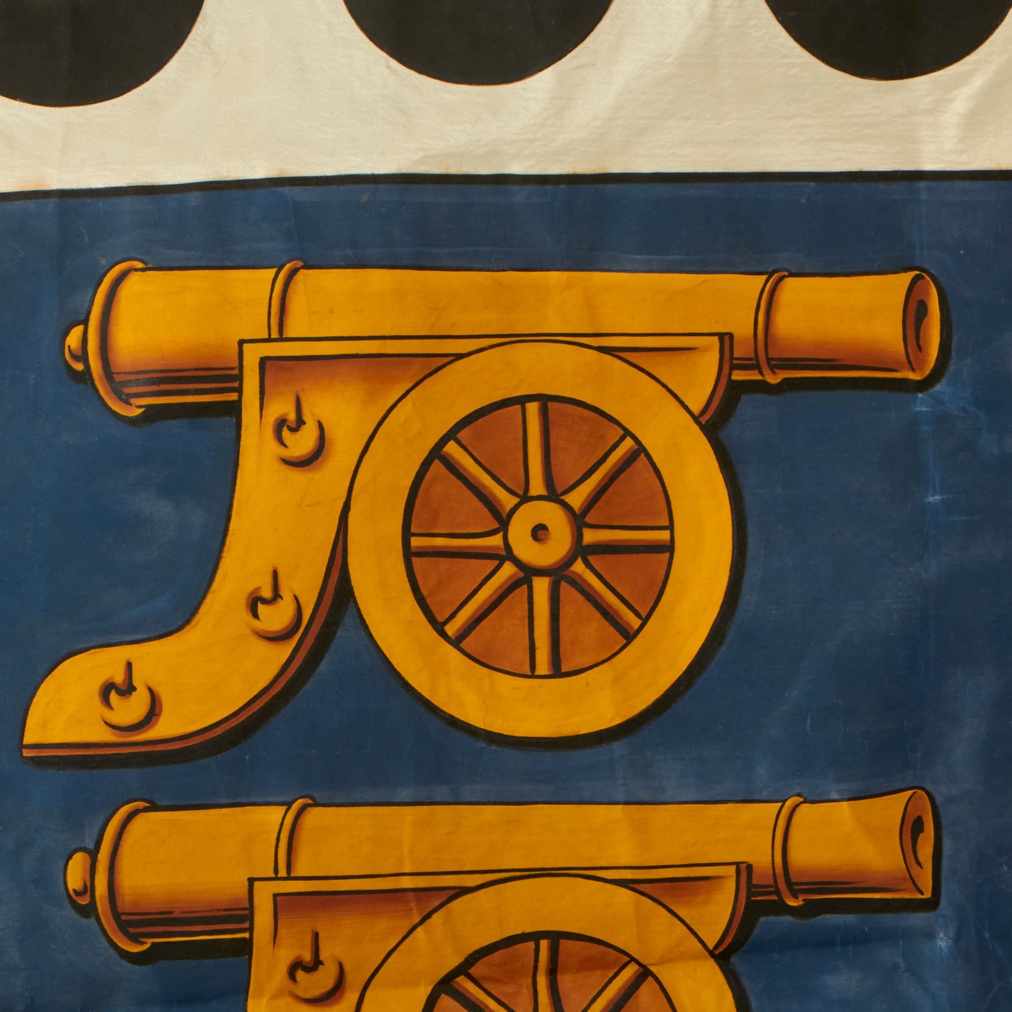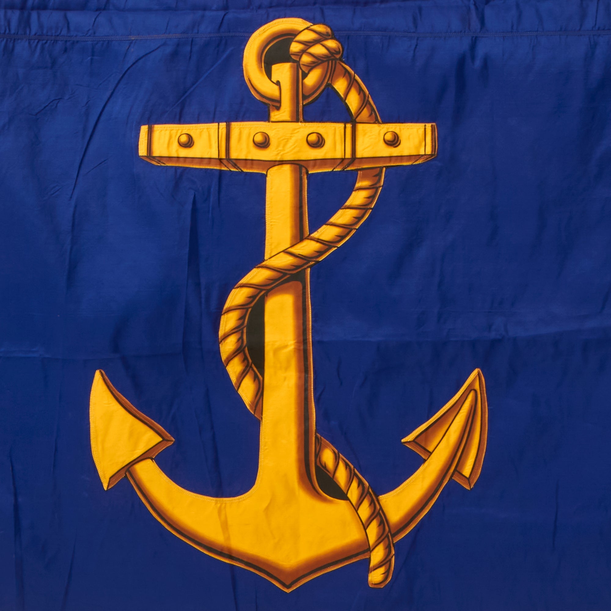 This phenomenal reference material helps us date the flag between 1891 and 1922, but we believe it to be later on that scale due to the condition. We assume it was made at the very end and then put into long storage, as they were no longer used. The flag has a header for affixation to a pole. The painted section of the flag (the three cannons and cannonballs within a roped shield) is rather stiff from having been painted, so the flag does not fold up normally. The paint does not glow under a black light which is consistent with its age, and the stitching is early machine applied. The flag is multi-piece constructed of silk, with the shield and anchor being separate sewn-on pieces. The Union Jack is also multi-piece with each stripe being distinct. We believe the flag to be made of silk, and was meticulously preserved for decades. This flag would look best displayed in a frame!