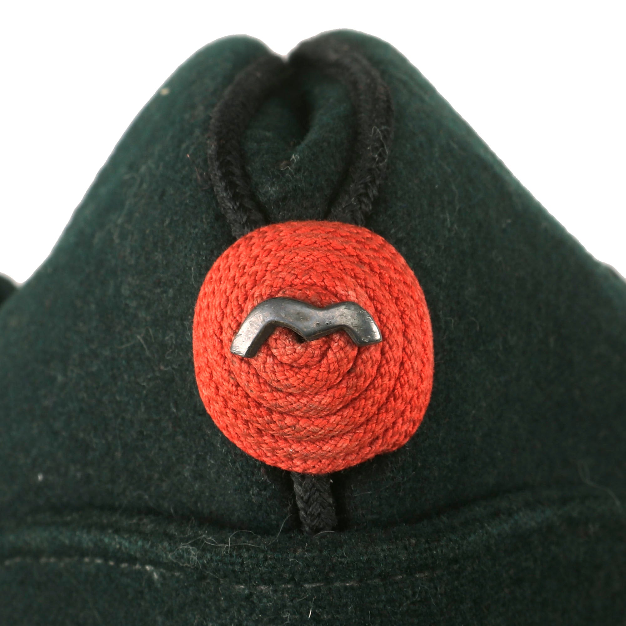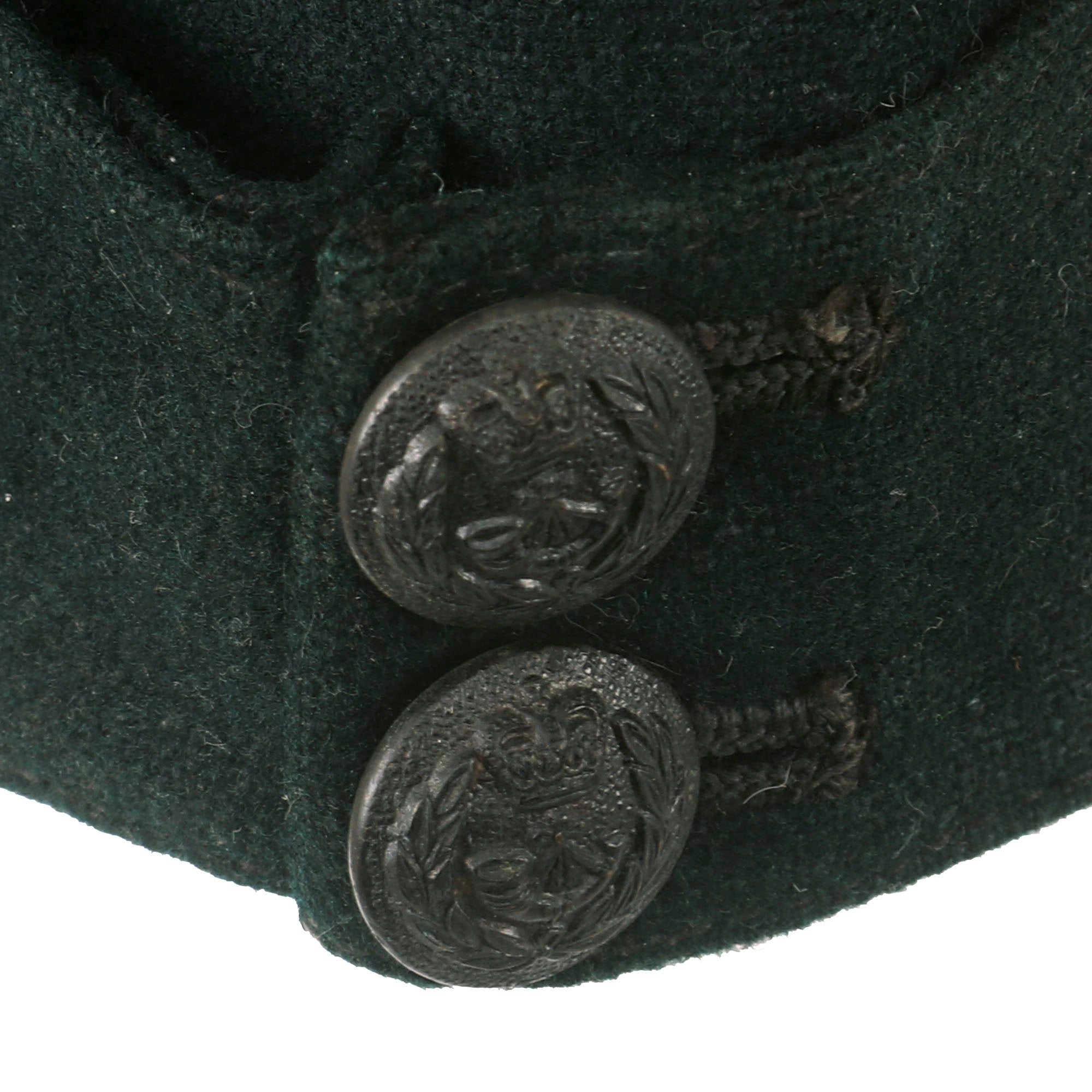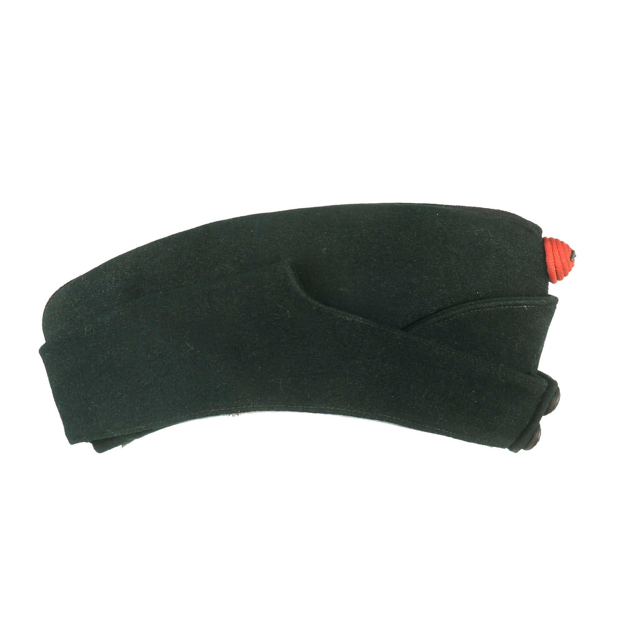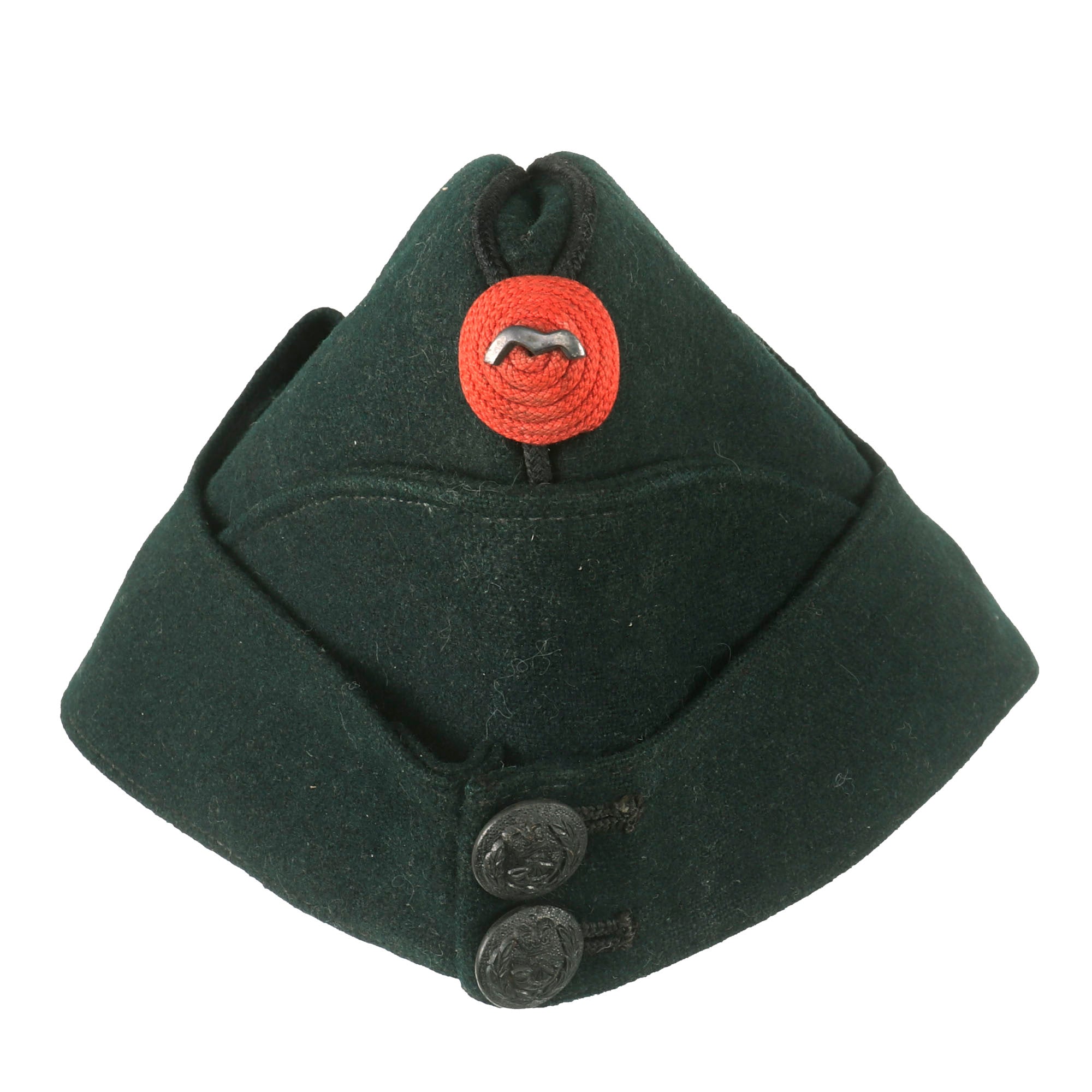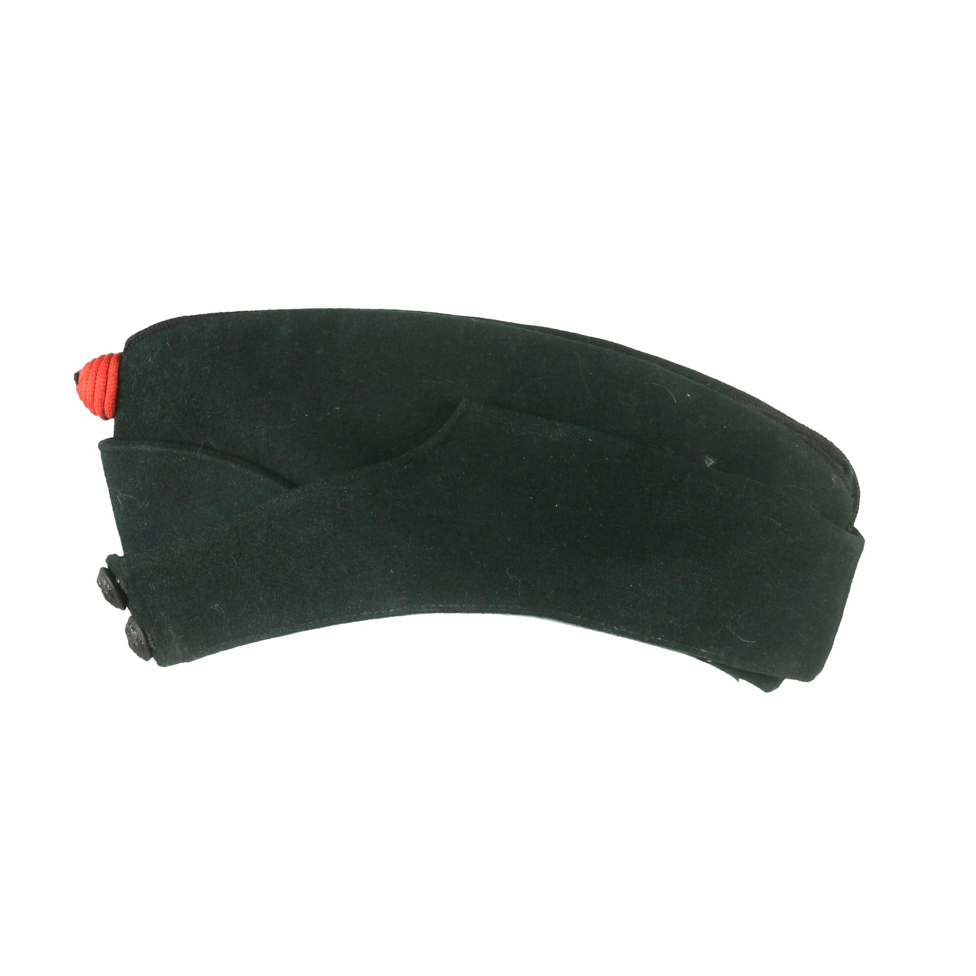Original Item. Only One Available. This is an interesting Pre-WWII British Glengarry style overseas cap with King’s Royal Rifle Corps buttons on the front. The cap is in dark green and has a small red device affixed to the front.