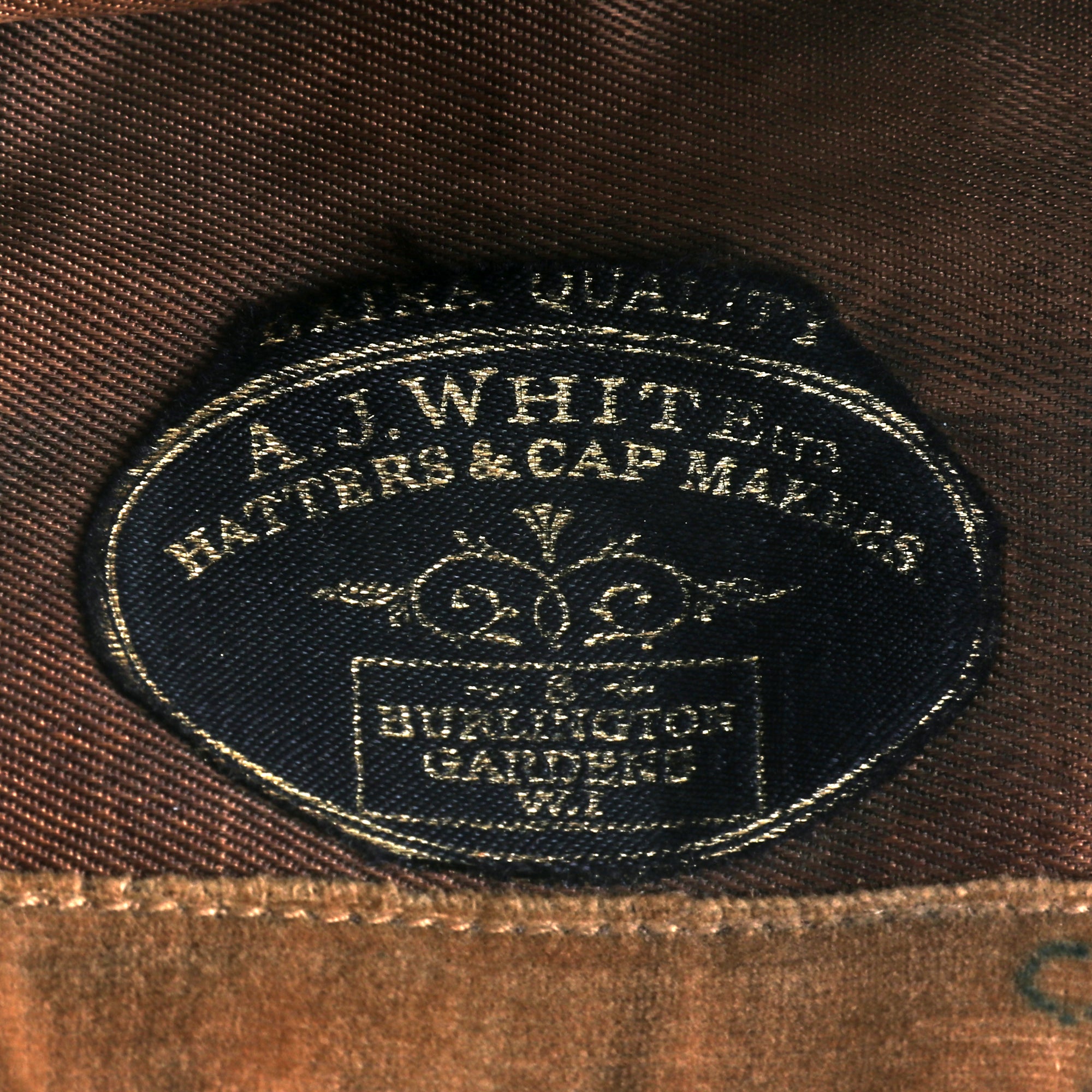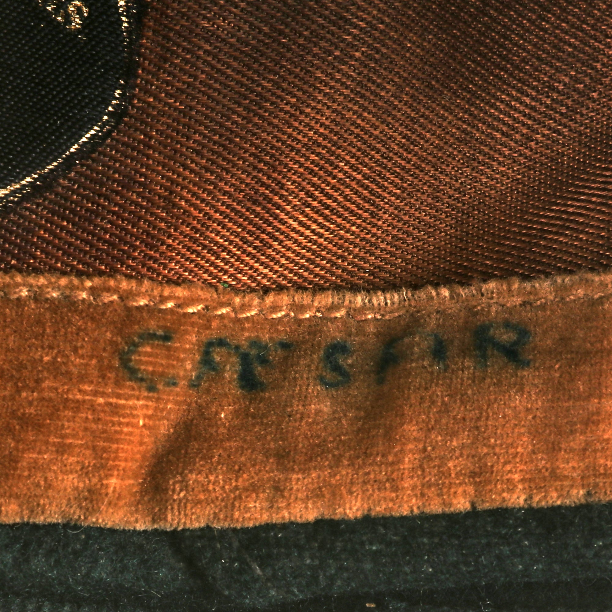 The cap has a great velvet sweatband with a name written on it, but it’s difficult to read. There is a clear maker’s tag reading: