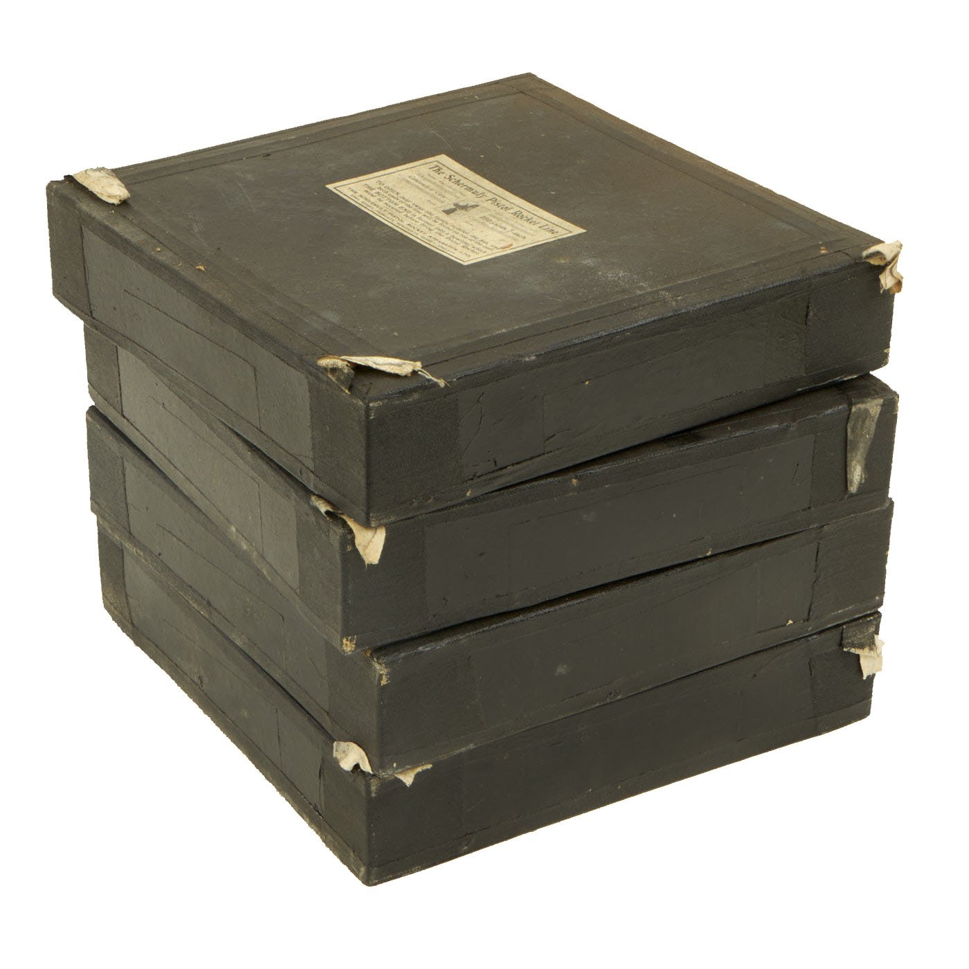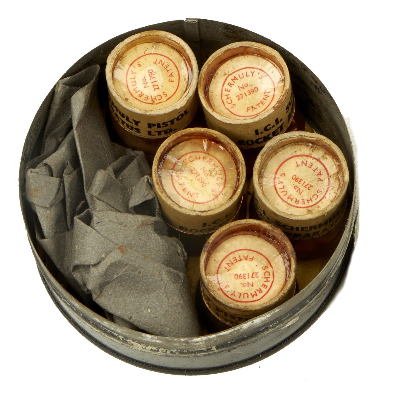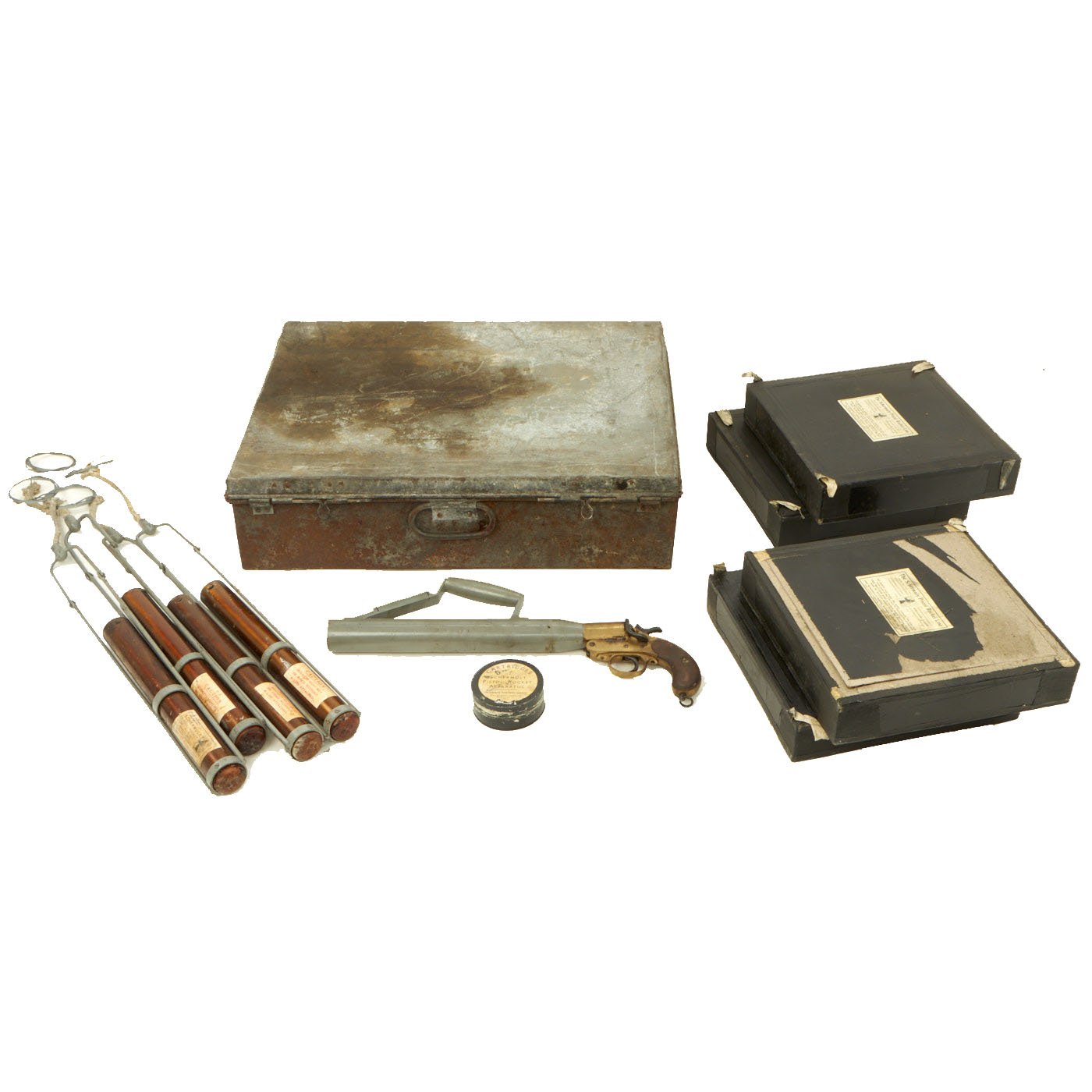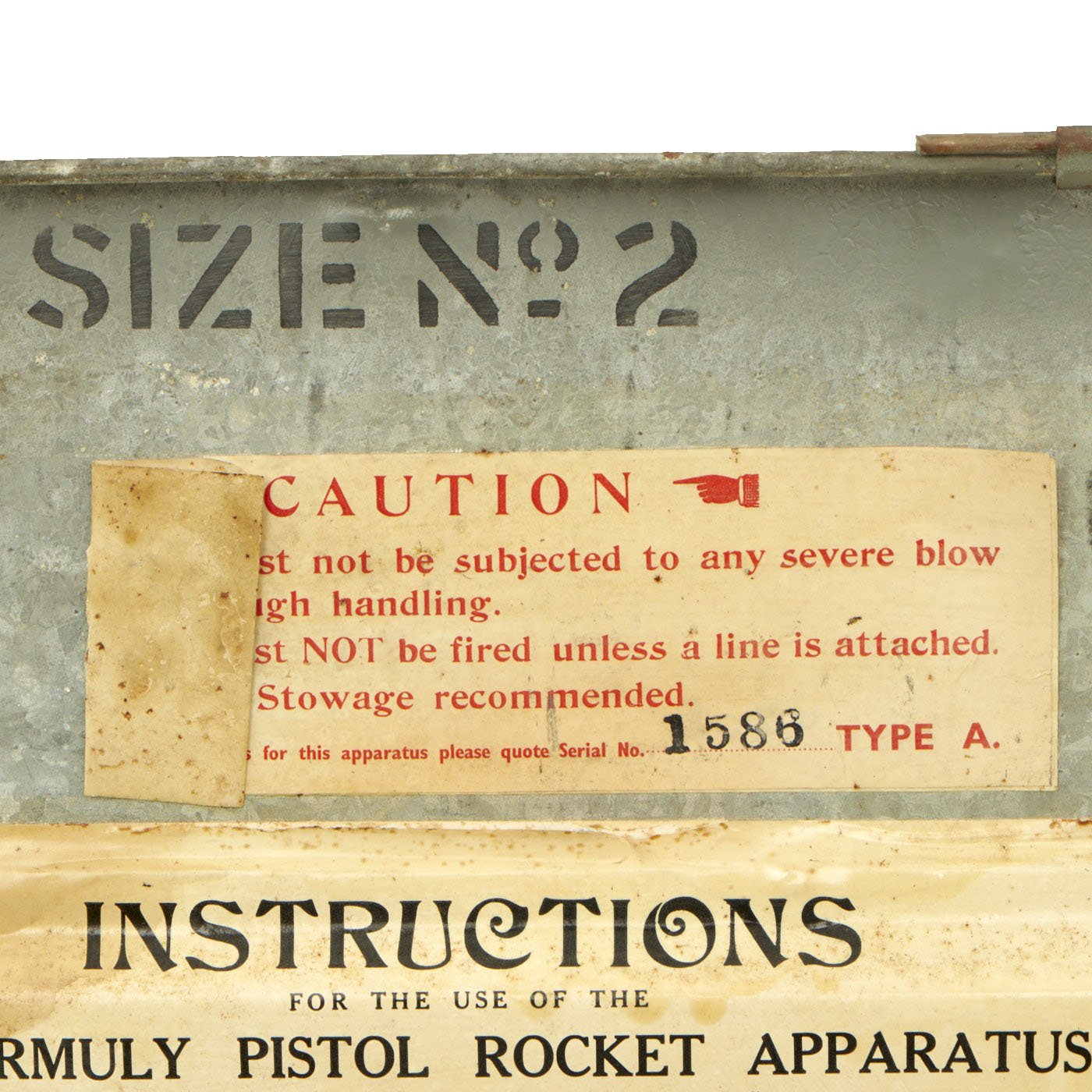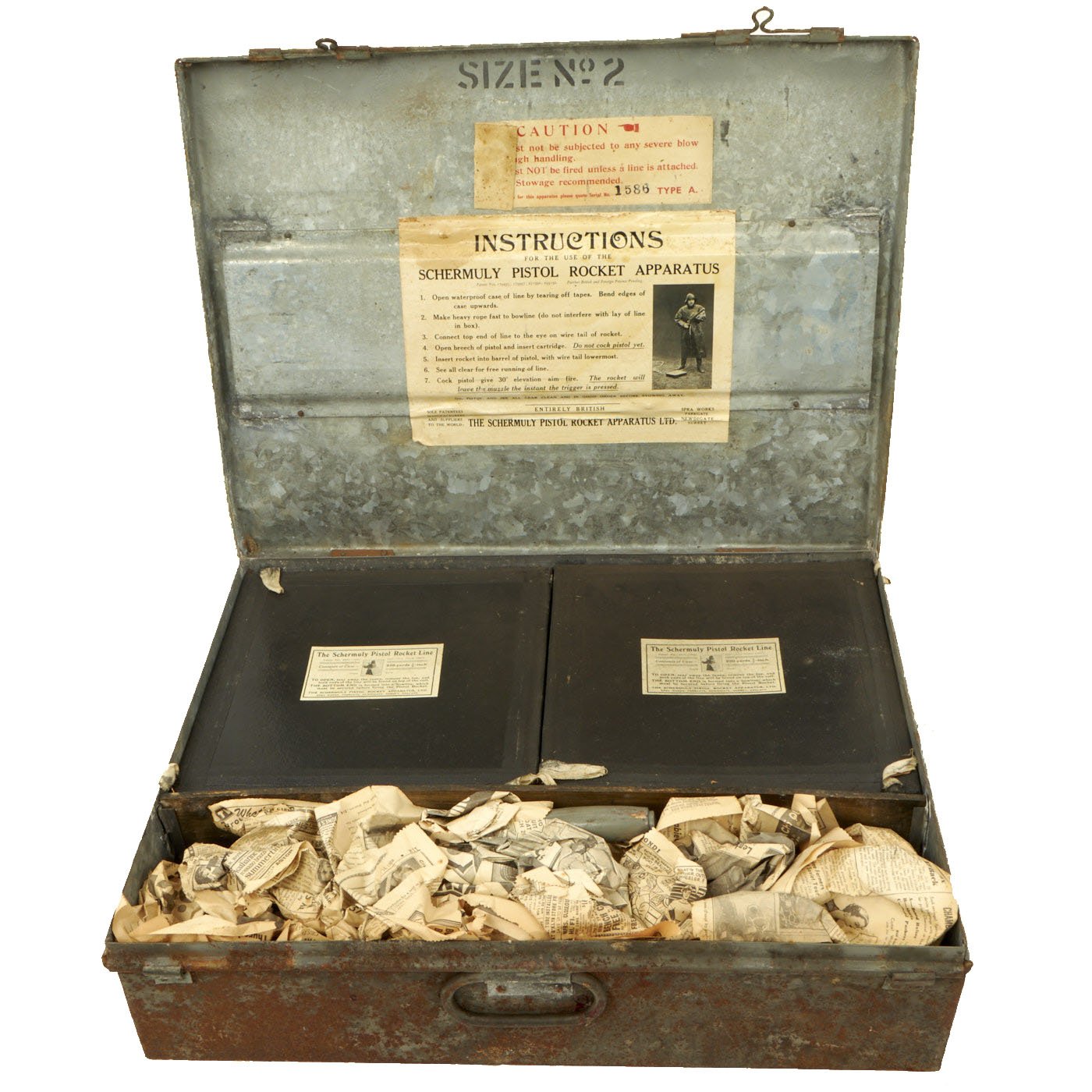 Also included is the tin case which measures approximately 19" x 7" x 25" which is complete with 4 unopened boxes of 250 1/2 inch line, 4 deactivated rockets, a tin of 5 deactivated cartridges, original instruction label and more! This is a set that was issued but never used. Found in a warehouse on the Northeastern Seaboard of the United States where it has laid undisturbed for over 100 years!