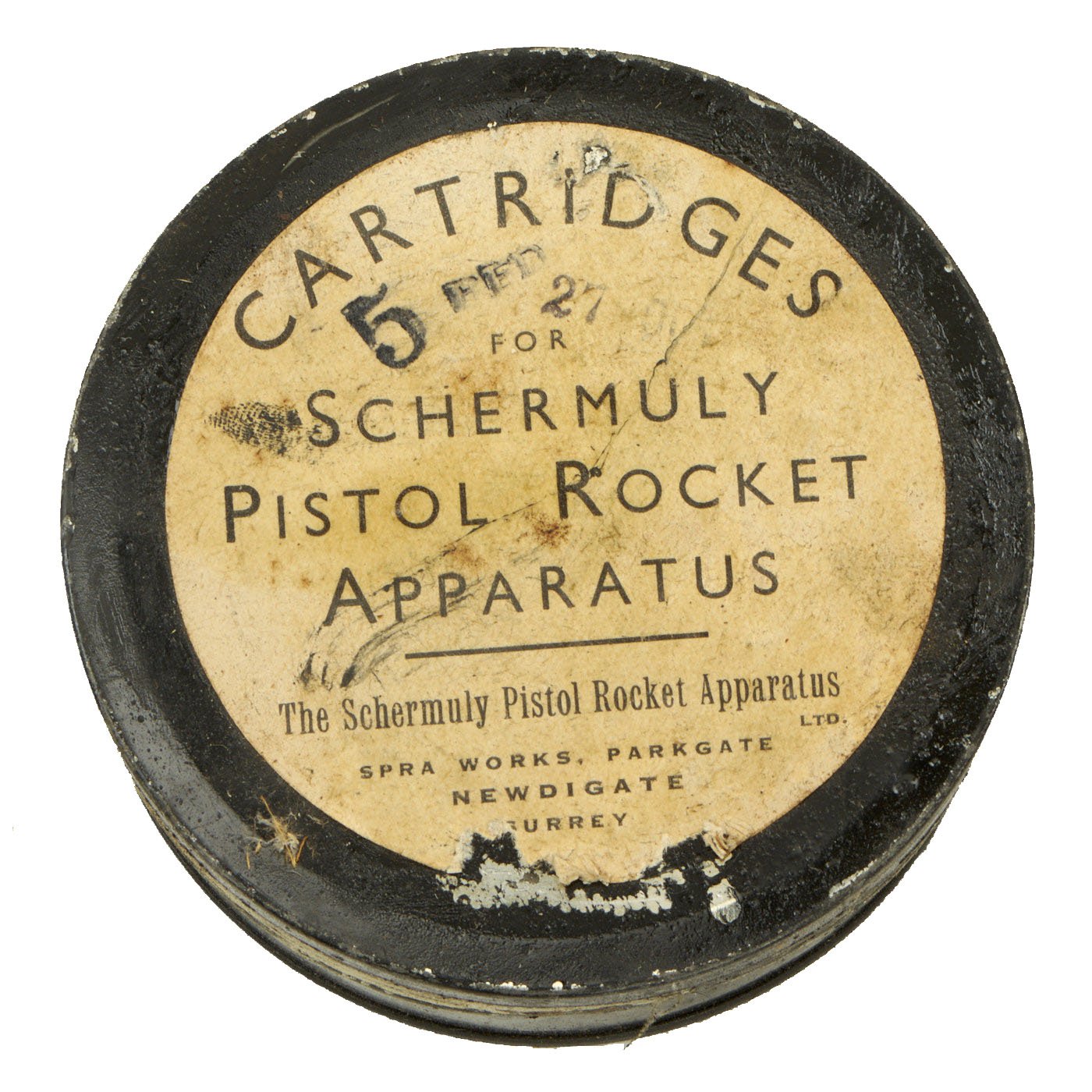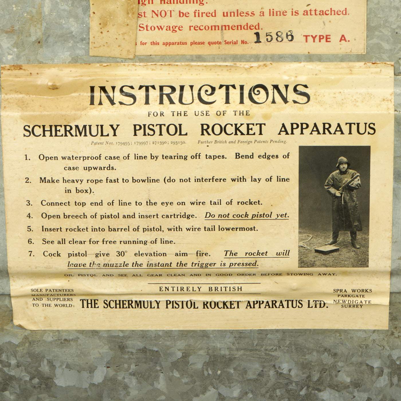 Original Items: Only one set available. William Schermuly 1857-1929 was one of fathers of modern rocketry. He had served aboard vessels at sea and knew of how many lives were lost each year due to shipwrecks. He invented several different line throwing devices, some of which were used in WWI for such things as throwing telephone lines from trench to trench while under fire. But, the British Admiralty still didn’t see a need for his line throwers. Finally, he came up with a design that was small, easily aimed and fired, accurate and simple to use – the Schermuly Rocket Pistol Apparatus. In 1929, just 19 days before he died, the Admiralty made it compulsory for all vessels over 500 tons to carry line throwers. It was so successful that in 1938, a new act made it a requirement for all ships over 80 tons or 50 feet in length.