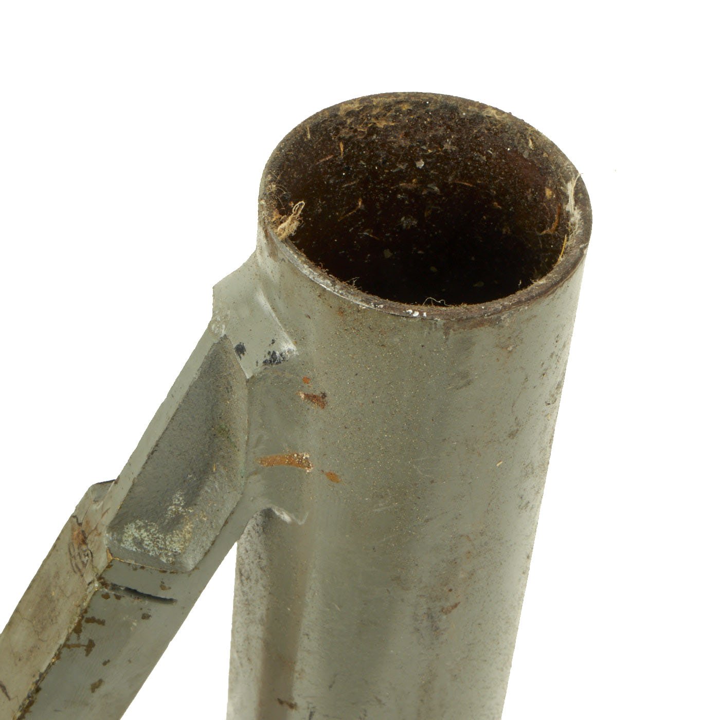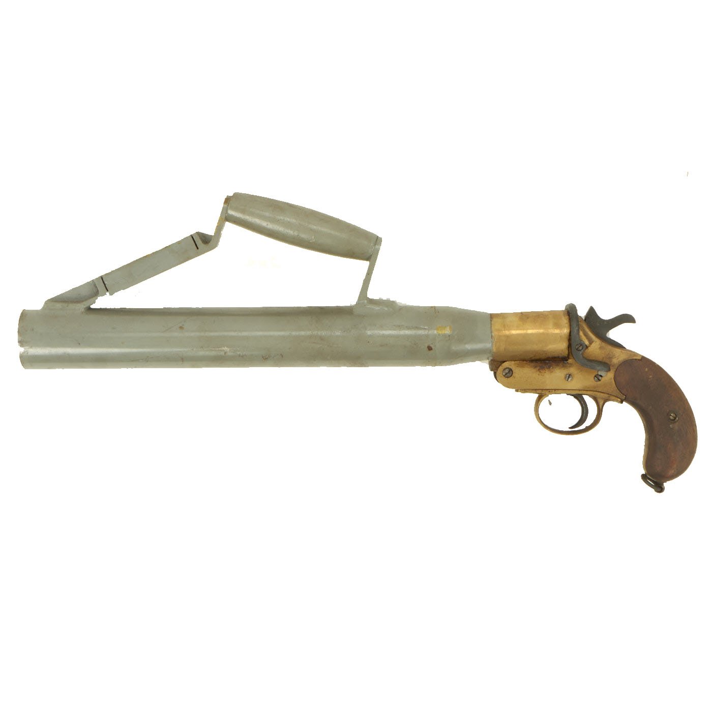 Dating from the 1920s this Schermuly Line Throwing Rocket Pistol has a brass frame and chamber, while the rocket tube, or barrel, is steel. It has mahogany grips and a ribbed Bakelite secondary handle, and there are British proof marks on the chamber and frame. It is also marked with serial number 60510 on the barrel and frame, and has ;the SCHERMULY'S PATENT information on the left side of the frame. Overall, the pistol is in very good condition.