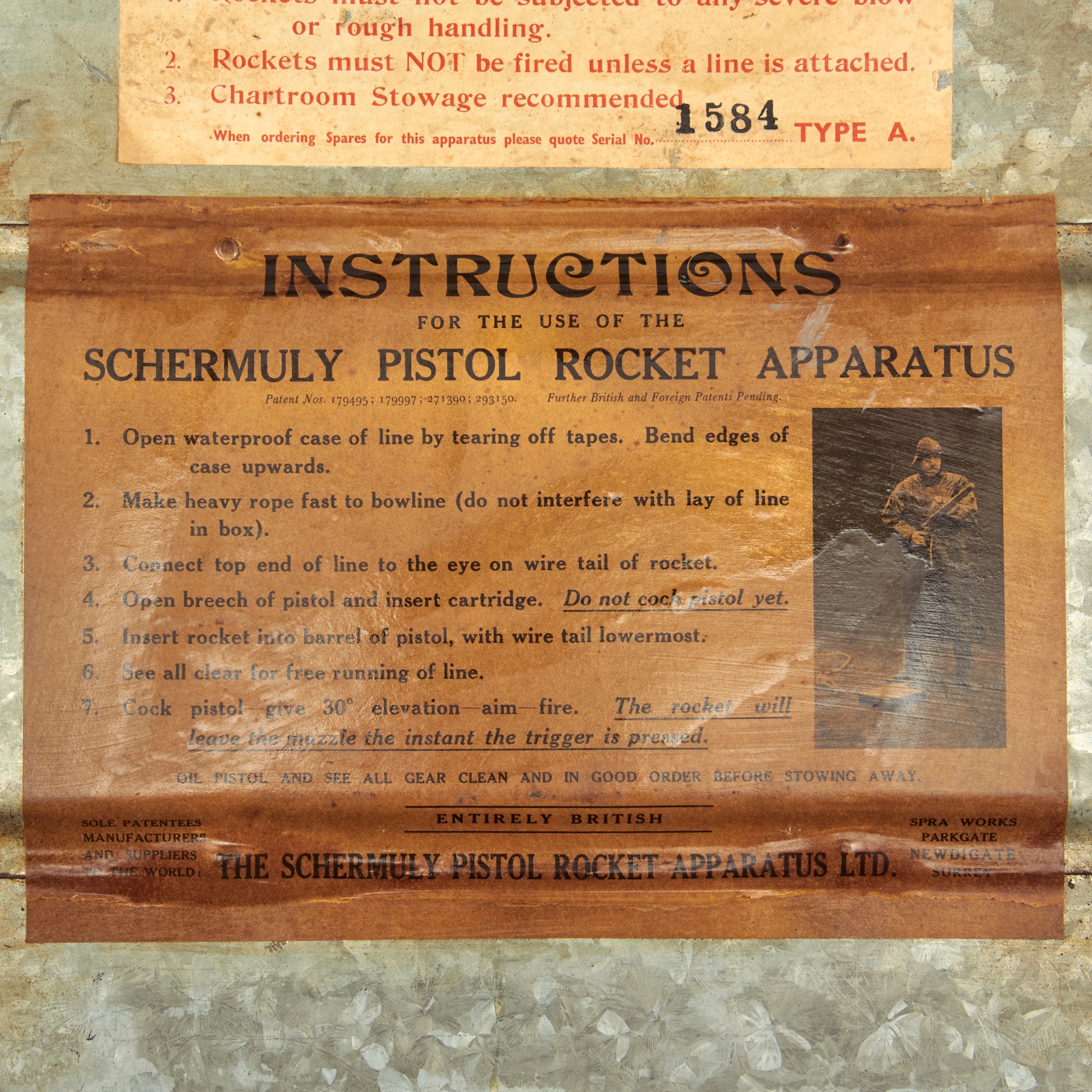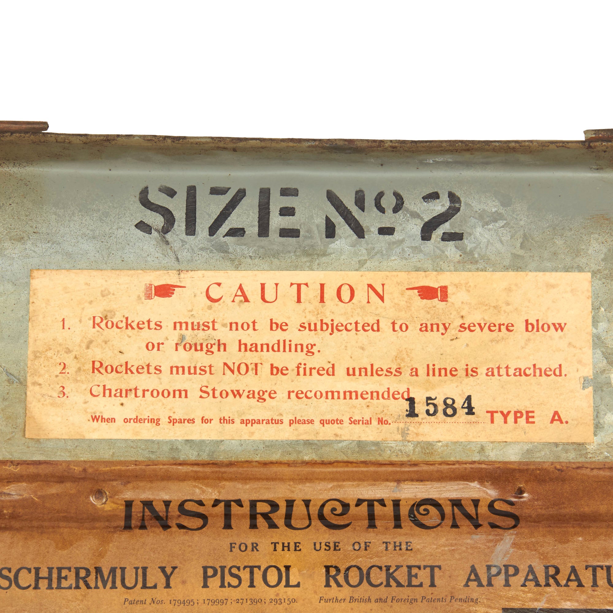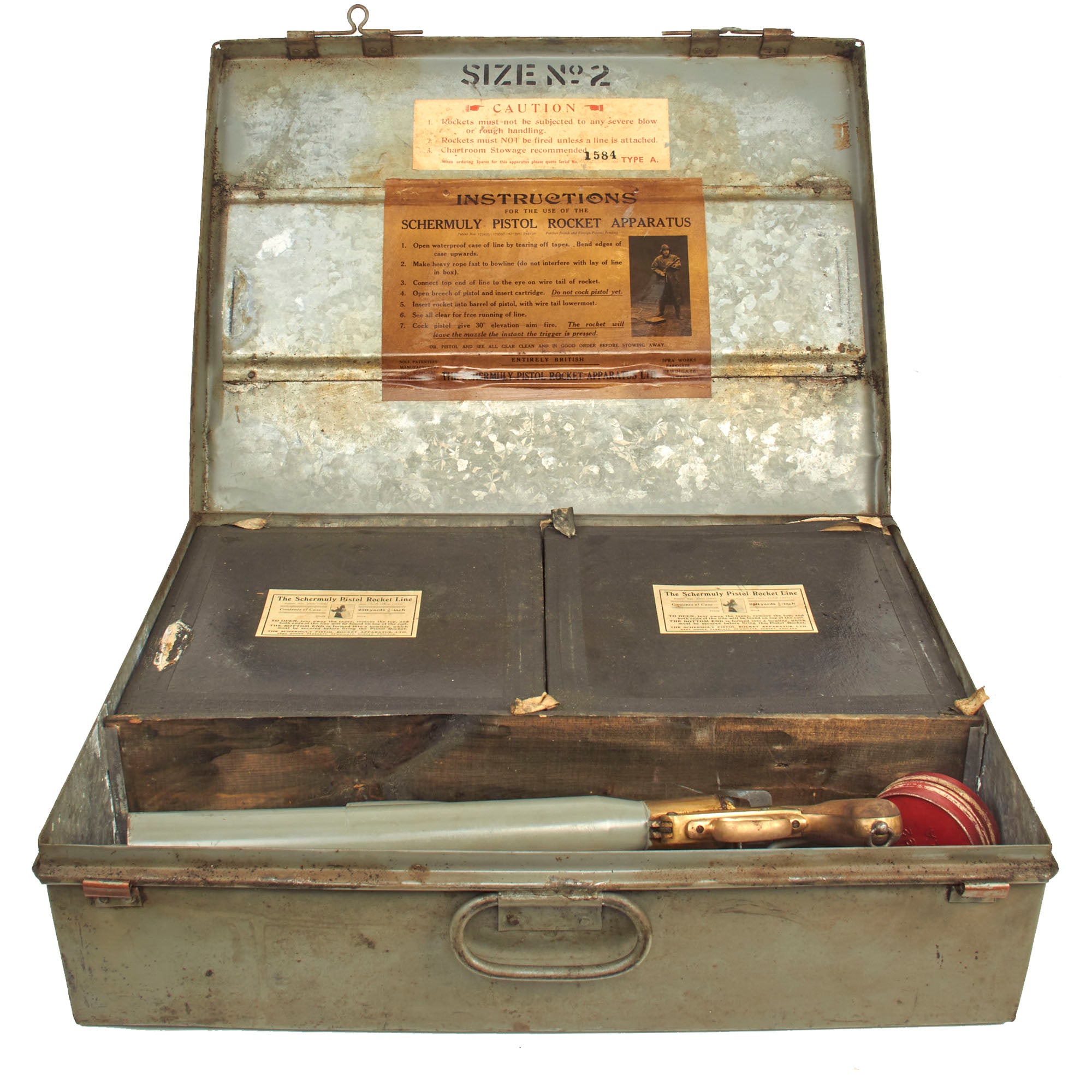Also included is the tin case which measures approximately 19" x 7" x 25" which is complete with 4 unopened boxes of 250 1/2 inch line, 4 deactivated rockets, original instruction label and more! It is marked as a SIZE 2, and a label indicates that the set is serial number 1584 TYPE A. This is a set that was issued but never used. Found in a warehouse on the Northeastern Seaboard of the United States where it has laid undisturbed for over 100 years!