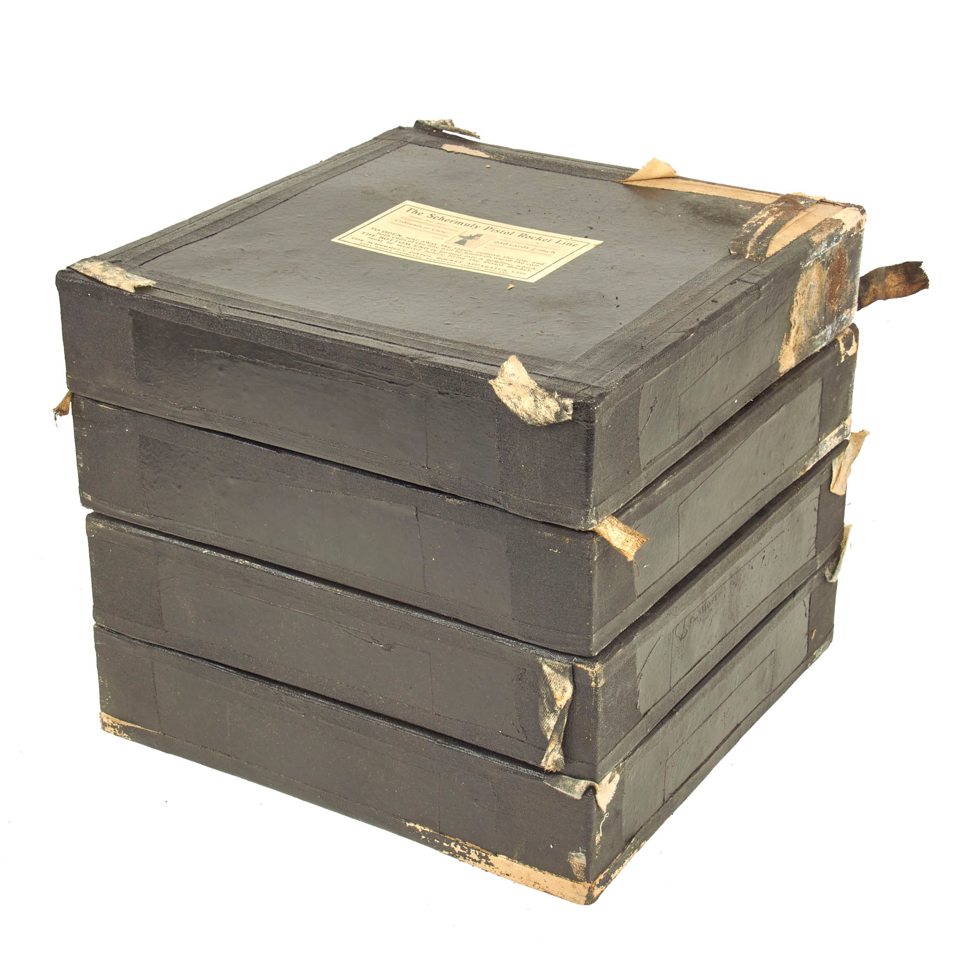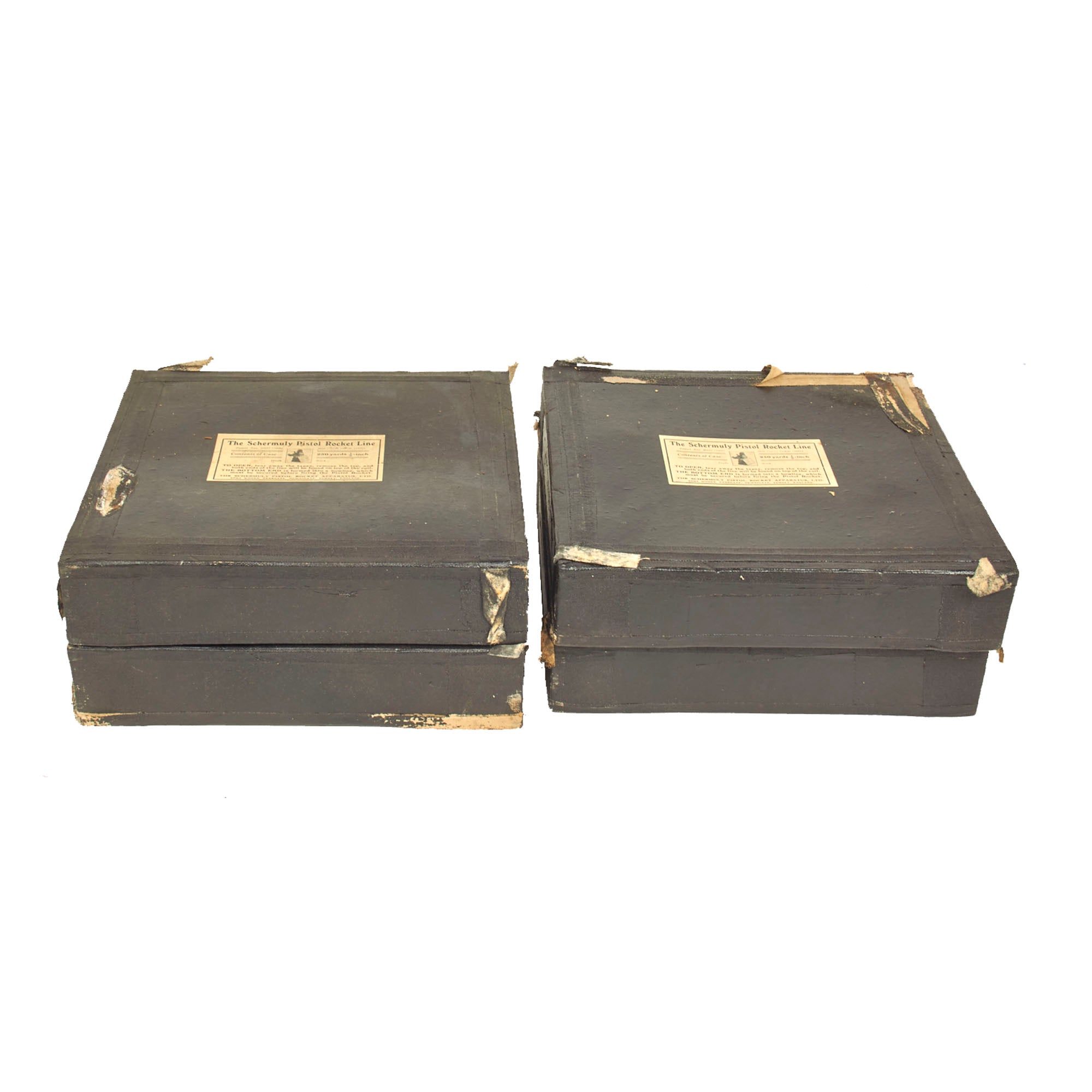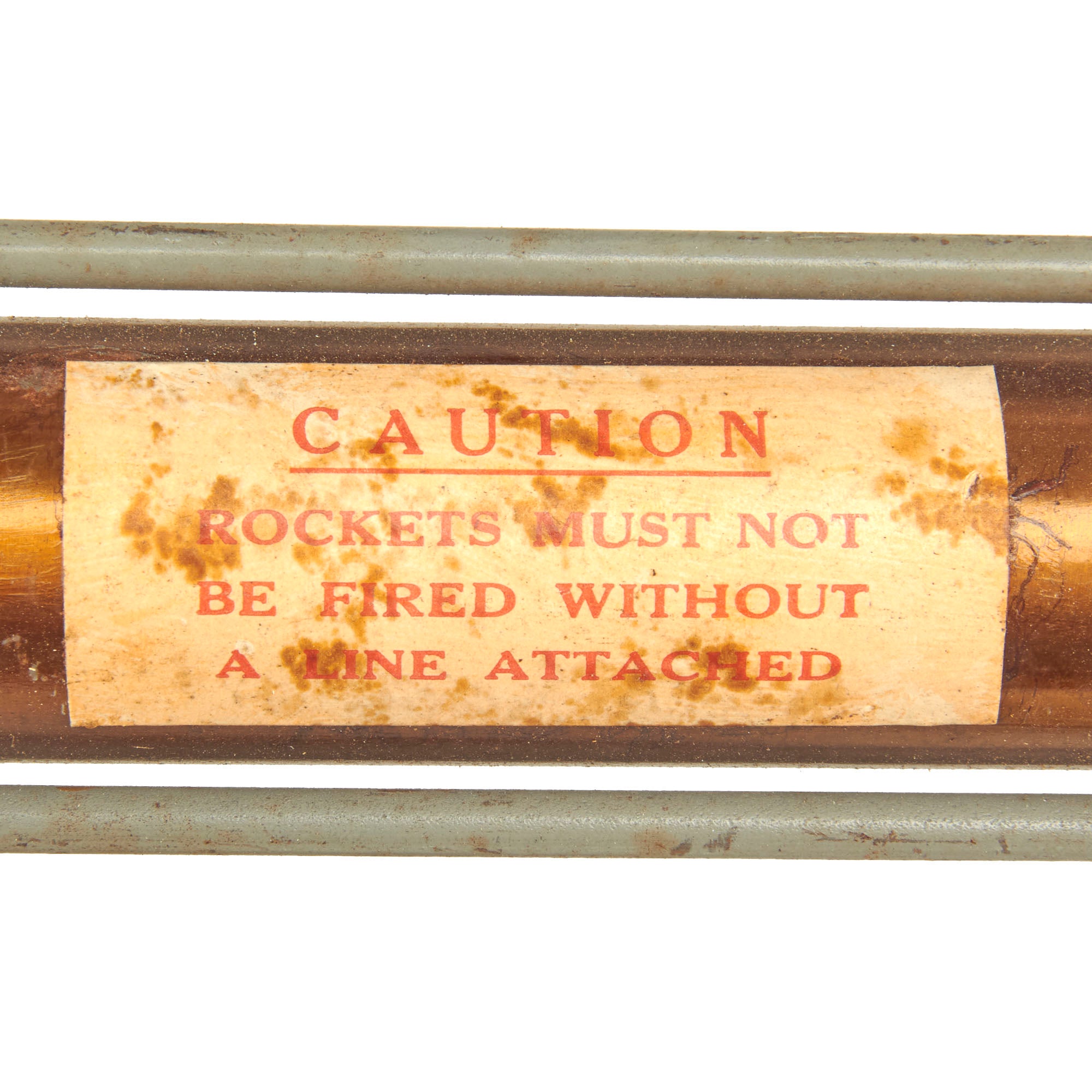 Also included is the tin case which measures approximately 19" x 7" x 25" which is complete with 4 unopened boxes of 250 1/2 inch line, 4 deactivated rockets, original instruction label and more! It is marked as a SIZE 2, and a label indicates that the set is serial number 1584 TYPE A. This is a set that was issued but never used. Found in a warehouse on the Northeastern Seaboard of the United States where it has laid undisturbed for over 100 years!