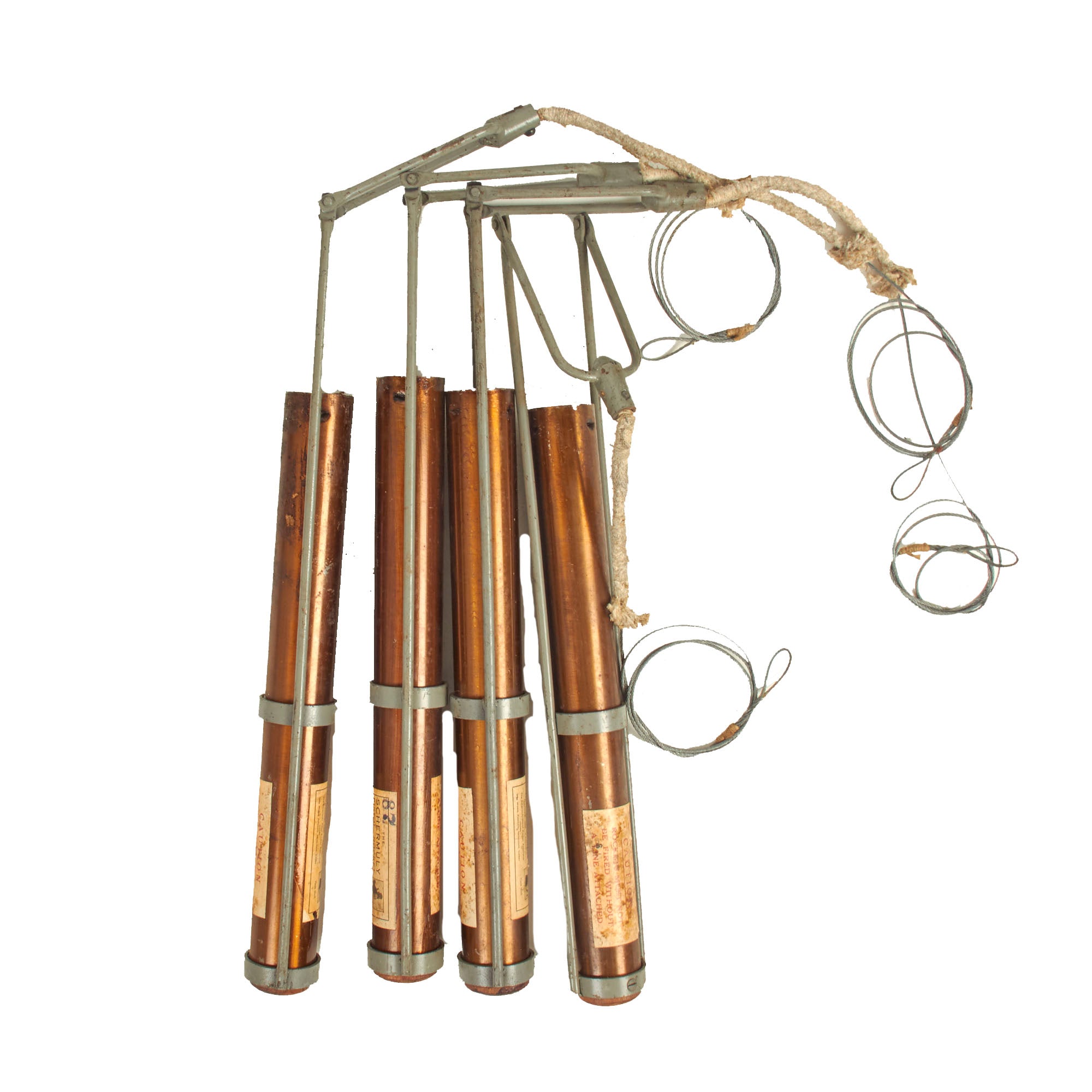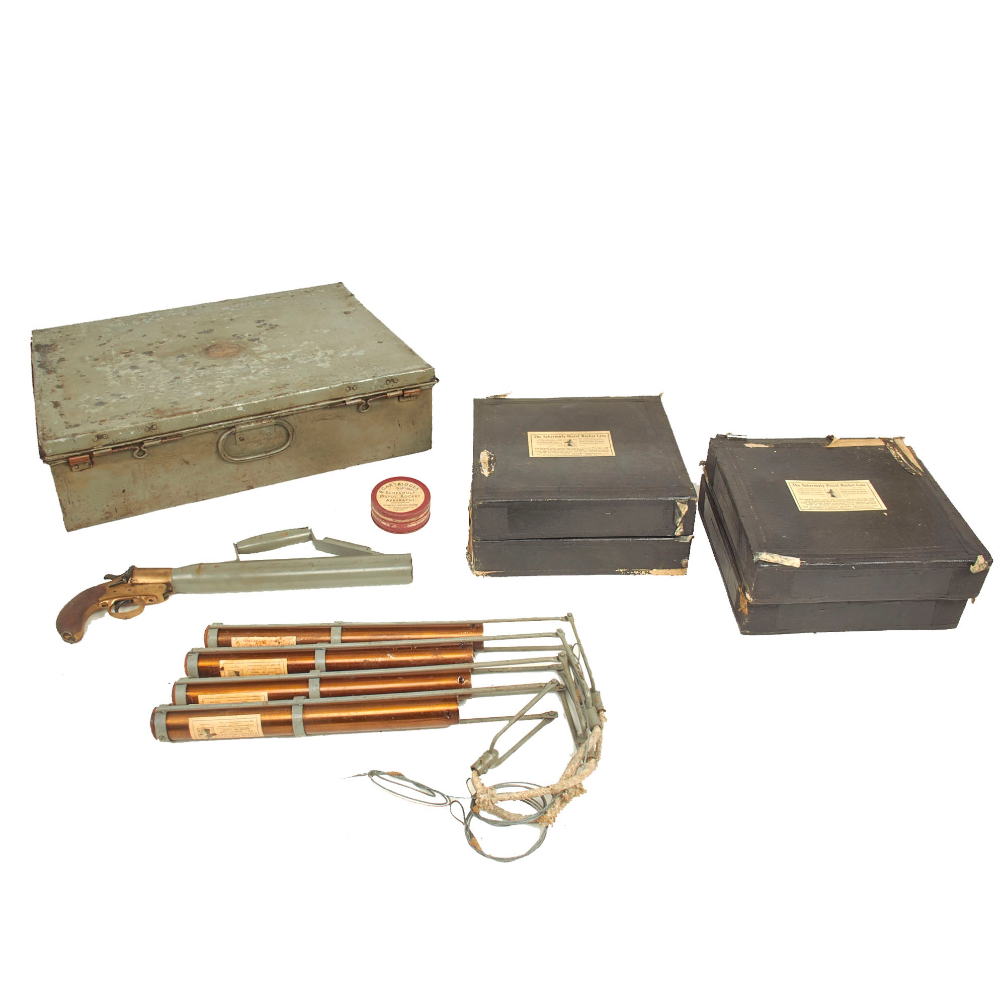 Original Items: Only one set available. William Schermuly 1857-1929 was one of the fathers of modern rocketry. He had served aboard vessels at sea and knew of how many lives were lost each year due to shipwrecks. He invented several different line throwing devices, some of which were used in WWI for such things as throwing telephone lines from trench to trench while under fire. But, the British Admiralty still didn’t see a need for his line throwers. Finally, he came up with a design that was small, easily aimed and fired, accurate and simple to use – the Schermuly Rocket Pistol Apparatus. In 1929, just 19 days before he died, the Admiralty made it compulsory for all vessels over 500 tons to carry line throwers. It was so successful that in 1938, a new act made it a requirement for all ships over 80 tons or 50 feet in length.
