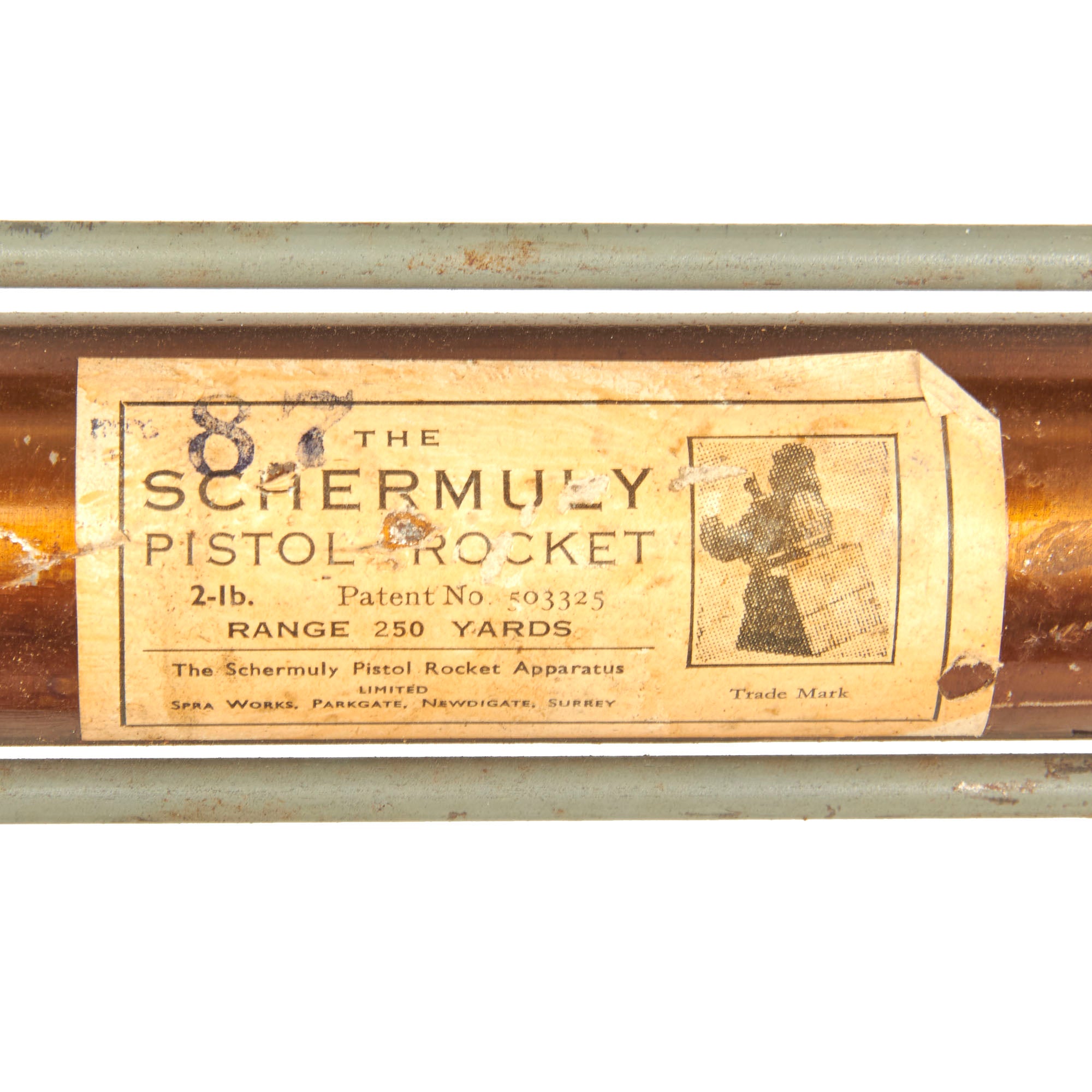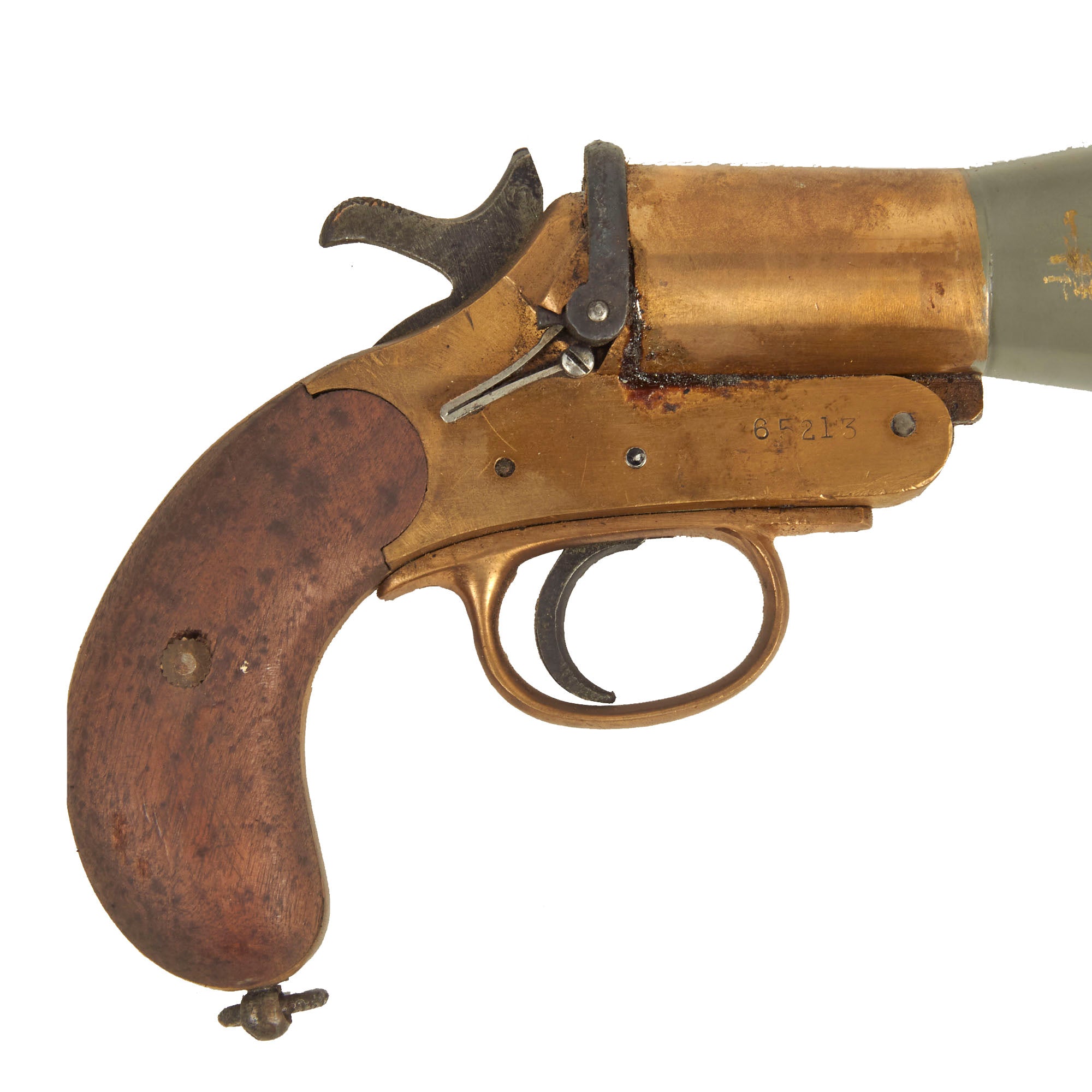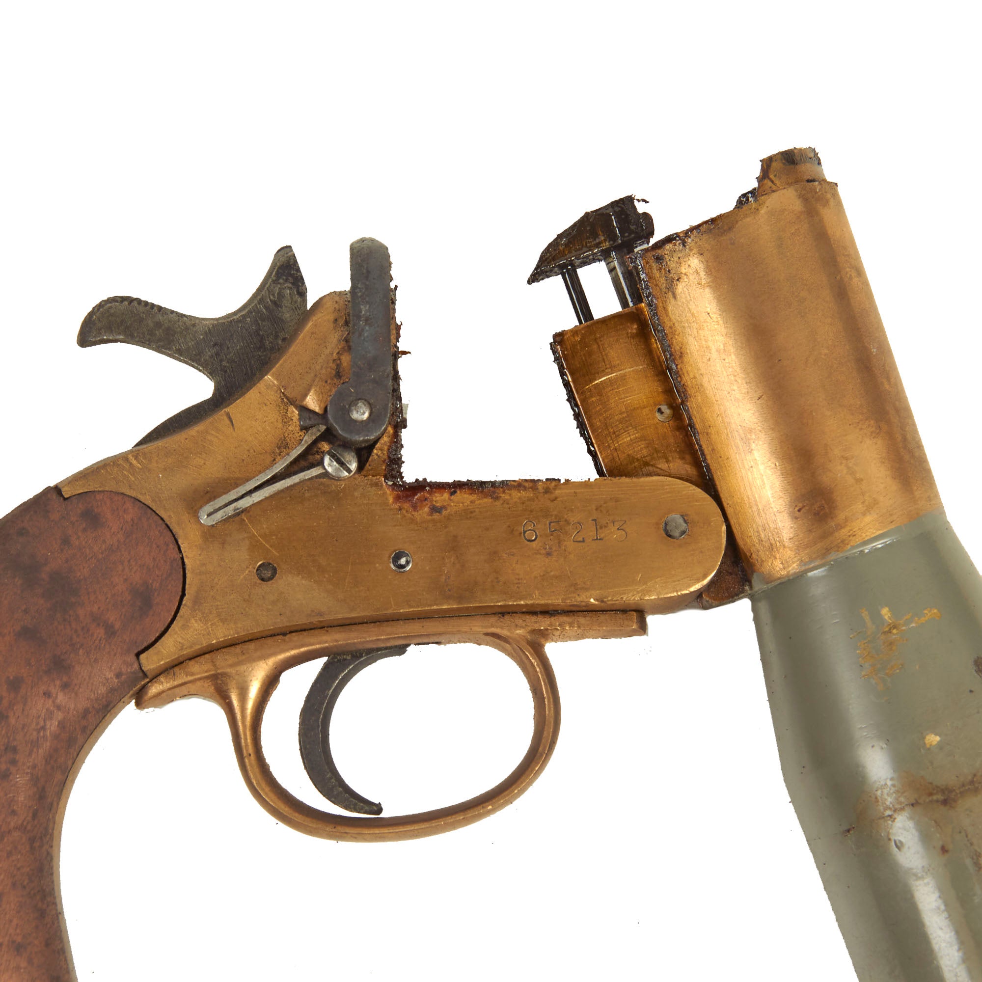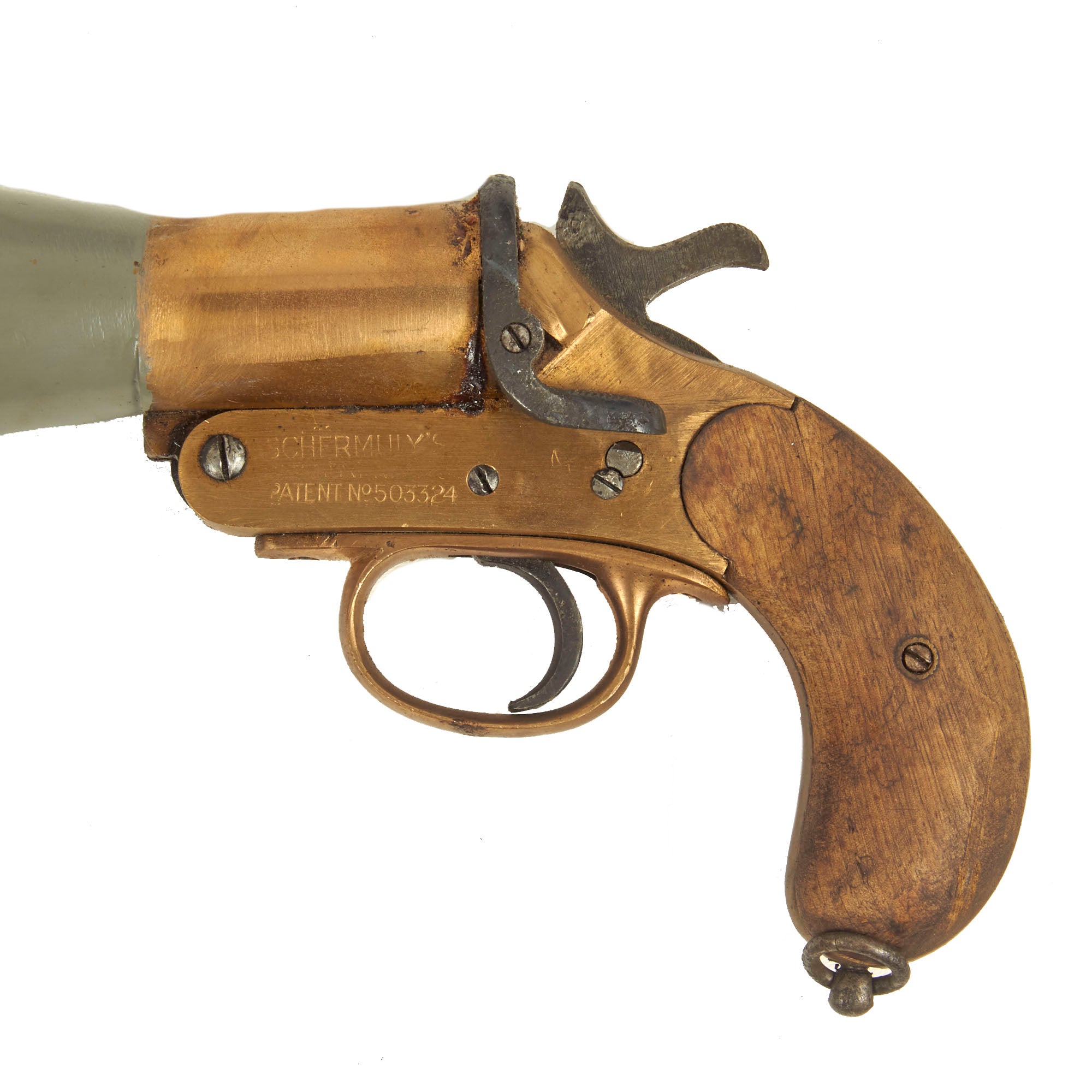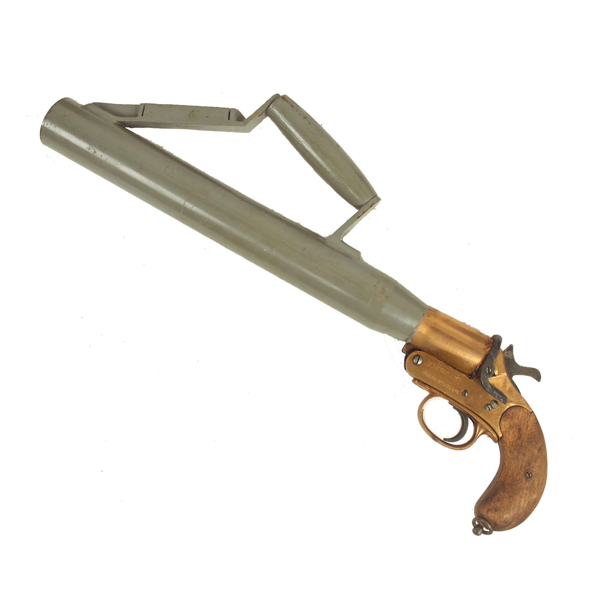 Dating from the 1920s this Schermuly Line Throwing Rocket Pistol has a brass frame and chamber, while the rocket tube, or barrel, is steel, and entirely painted light gray. It has mahogany grips and a wooden secondary handle, which was painted as well. It may have had the frame cleaned a bit at some point, which removed any proof markings that were present. It is also marked with serial number 65213 on the barrel and frame, and has the SCHERMULY'S / PATENT No 503324 on the left side of the frame. Overall, the pistol is in very good condition. The inside of the barrel and chamber have been coated with cosmoline protectant.
