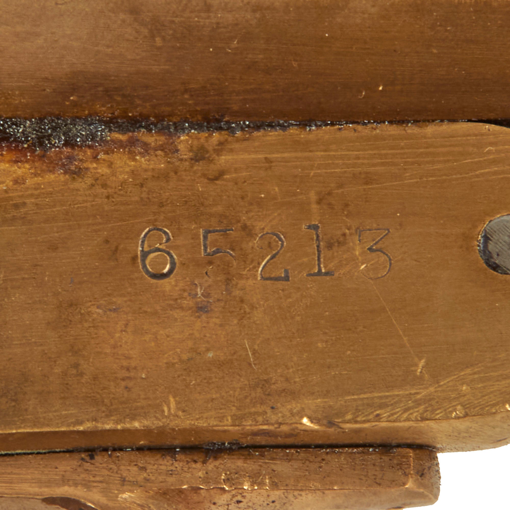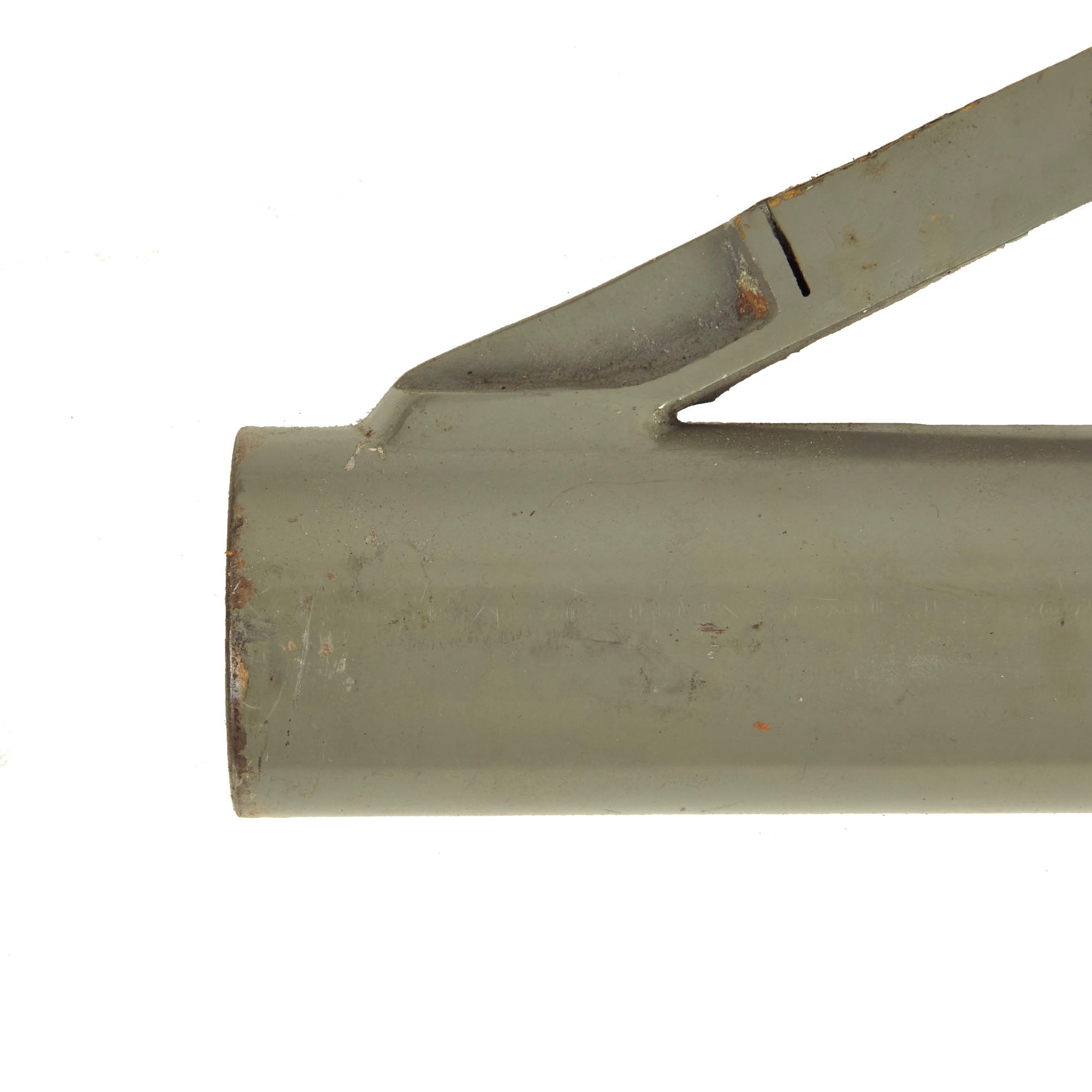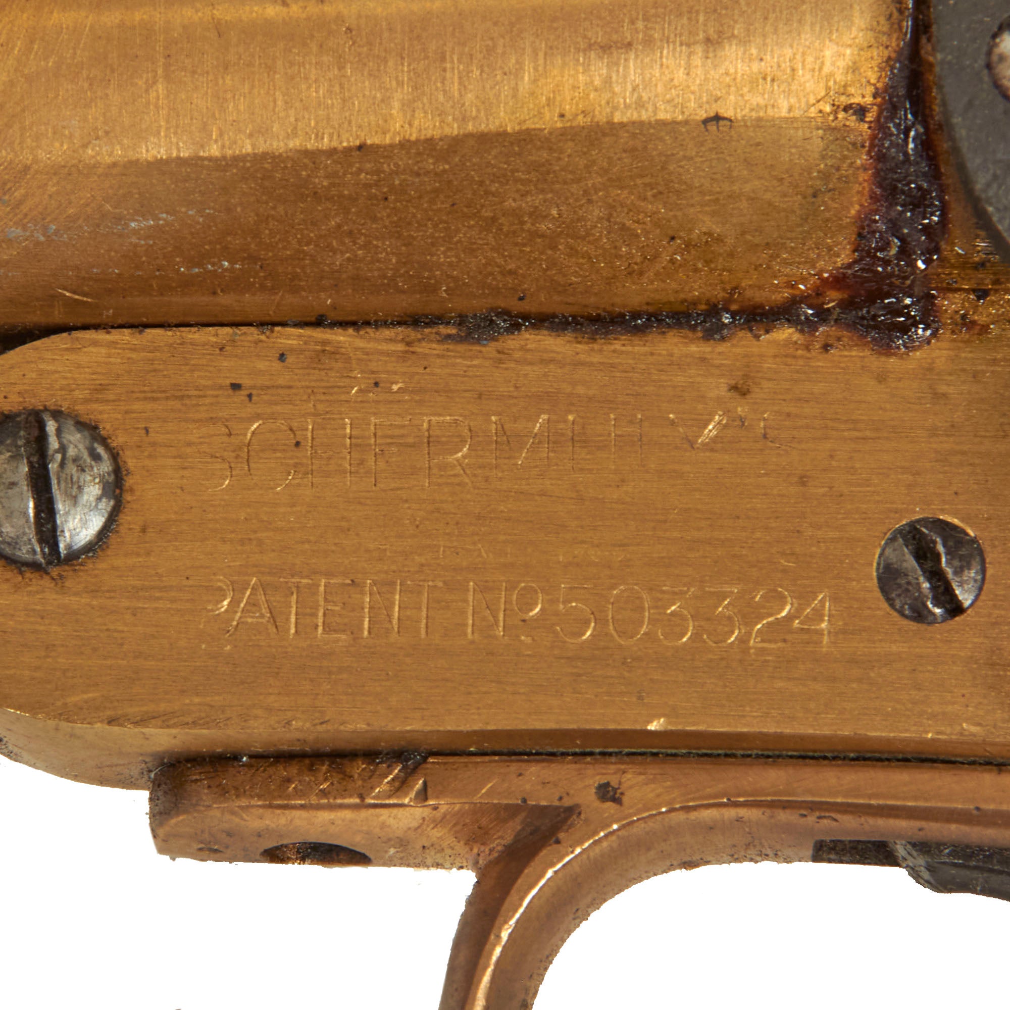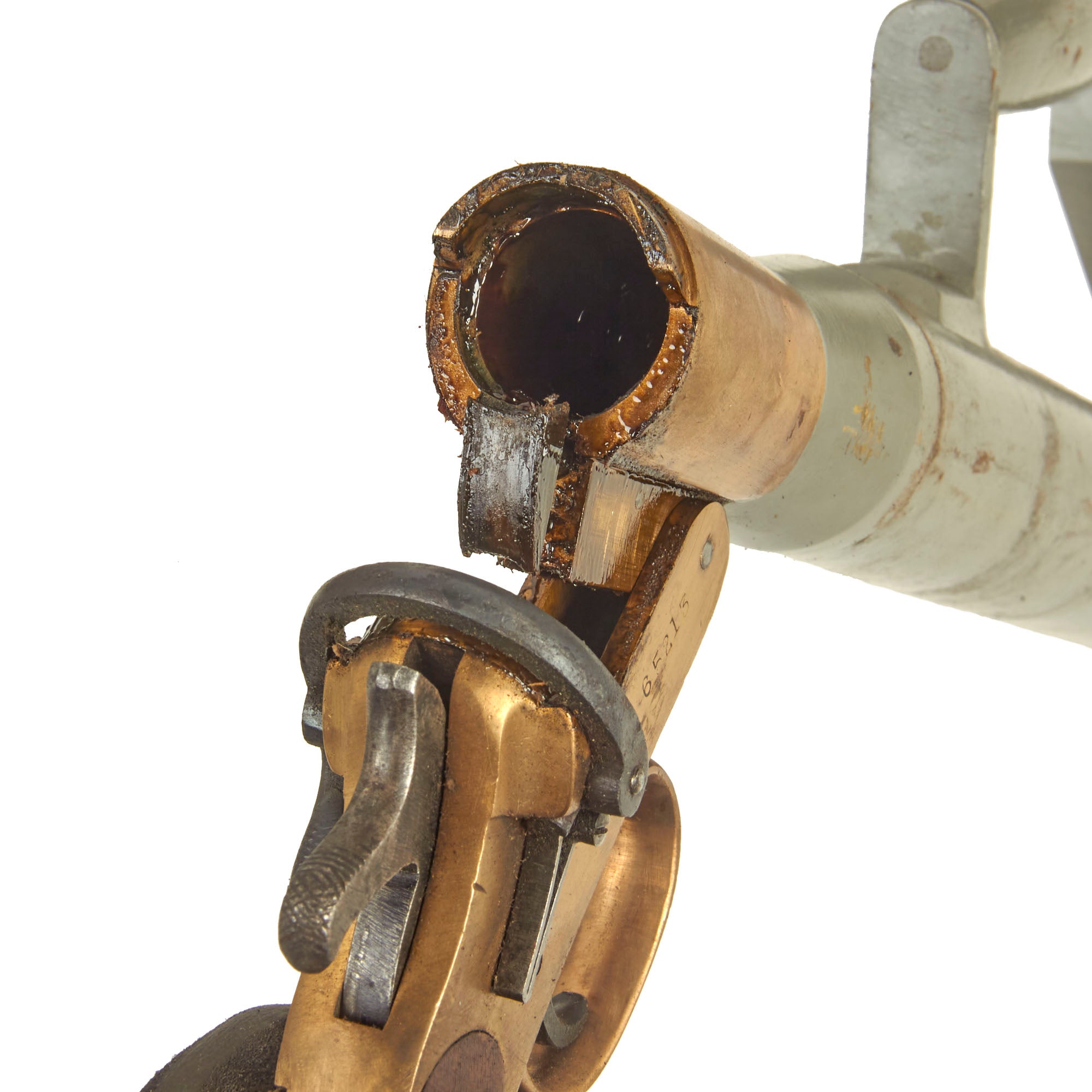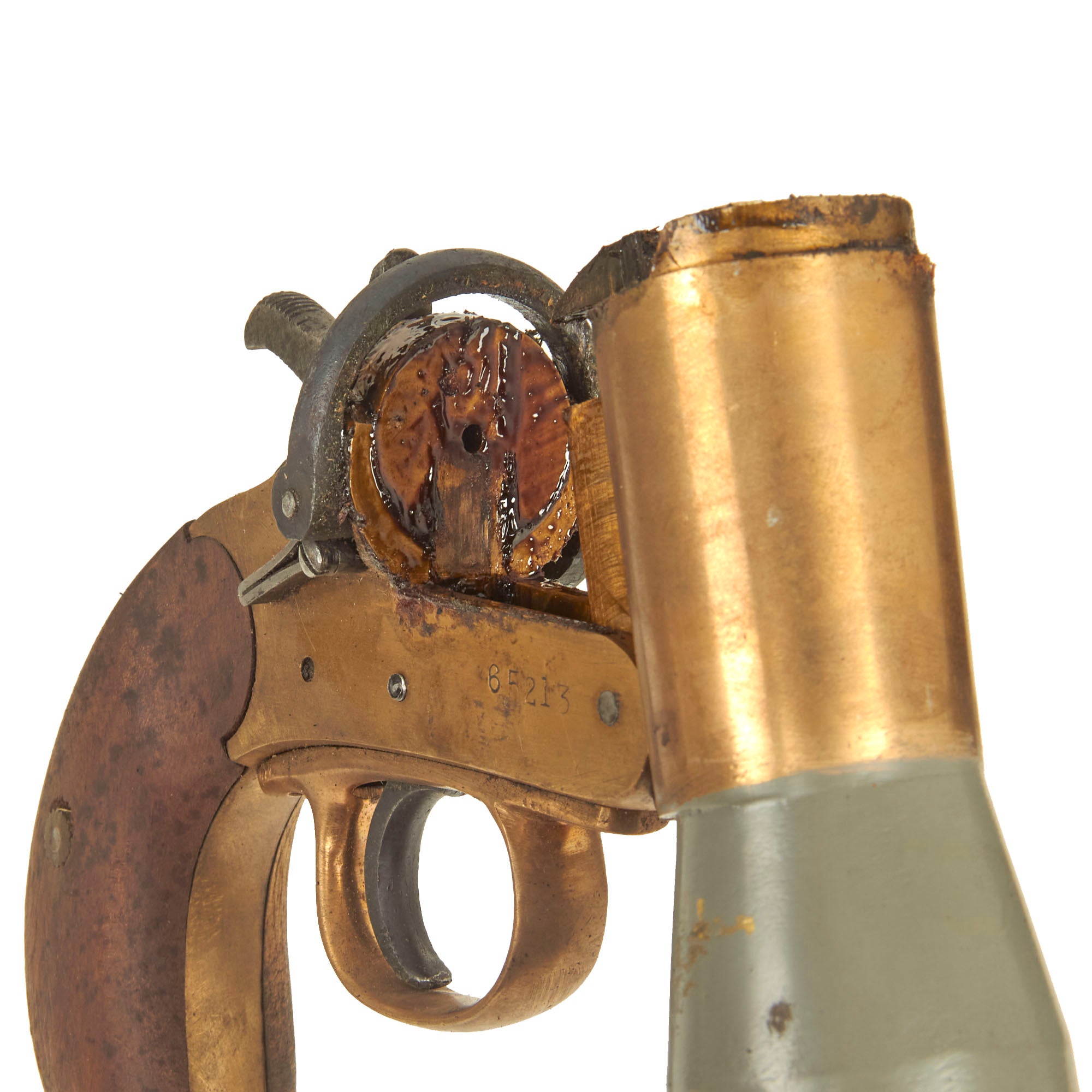 Dating from the 1920s this Schermuly Line Throwing Rocket Pistol has a brass frame and chamber, while the rocket tube, or barrel, is steel, and entirely painted light gray. It has mahogany grips and a wooden secondary handle, which was painted as well. It may have had the frame cleaned a bit at some point, which removed any proof markings that were present. It is also marked with serial number 65213 on the barrel and frame, and has the SCHERMULY'S / PATENT No 503324 on the left side of the frame. Overall, the pistol is in very good condition. The inside of the barrel and chamber have been coated with cosmoline protectant.