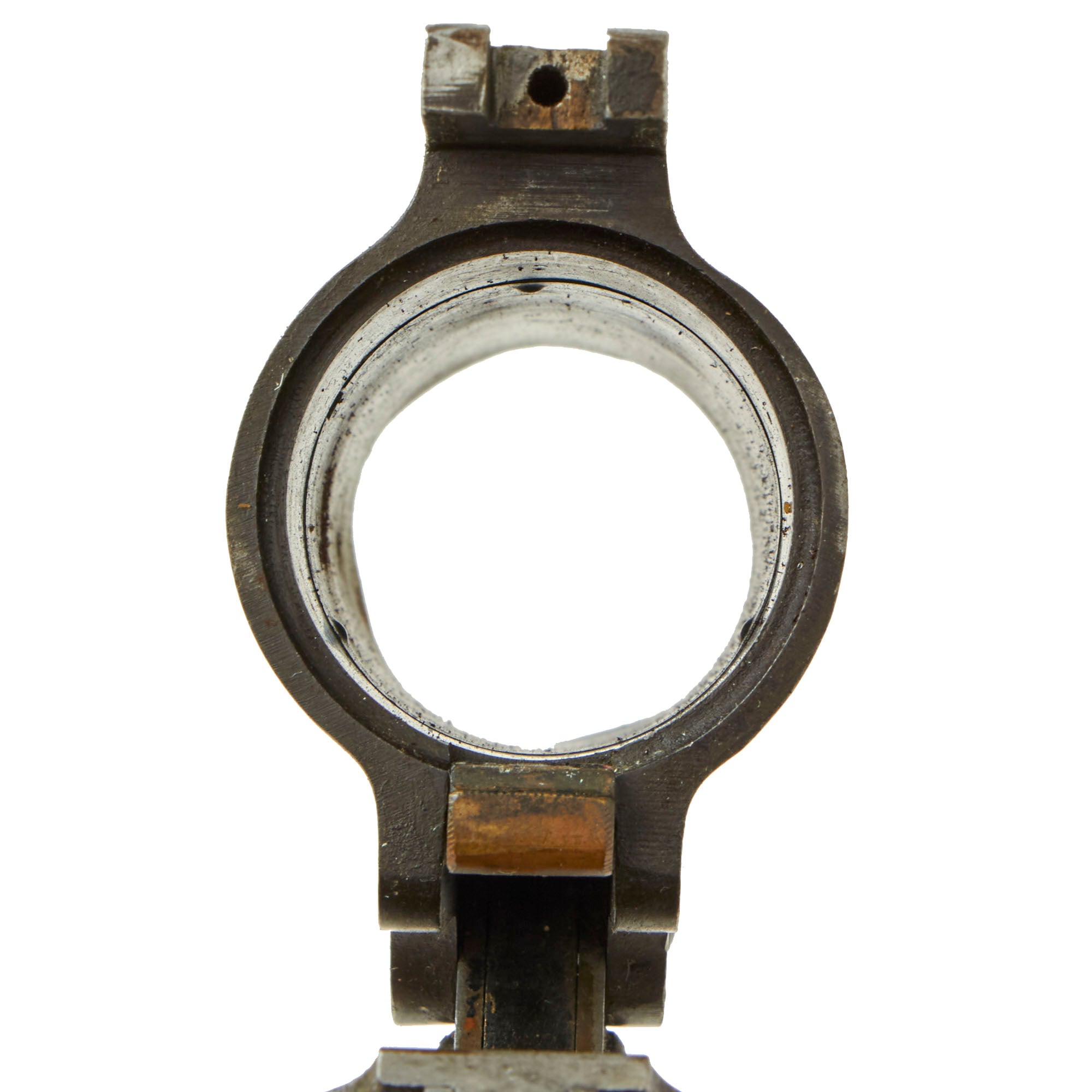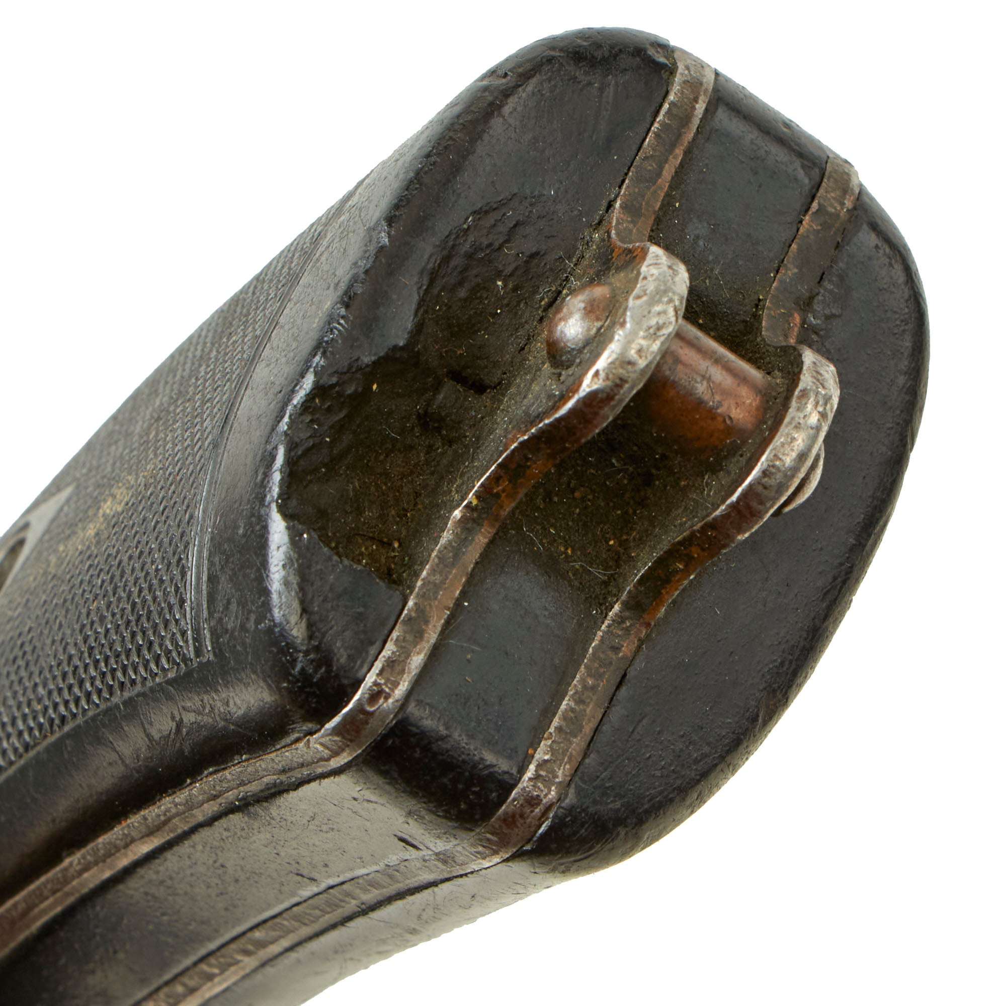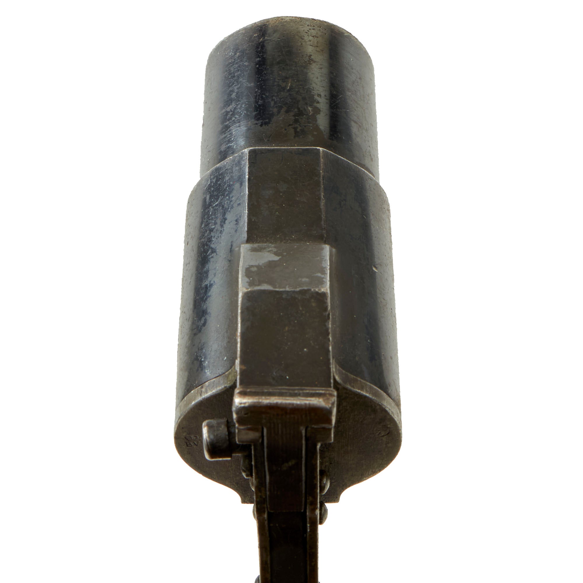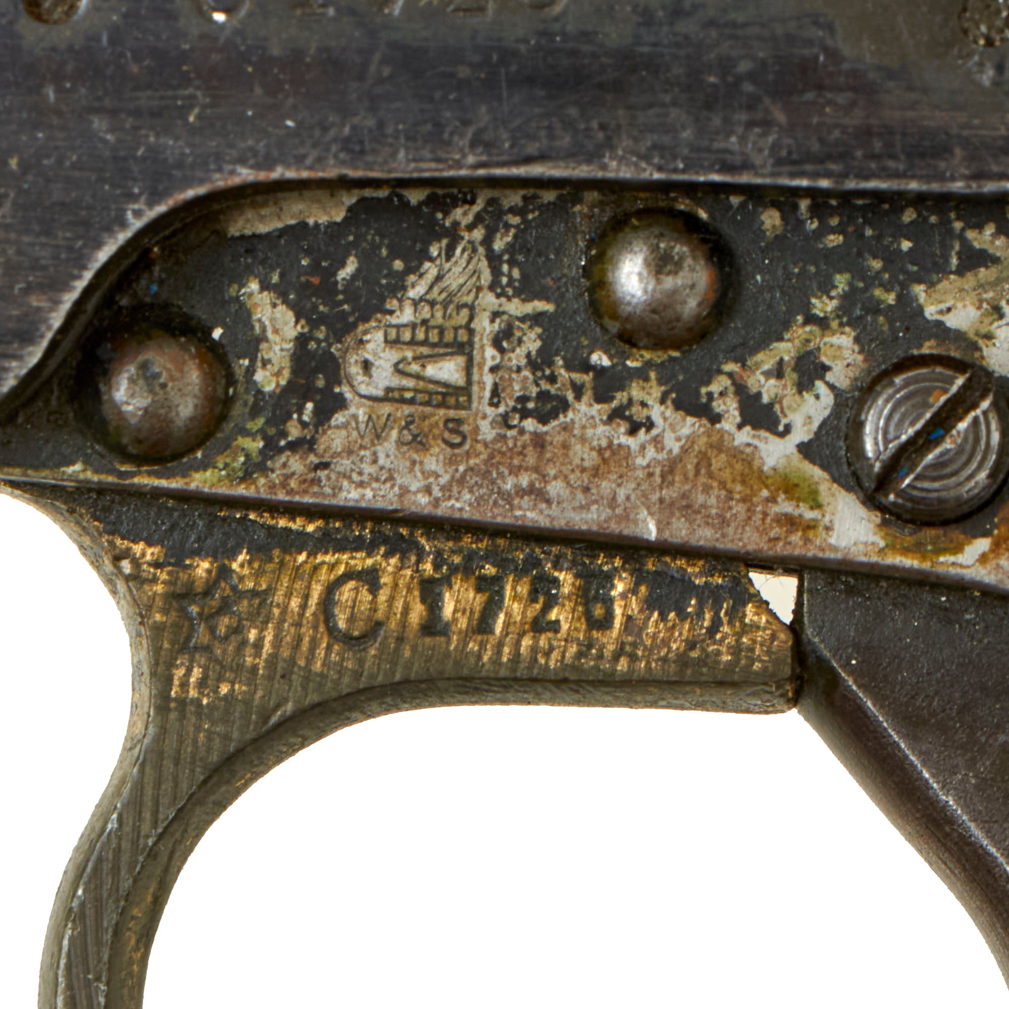 The pistol itself is of heavy steel construction, and a mixture of machined and cast parts. The barrel itself is cast and then machined on the front and inside, but not the sides, which gives it a rougher look. The left side of the pistol is marked 1 ½” CAL. SIGNAL PISTOL over serial number MARK “IV” with the all matching serial number C1726 which from what we have seen is a rather low number. The same serial number is seen on the brass trigger guard, which is just below the Webley & Scott logo on the frame. The barrel and frame have numerous British proof marks, as well as the 1 1/2" size emblem.
