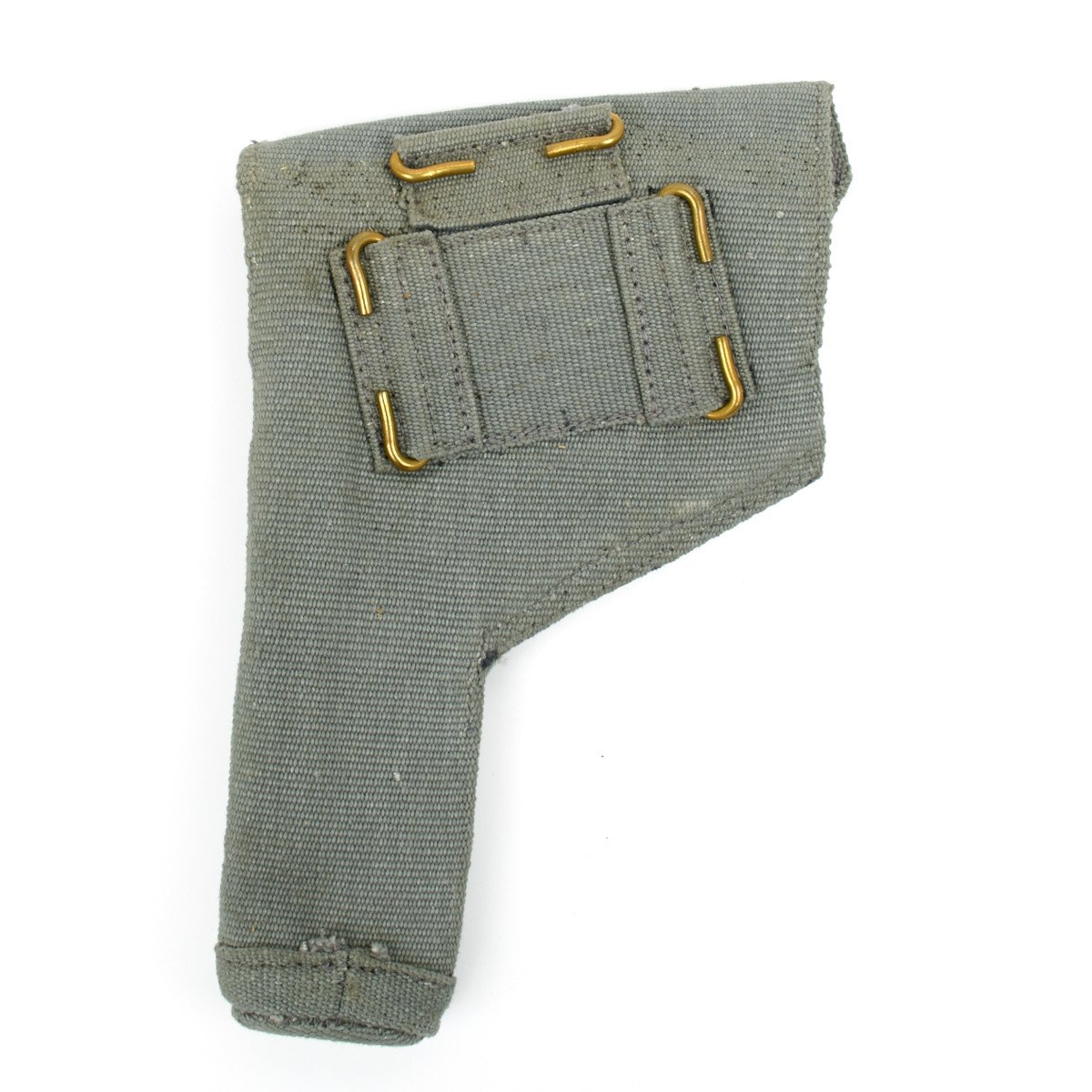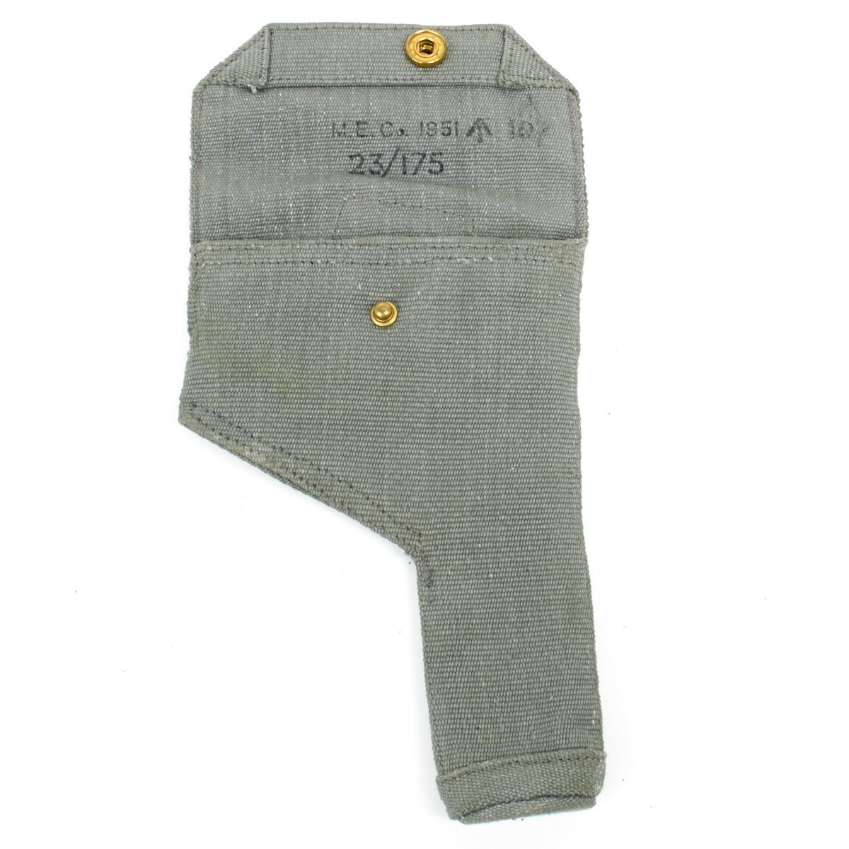 Original Item: Grey/Blue Web Royal Air Force Holster (R.A.F) for use with Browning High Power and Colt 1911 Pistols. Each holster has a flap top with brass snap and an internal cleaning rod compartment. Brass hook attachments on belt.