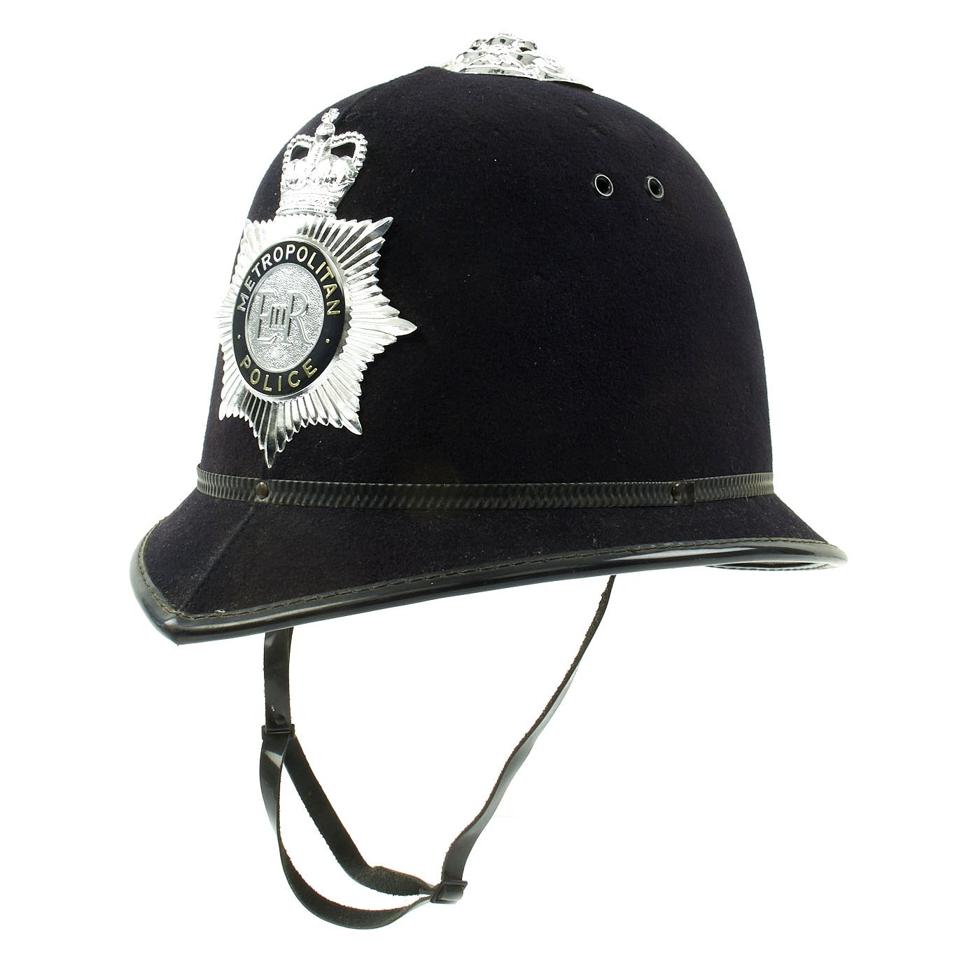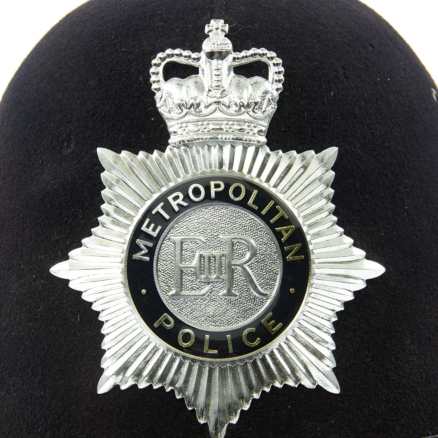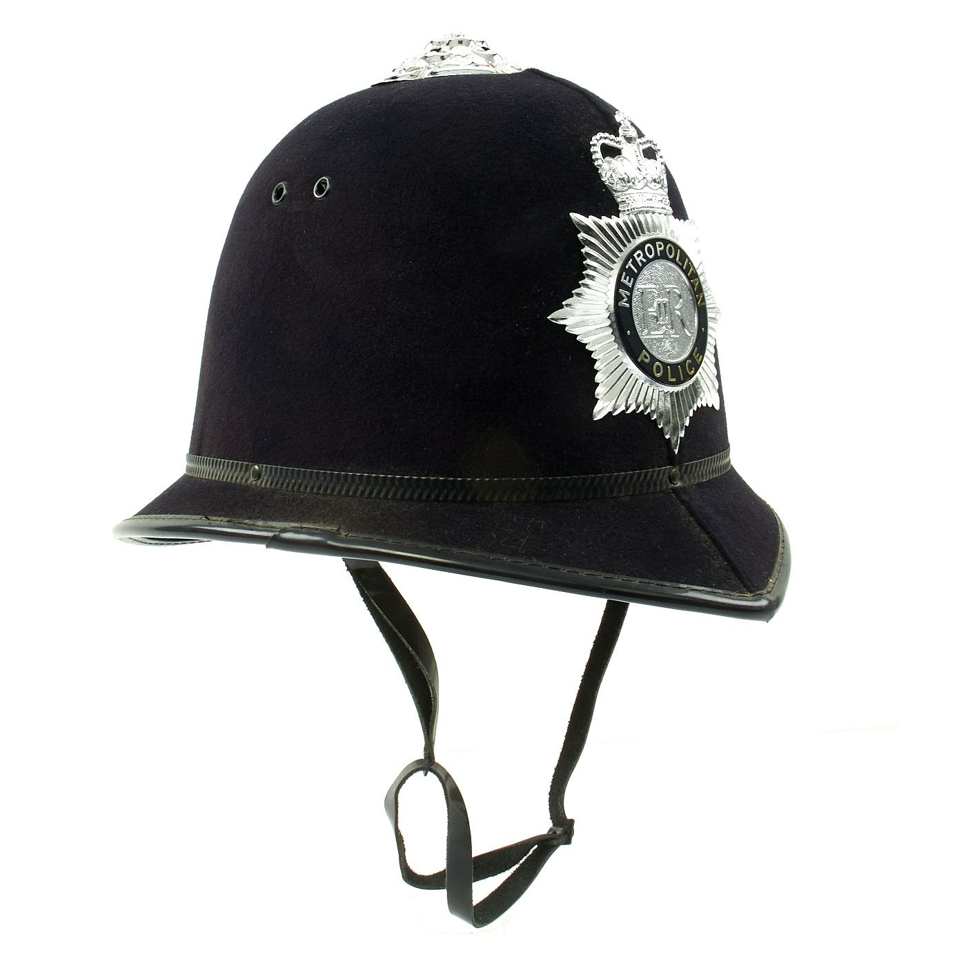 Original Item: One Only. The Traditional Bobby helmet was named after the creator of the British Police Force, SIR ROBERT PEEL, who became Prime Minister under Queen Victoria. This early version, known as a "Rose Top," features a plated top fitting, in the shape of a rose, hence the name. The front Helmet plate has a Queens's Crown to top, over a star burst containing a silver E II R Royal Cypher, for Queen Elizabeth II, who has reigned since 1952. There is a circle around the cypher which reads METROPOLITAN / POLICE.