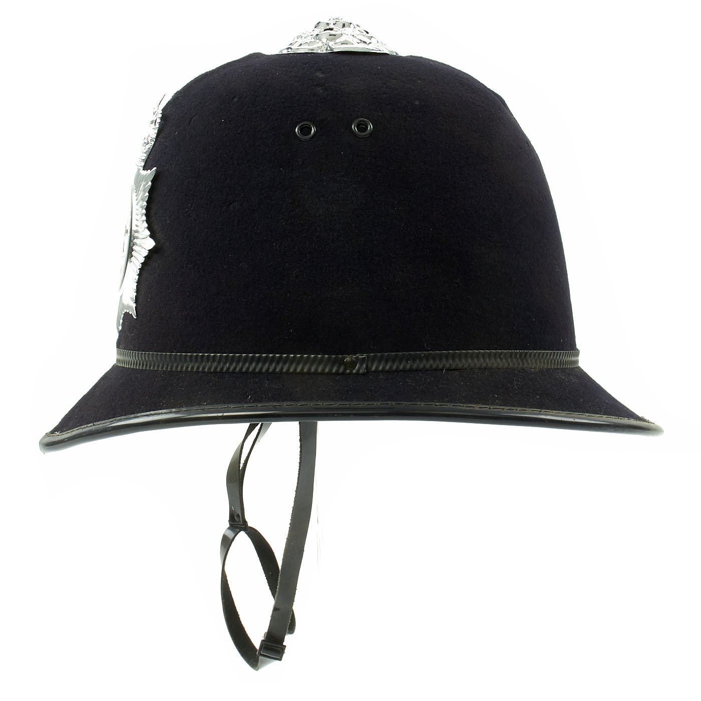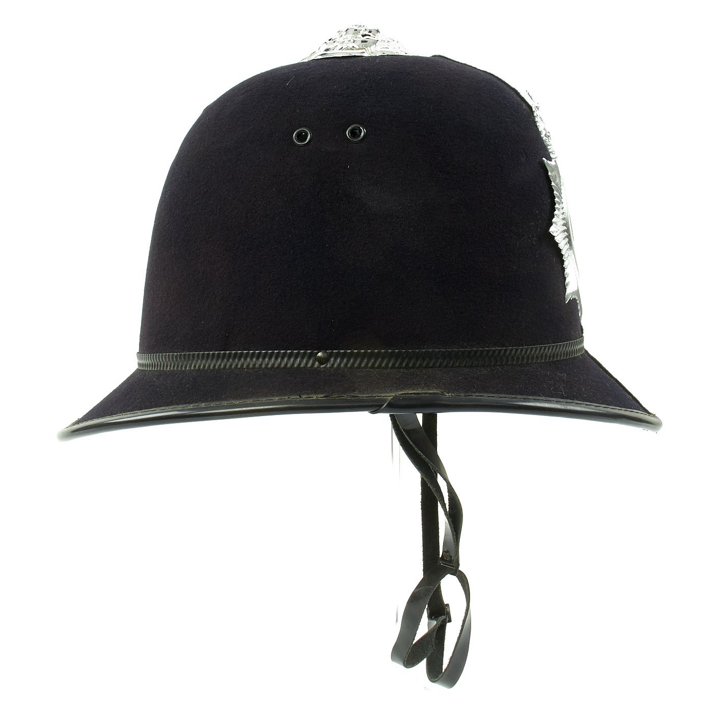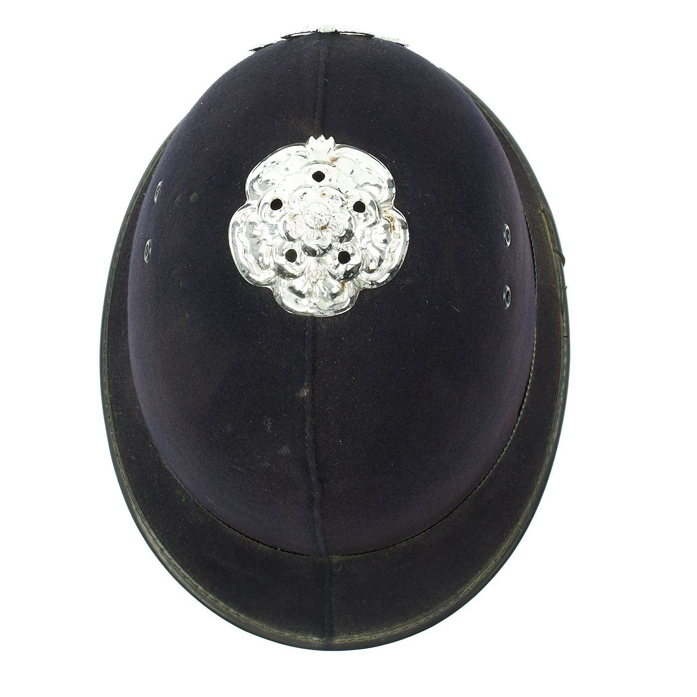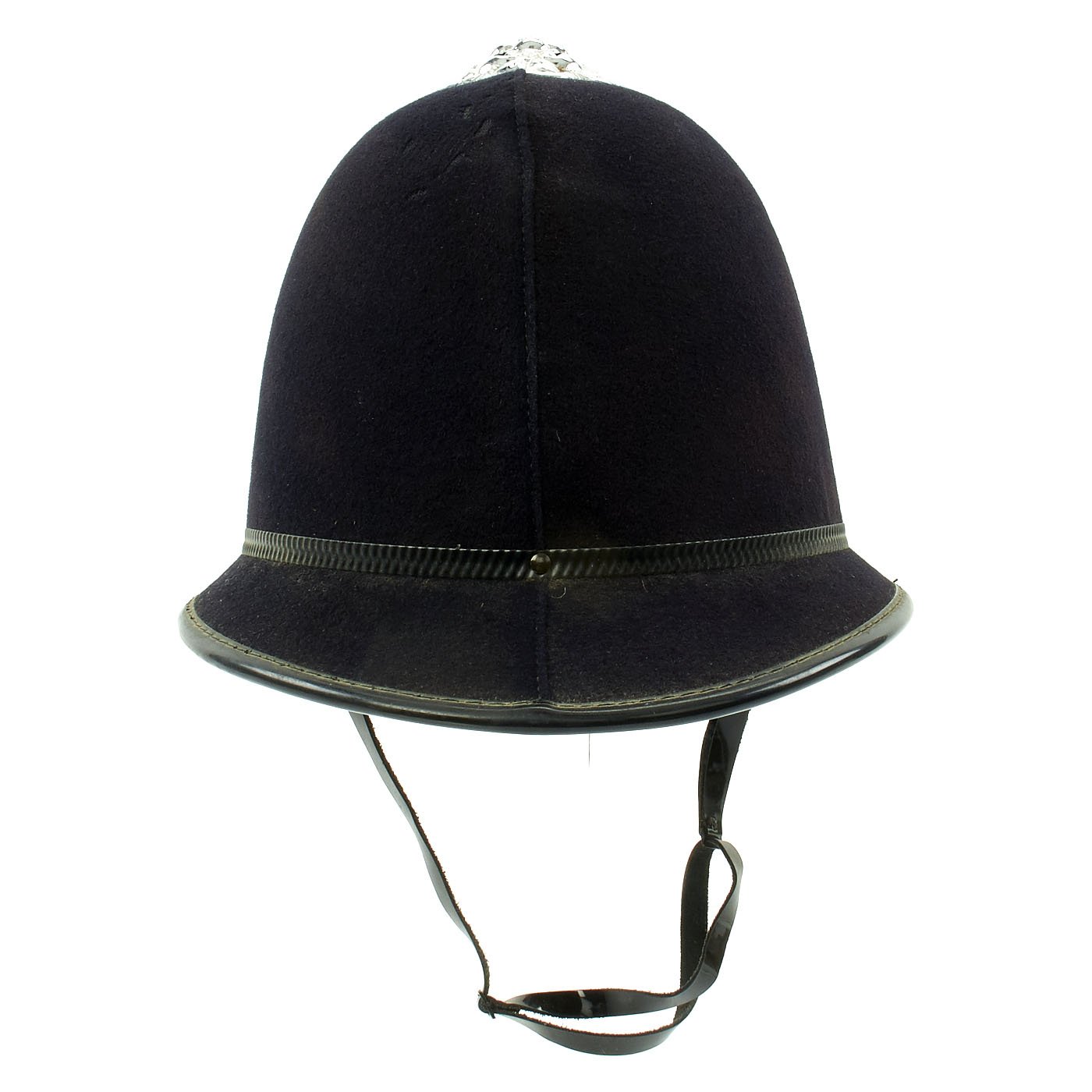 Original Item: One Only. The Traditional Bobby helmet was named after the creator of the British Police Force, SIR ROBERT PEEL, who became Prime Minister under Queen Victoria. This early version, known as a "Rose Top," features a plated top fitting, in the shape of a rose, hence the name. The front Helmet plate has a Queens's Crown to top, over a star burst containing a silver E II R Royal Cypher, for Queen Elizabeth II, who has reigned since 1952. There is a circle around the cypher which reads METROPOLITAN / POLICE.