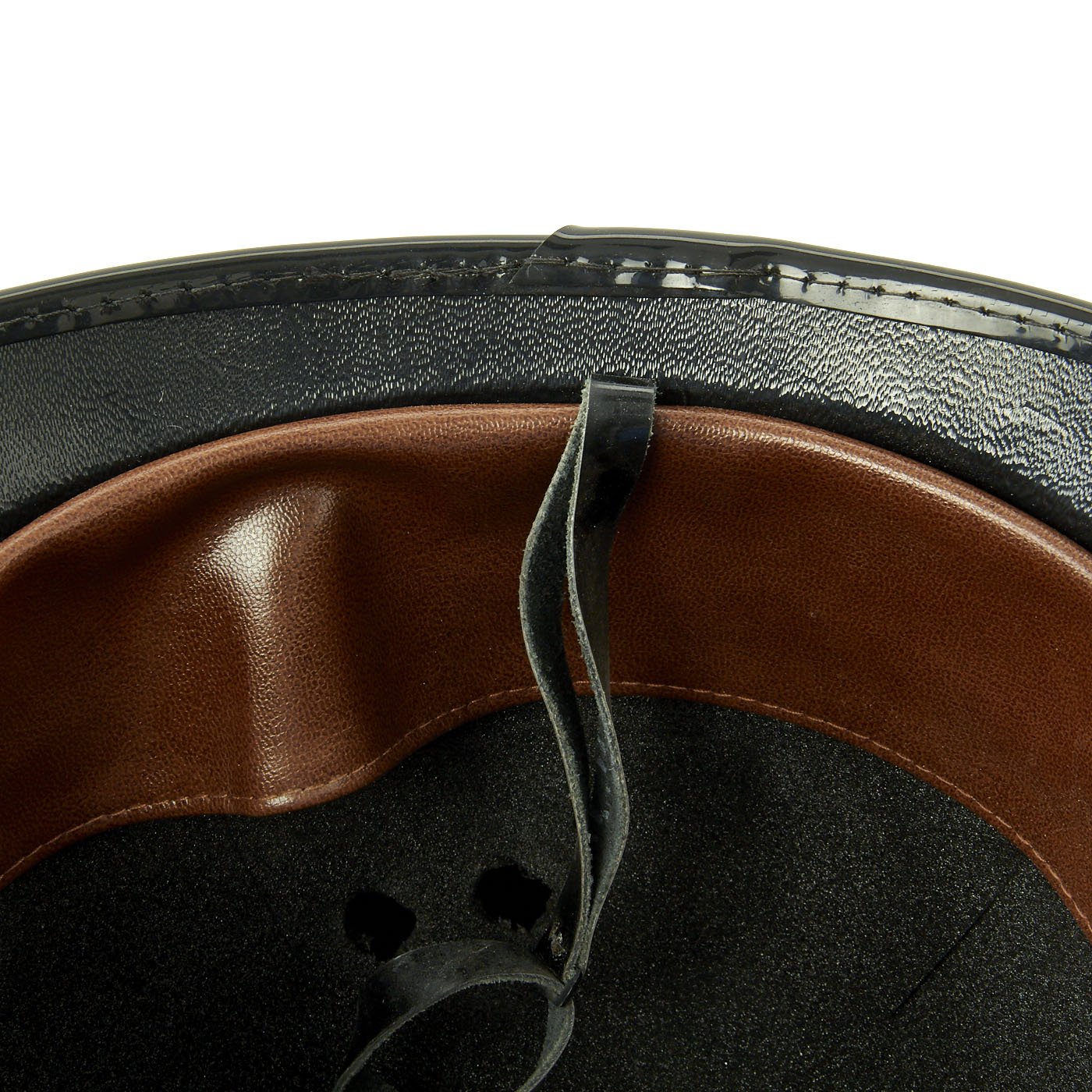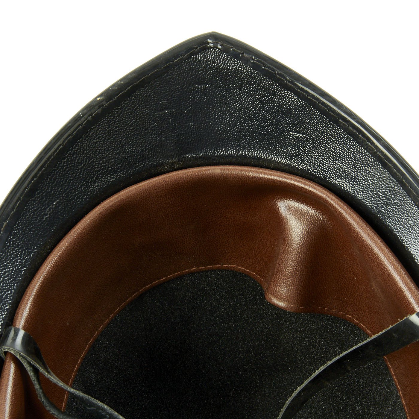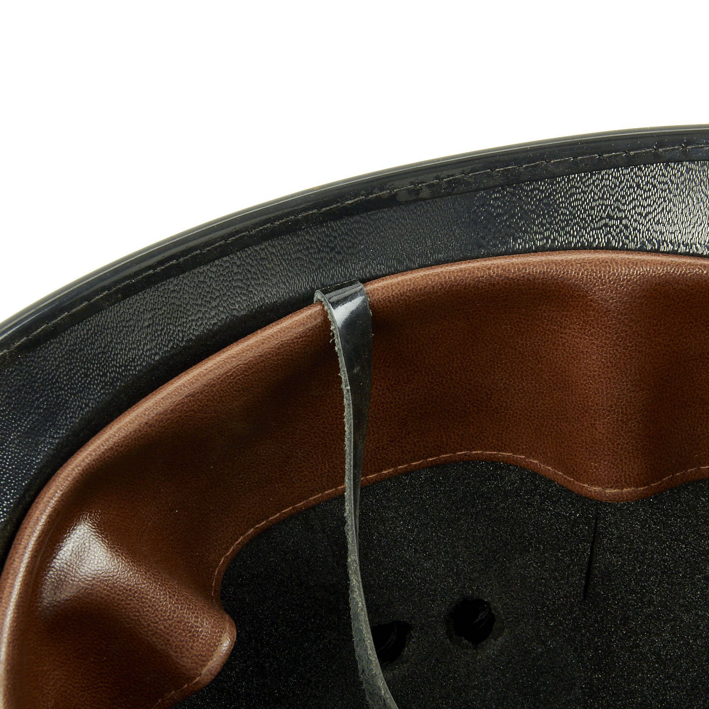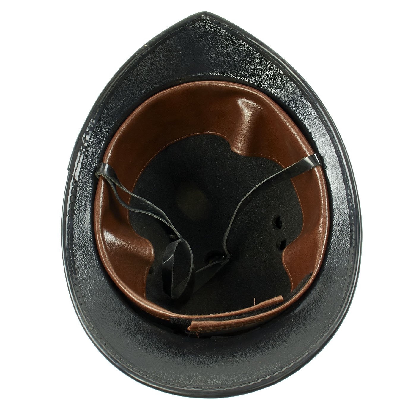 This is definitely a very recent issue, probably from the last 25 years, and has a faux leather liner, adjustable in the back by a hook and loop closure. The chin strap is present, and in great shape, still shiny and supple. The exterior dark blue felt covering is in very good condition, almost complete with just a few small moth nips.