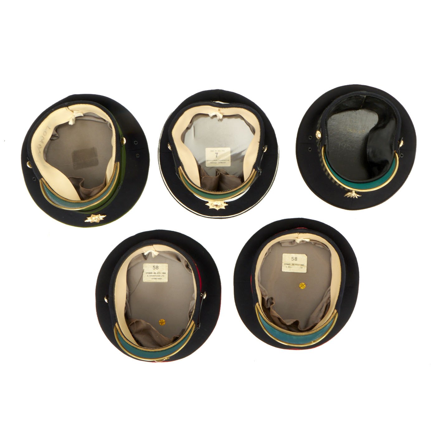 Original Items: Only One Set Available. This is a collection of British Regimental Visor Caps that were Formerly Part the Tower of London Yeoman Warder’s Club Collection that were Formerly part of the decoration of the Yeoman Warder’s Club at the Tower of London. Please see photos for details.