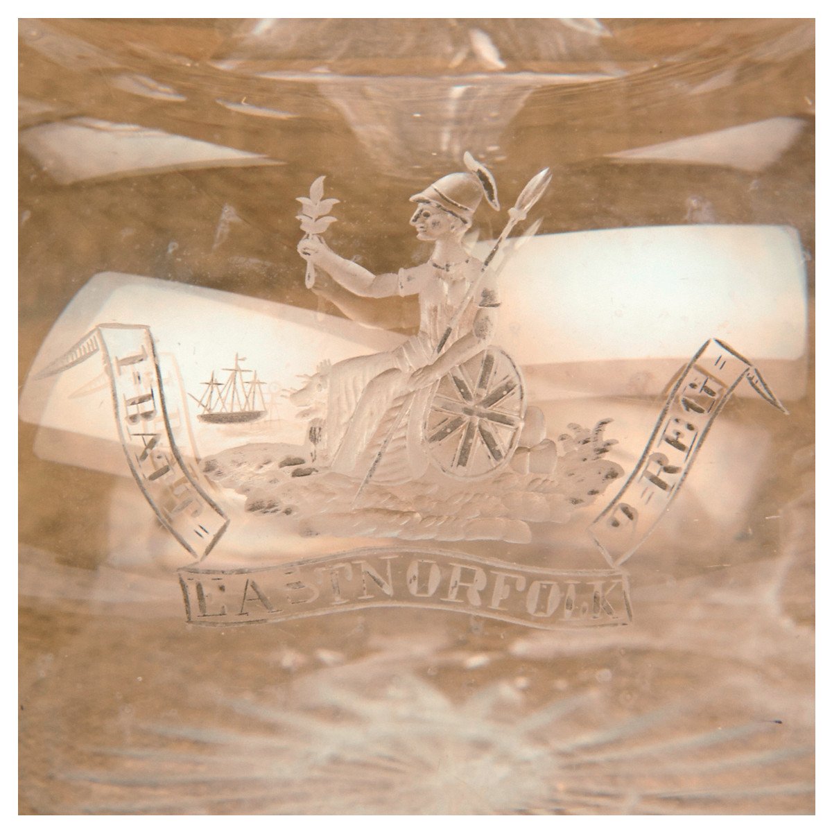 Britannia was then adopted as the regimental badge and is a privilege they have enjoyed ever since. Here we have a charming cut glass wine decanter from the 19th century from the regiment's officer's mess with the Britannia cypher and the Regiment's name in scroll beneath, reading: