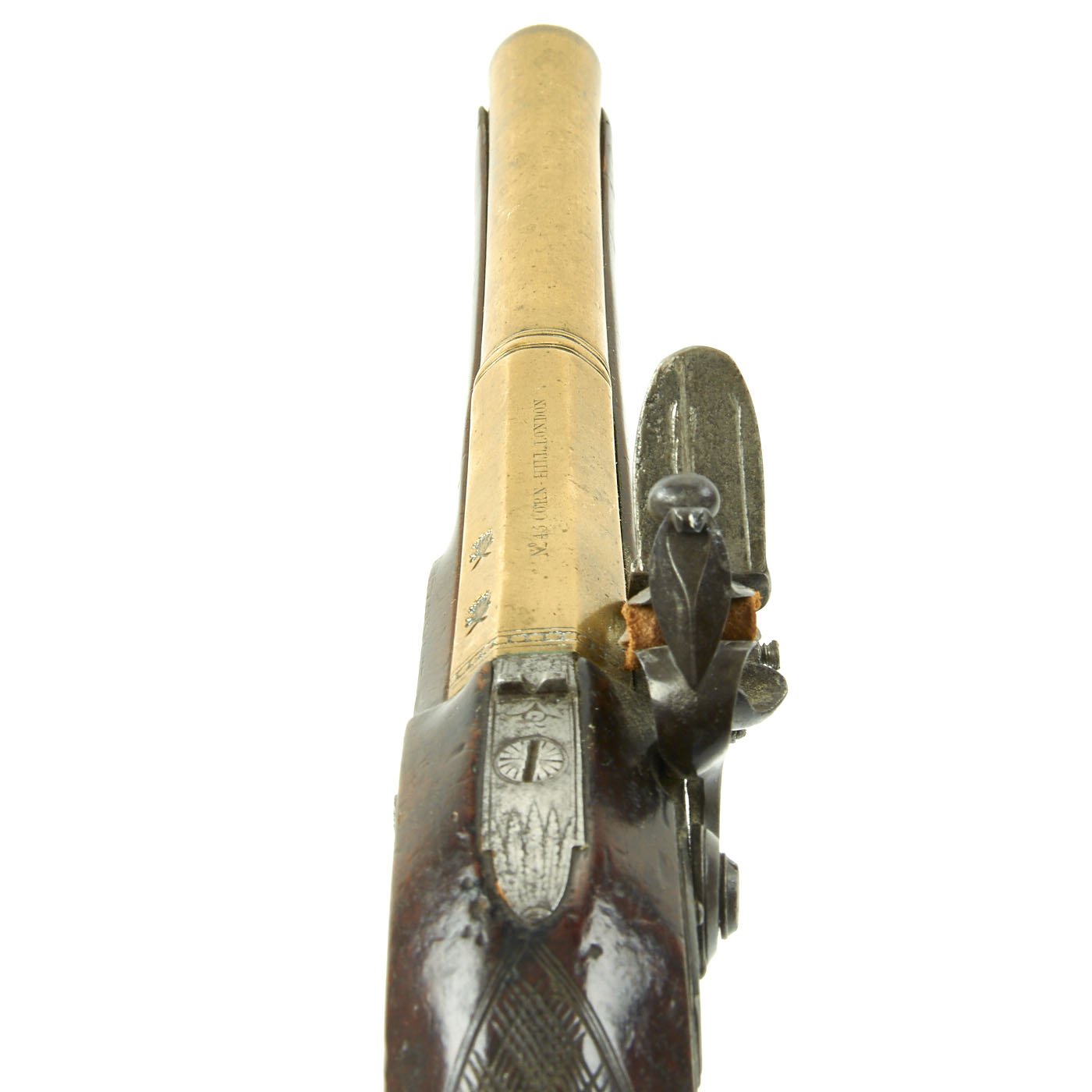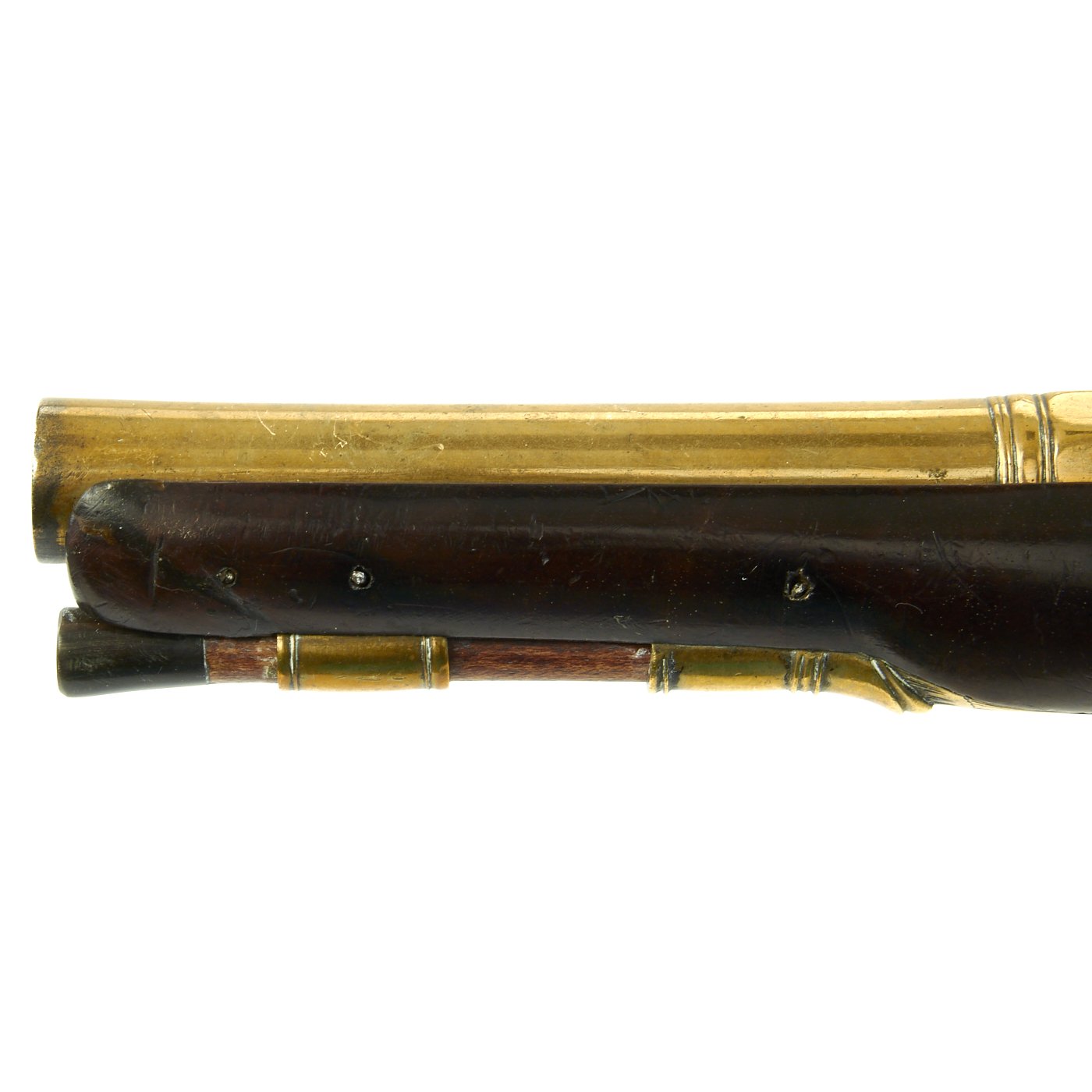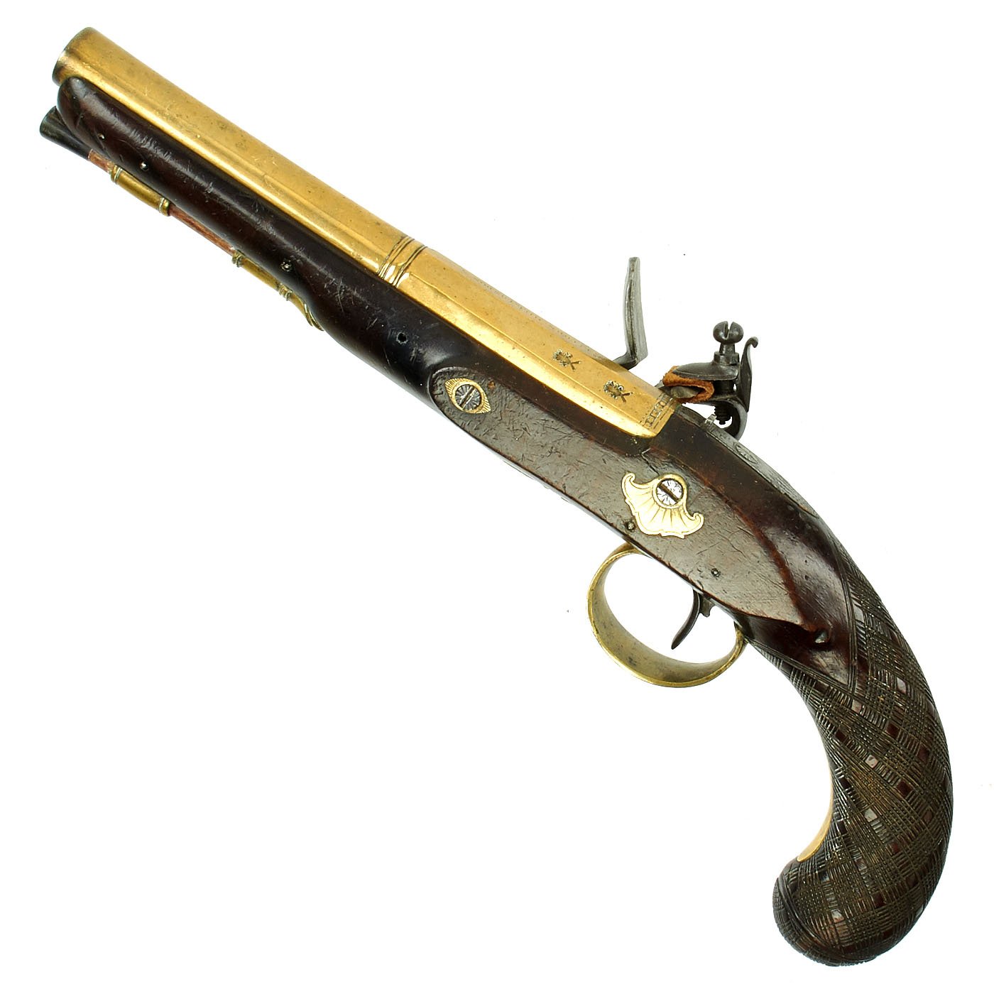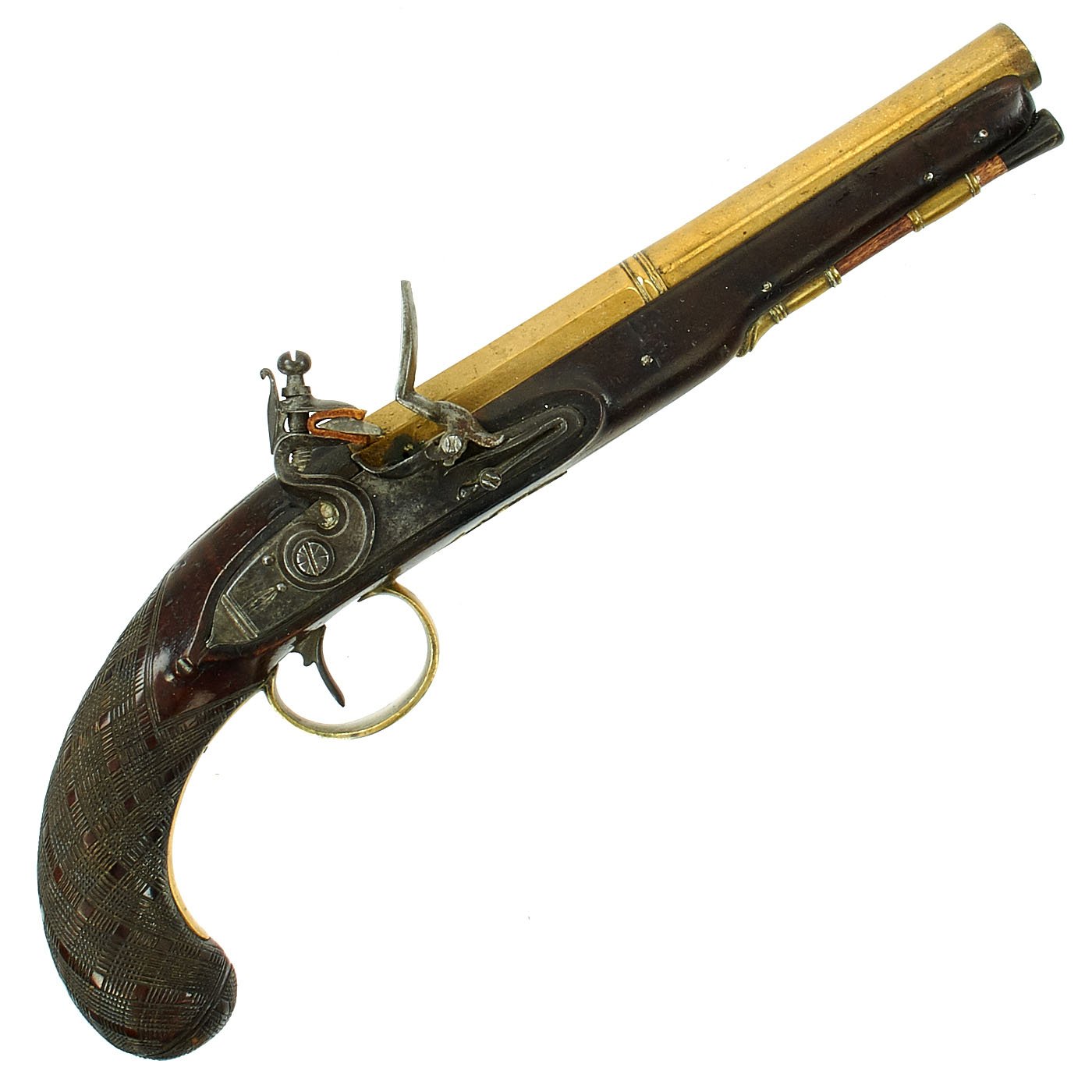 Original Item: Only One Available. This is a high quality British Flintlock pistol in just lovely condition, typical of “Private Purchase” weapons used by Officers. It features a half-octagonal 0.63” bore BRASS Barrel measuring 8", with the pistol being 14" in overall length. The pistol has brass fittings, and does not have a butt cap. The high quality walnut wood stock is most impressively checkered in a most interesting design around the grip area. It also has a good amount of tiger stripe figuring on the left hand side.