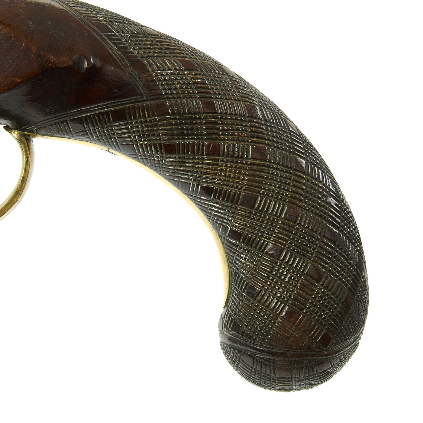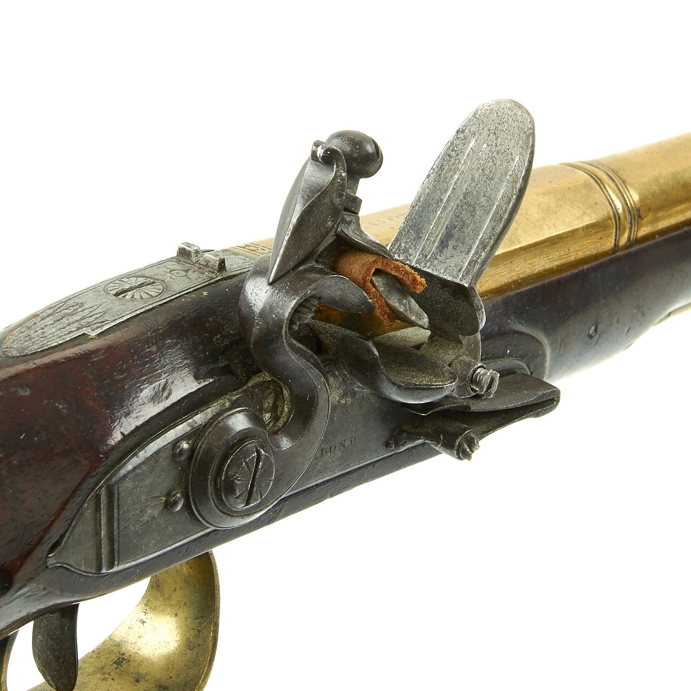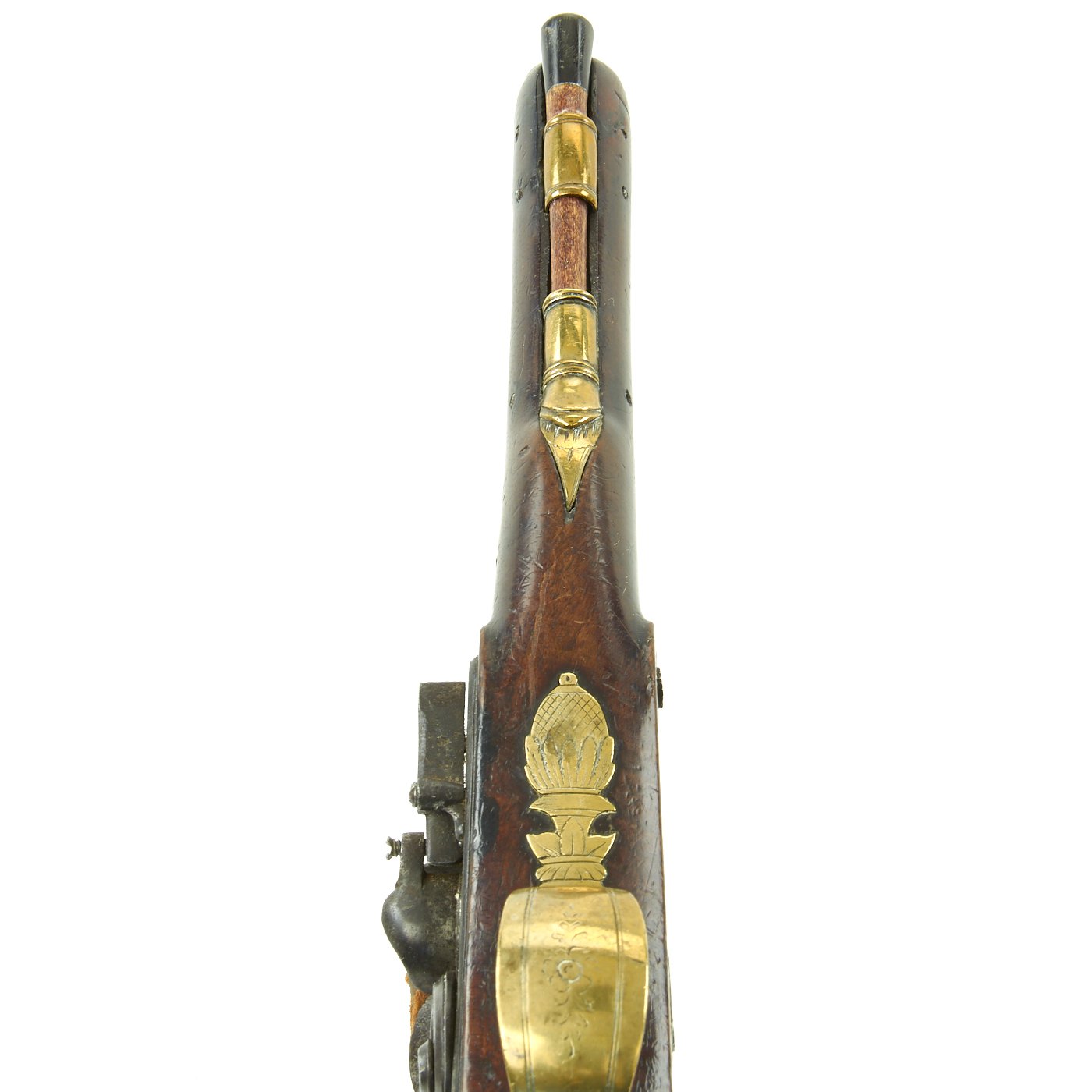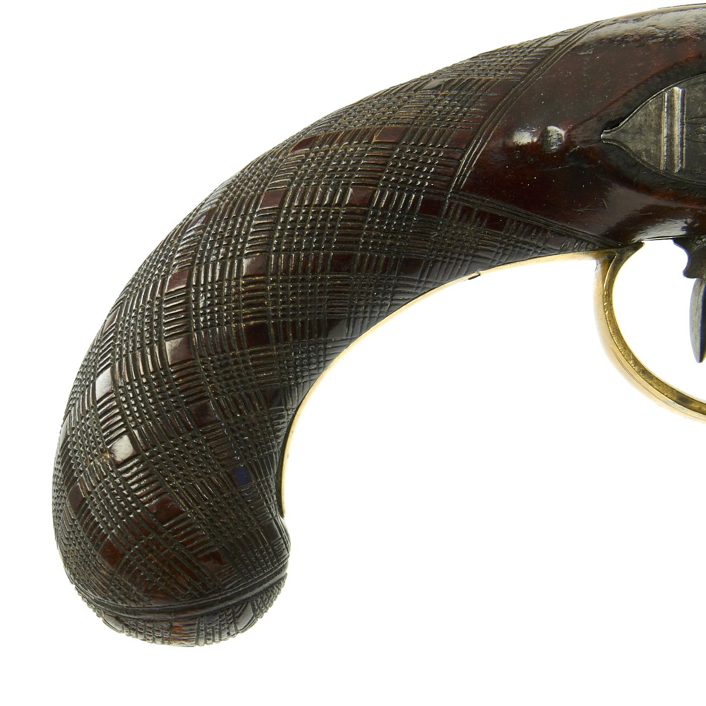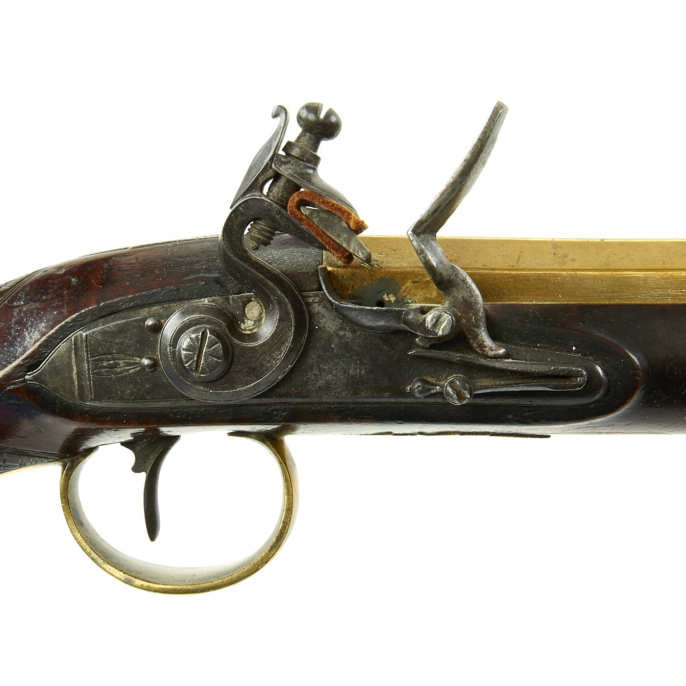 Original Item: Only One Available. This is a high quality British Flintlock pistol in just lovely condition, typical of “Private Purchase” weapons used by Officers. It features a half-octagonal 0.63” bore BRASS Barrel measuring 8", with the pistol being 14" in overall length. The pistol has brass fittings, and does not have a butt cap. The high quality walnut wood stock is most impressively checkered in a most interesting design around the grip area. It also has a good amount of tiger stripe figuring on the left hand side.