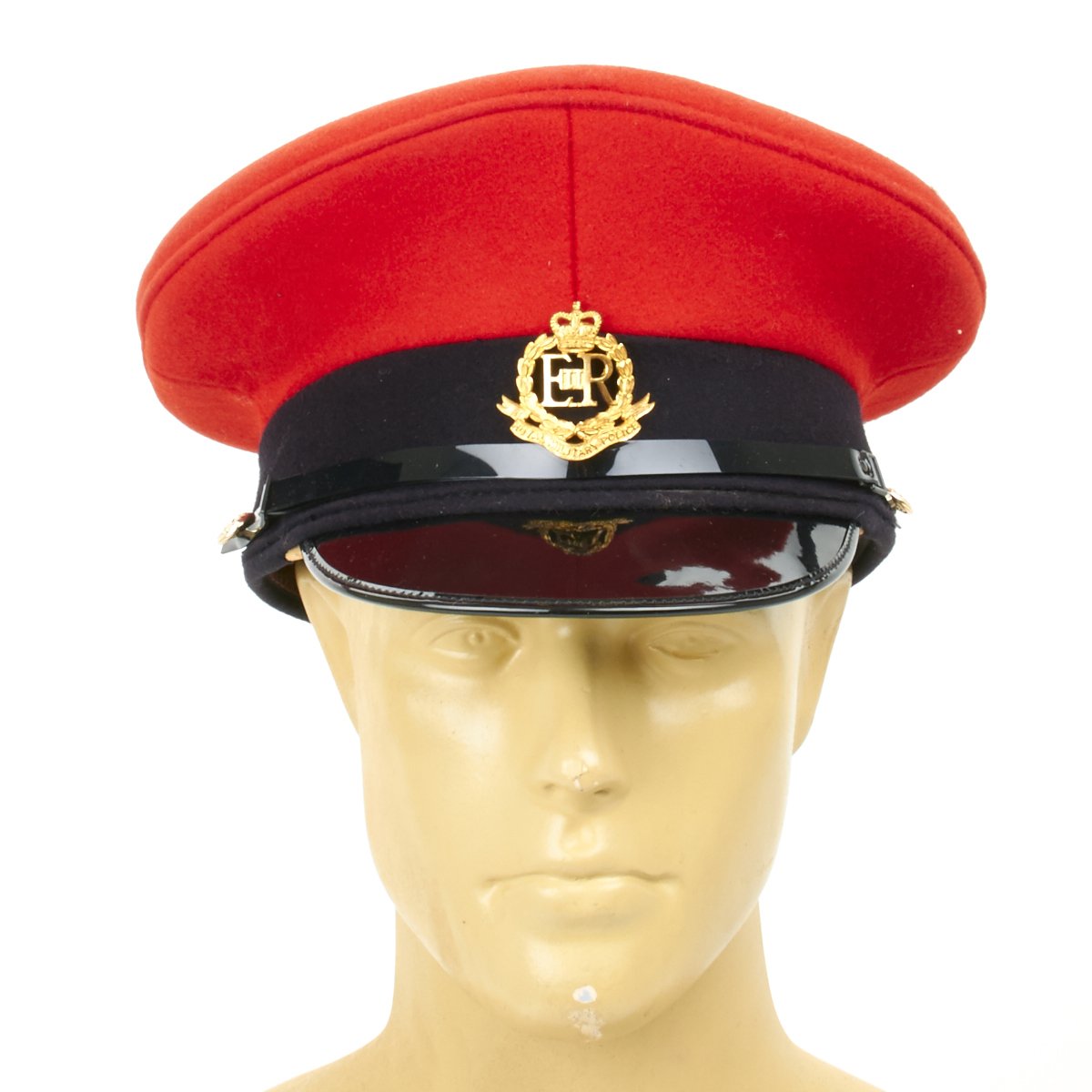 Original Item: Recently released from the British Ministry of Defense, these are original, virtually un-issued, Red Royal Military Police peaked service caps complete with gilt ER II Regimental Cap Badge. Wool construction with patten leather visor and leather sweatband.