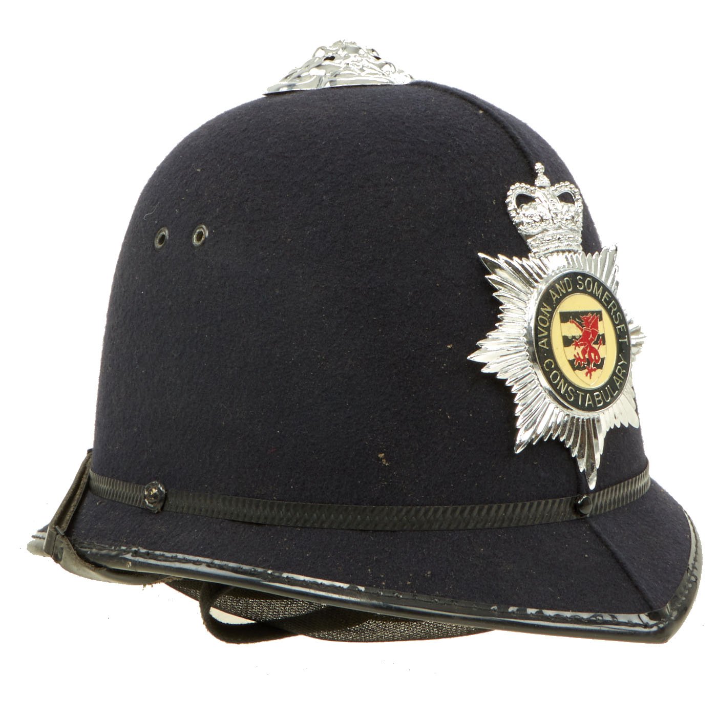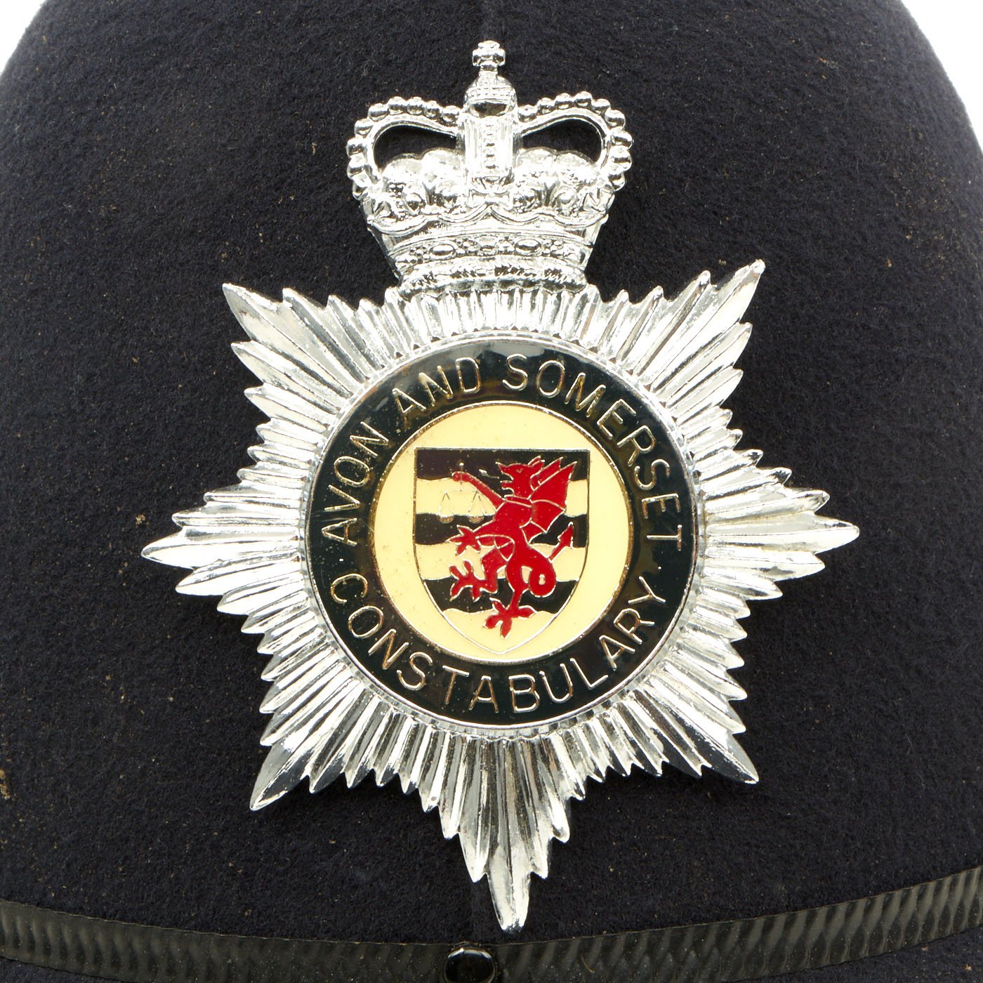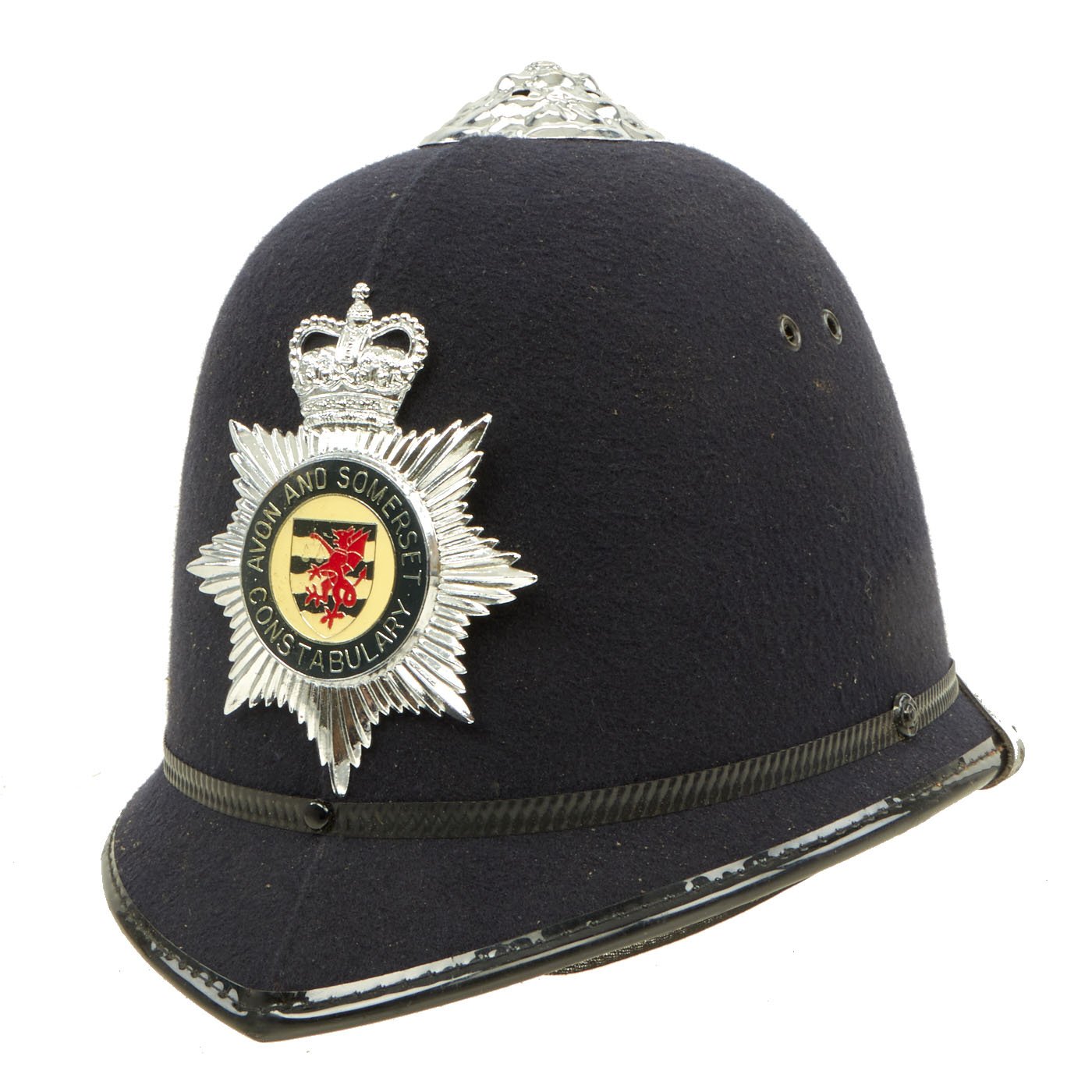 The enameled silver type Helmet plate bears the Heraldic Shield of the County of SOMERSET constabulary, in the striking colors of Blue and Red. The black enamel circle inside the starburst reads AVON AND SOMERSET CONSTABULARY, and the badge is surmounted by the correct "Queen's Crown" for Queen Elizabeth II. Condition is quite good, and the helmet still retains the liner and both chin straps. A great collector's item!