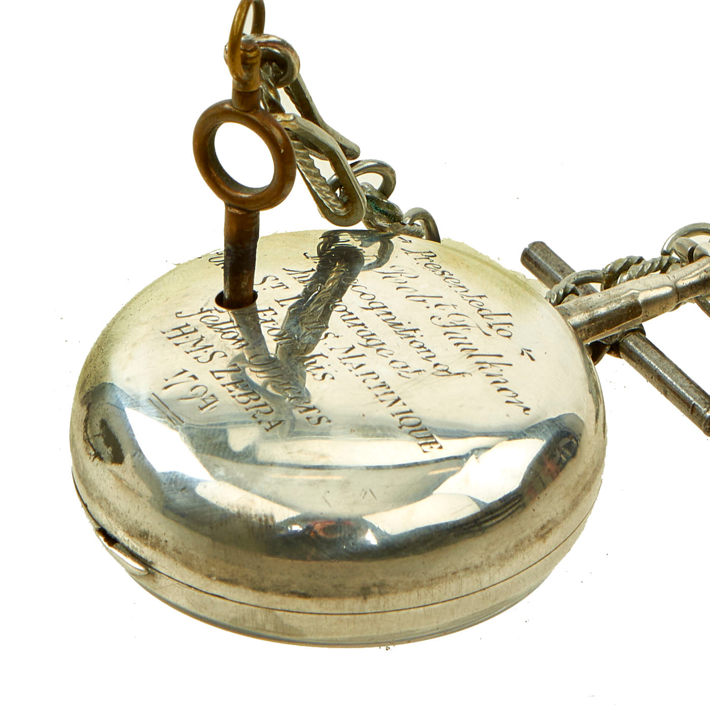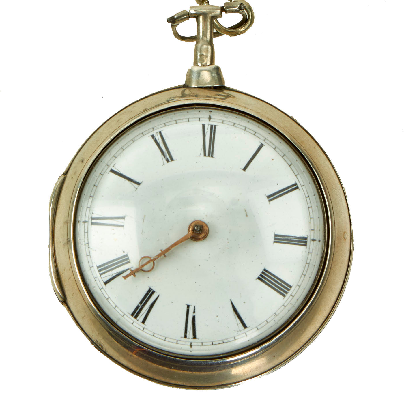 Original Item: One of a Kind. This silver cased watch comes with its outer AND inner covers both of Sterling Silver. The outer cover has some paper inside to protect the back of the watch, and under this are hallmarks which show the "Lion" Sterling Standard Mark, the "Crowned Leopard's Head" for London, and a letter "H", for 1803 production. There is also a maker mark of T G for Thomas Goslee of London, who registered his mark in 1790. Most likely the watch was kept as a memento by the family, as Robert part of the Faulknor Naval Dynasty, and often referred to as "Robert Faulknor the Younger". The case would help protect it, and it was possibly carried by one of his relatives during their own naval careers. Definitely some great research potential here!