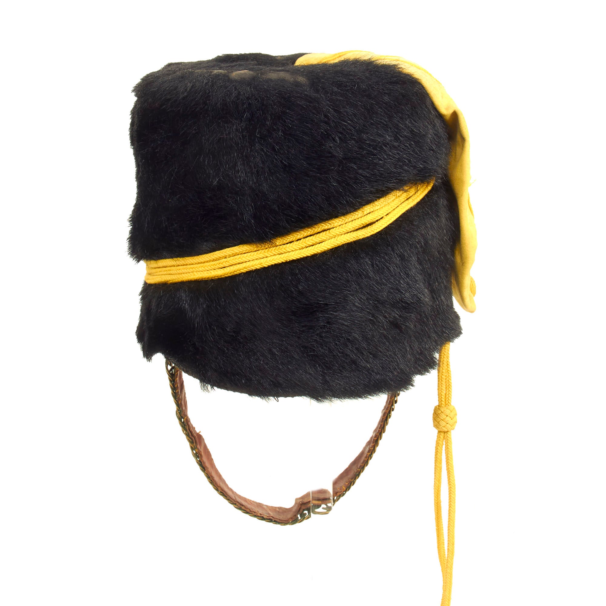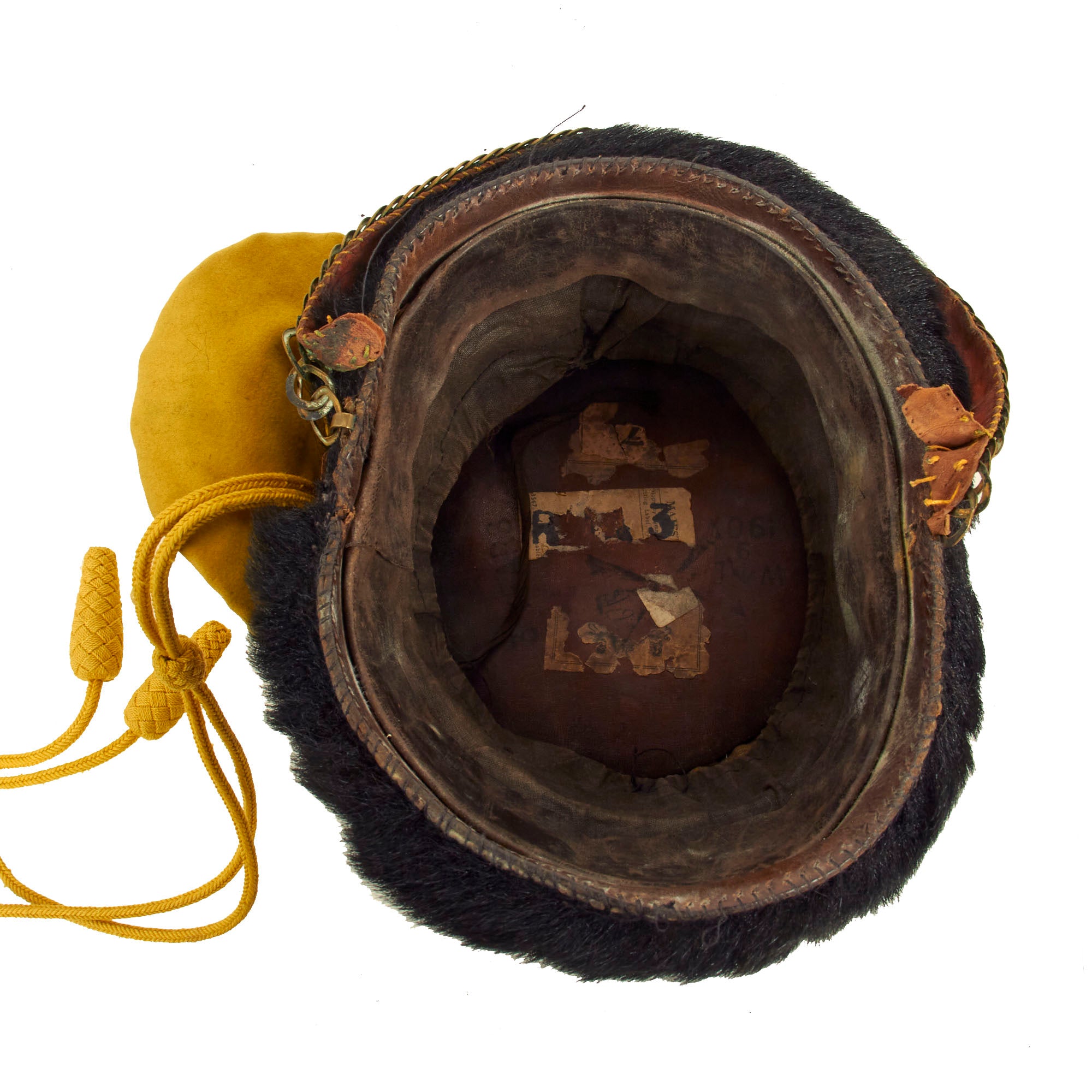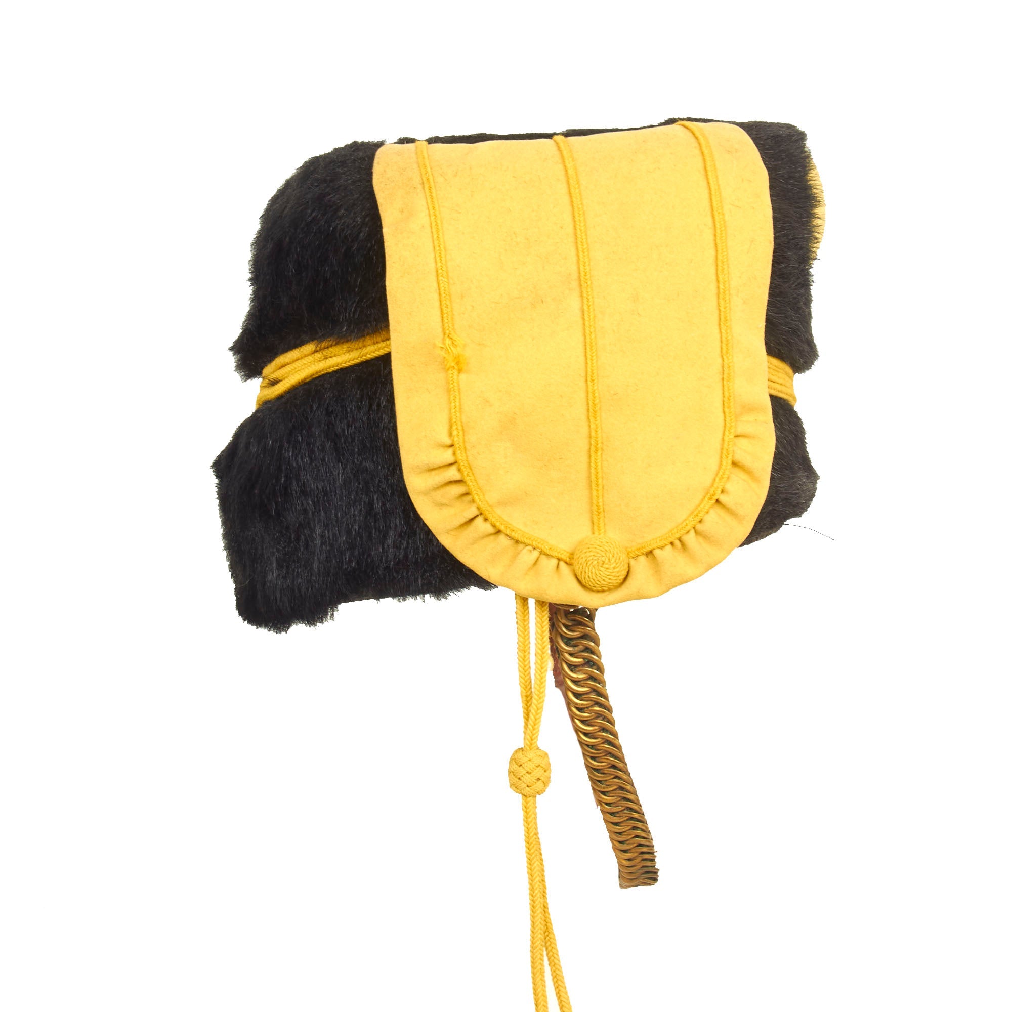 Original Item: Only One Available. This is a very beautiful genuine fur bearskin Busby used by the 4th Hussars, and has been ever since the infamous “Charge of the Light Brigade” in the 1850s. The helmet is complete with the symbolic right side “Yellow Bag” and yellow/gold cord surrounding, without chin scales and yellow cockade. Size is approximately a US 7 1/4.
