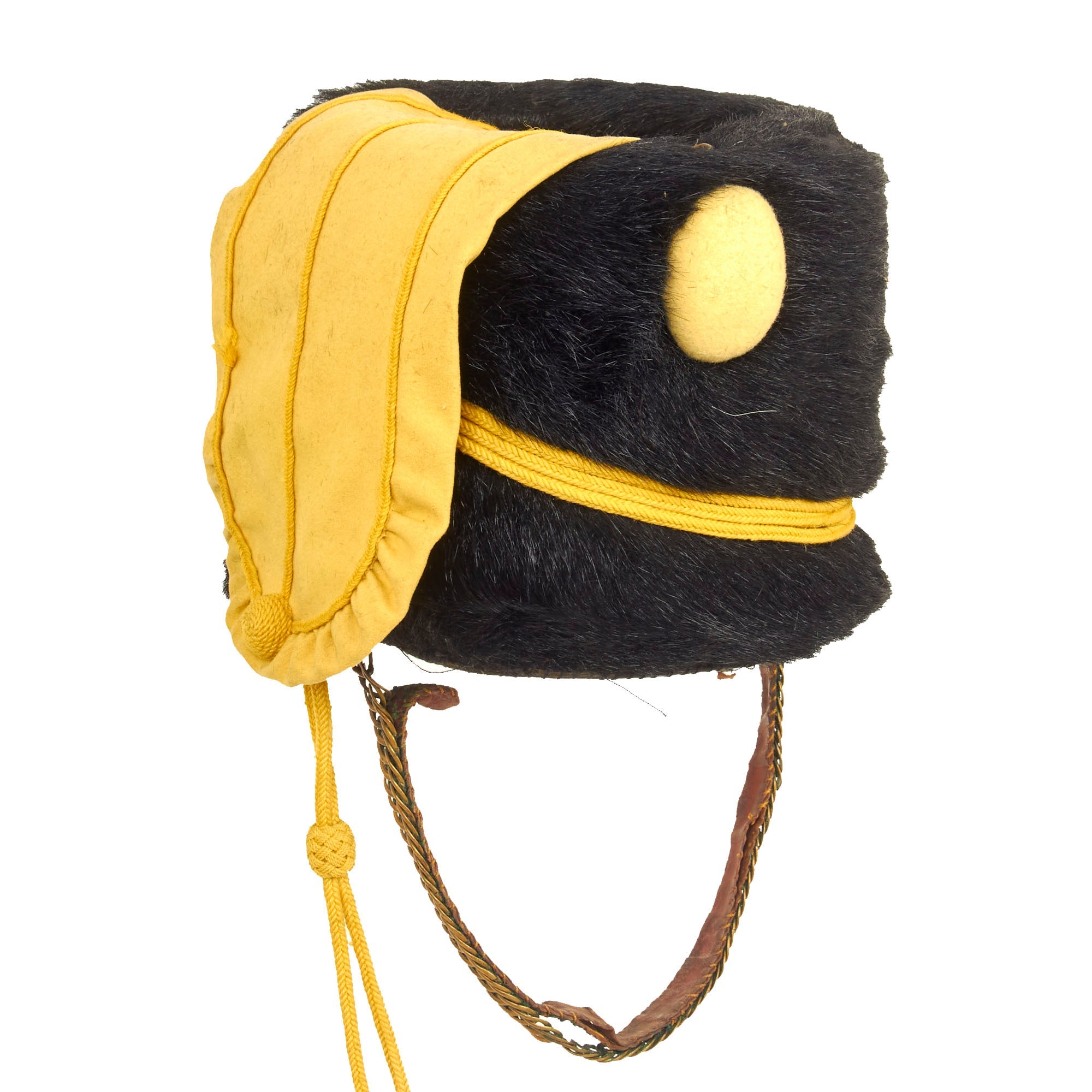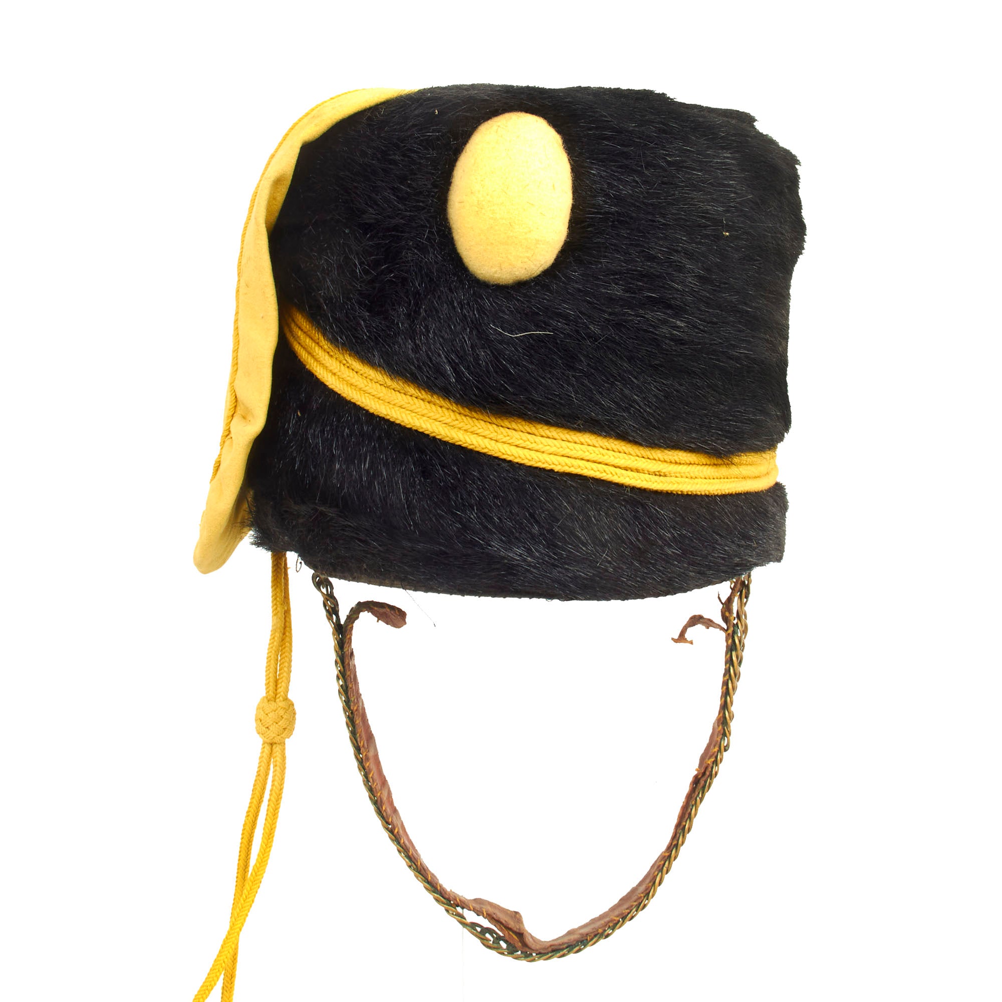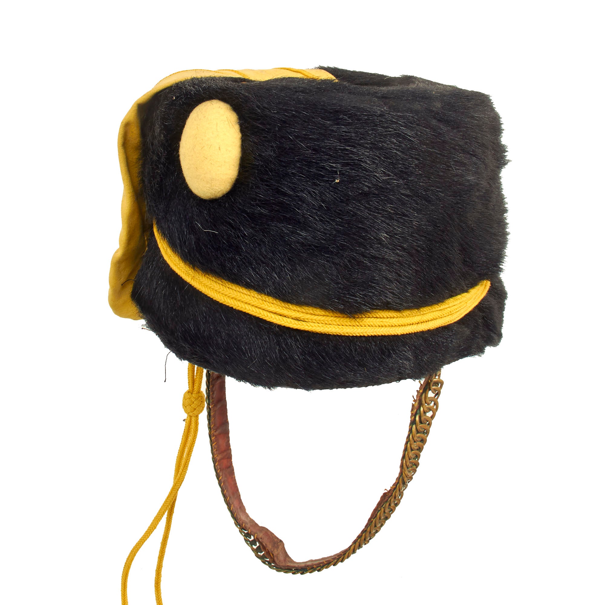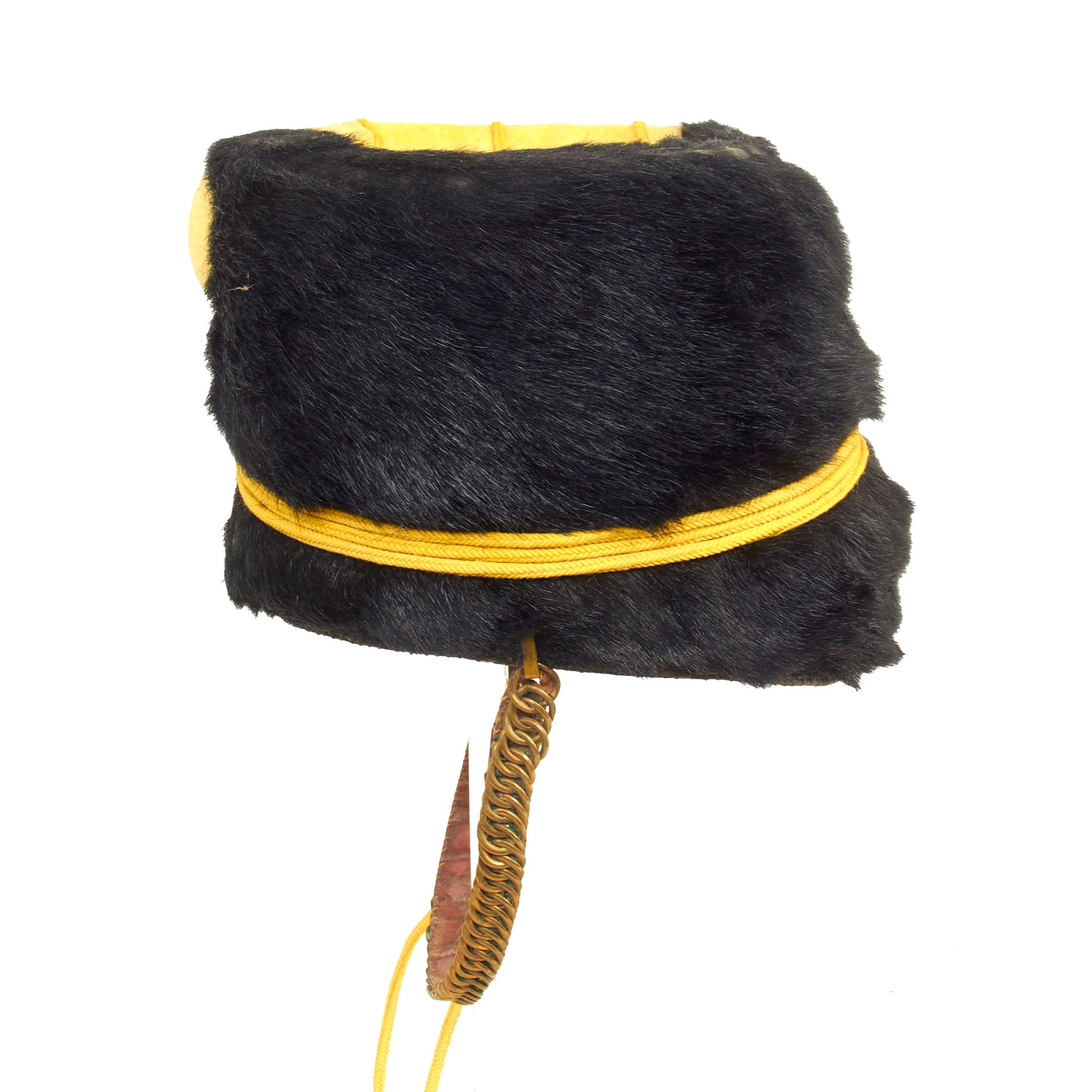 Original Item: Only One Available. This is a very beautiful genuine fur bearskin Busby used by the 4th Hussars, and has been ever since the infamous “Charge of the Light Brigade” in the 1850s. The helmet is complete with the symbolic right side “Yellow Bag” and yellow/gold cord surrounding, without chin scales and yellow cockade. Size is approximately a US 7 1/4.