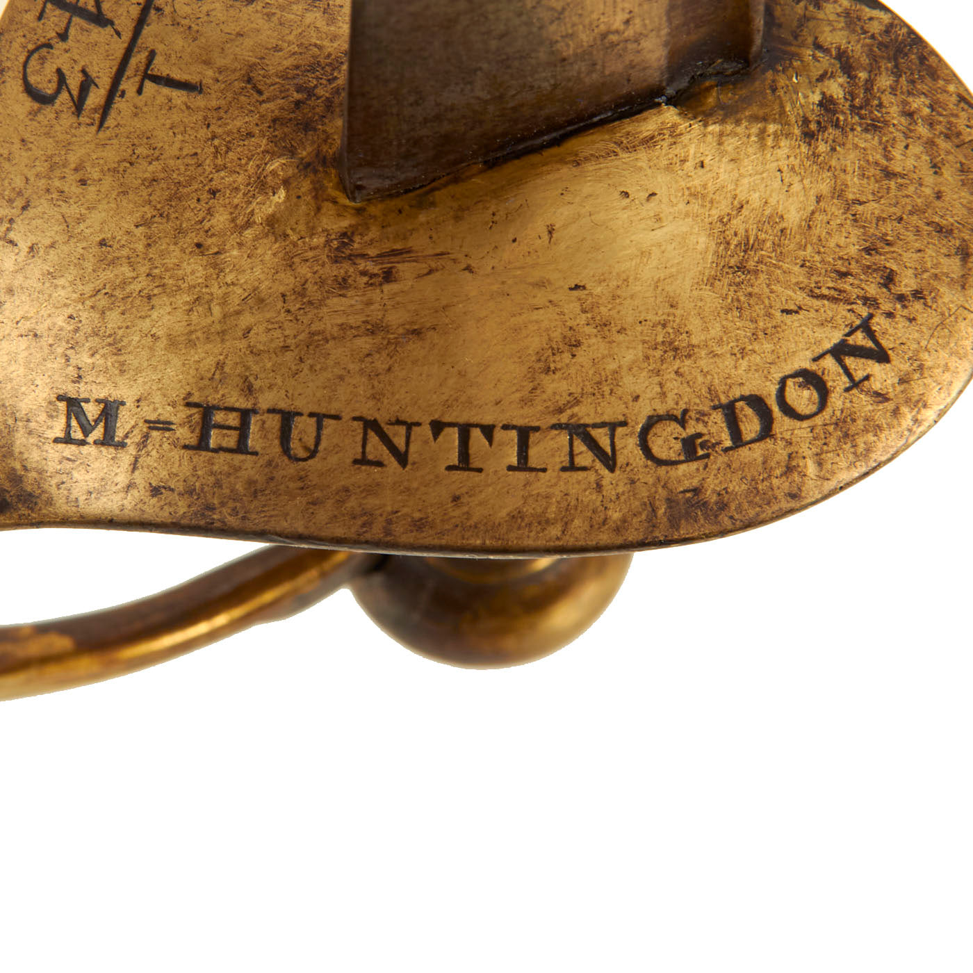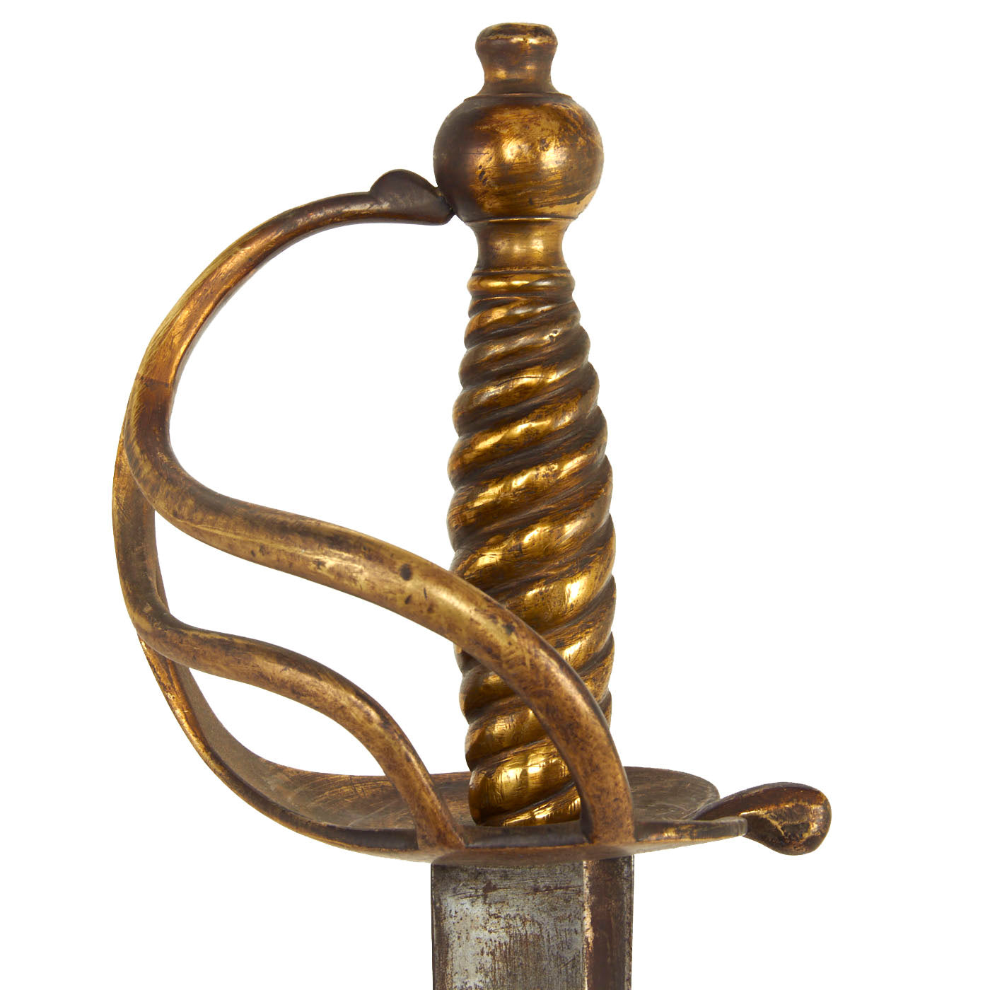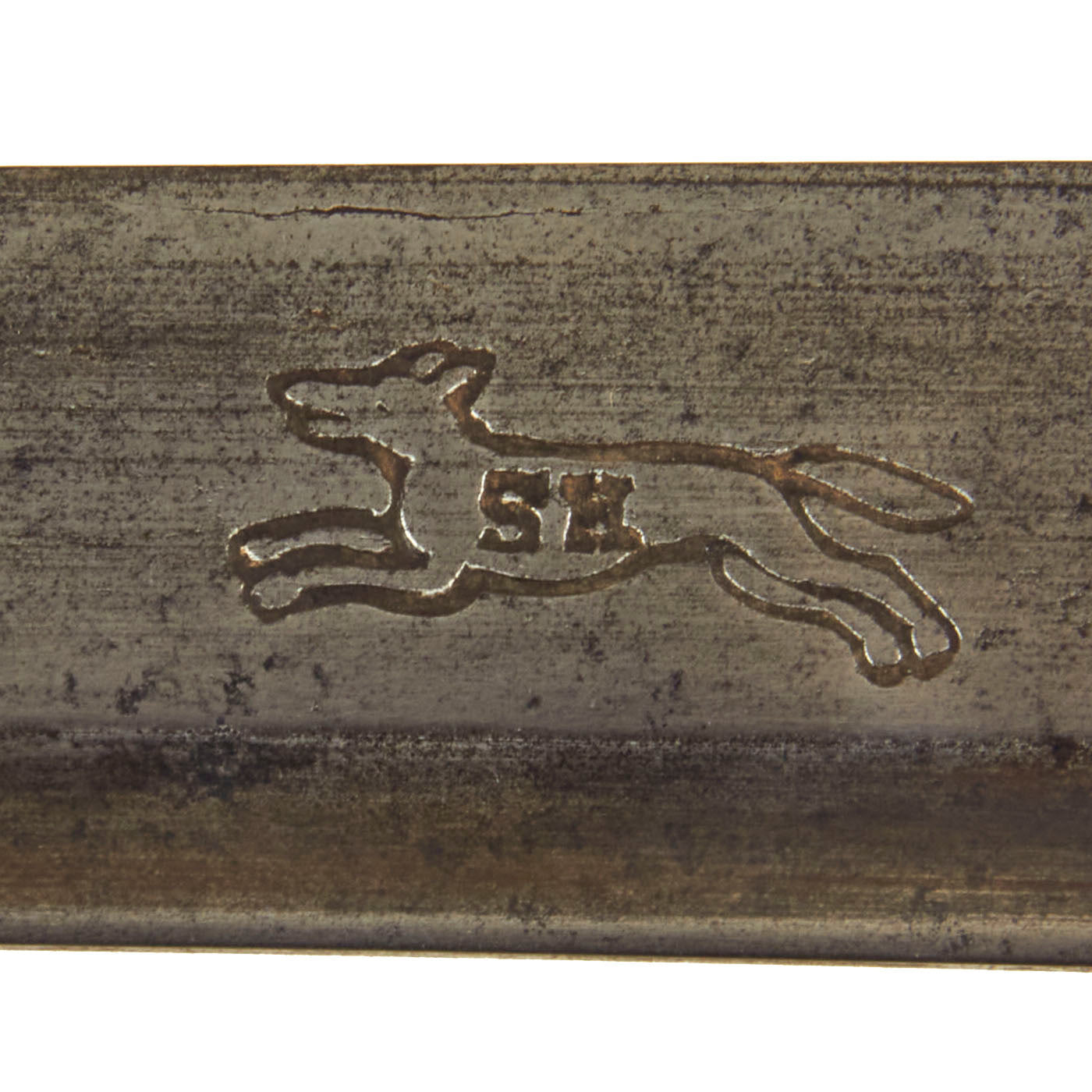 The brass three bar guard is engraved 1 / 43 M=HUNTINGDON, indicating that it was from the First Company of the 43rd Regiment of Foot, Huntingdon Militia. The blade is slightly curved with a single narrow fuller down each side near the spine, and there is an unmistakable British Military manufacturer mark punched into both sides of the 25" blade. The markings are a “Running Wolf” with the initials SH on the body, for maker Samuel Harvey, a cutler that looks to have been based on Birmingham in the 18th century. His markings have been seen on other similar militia hangers of the period. Overall condition is very nice with a great look.