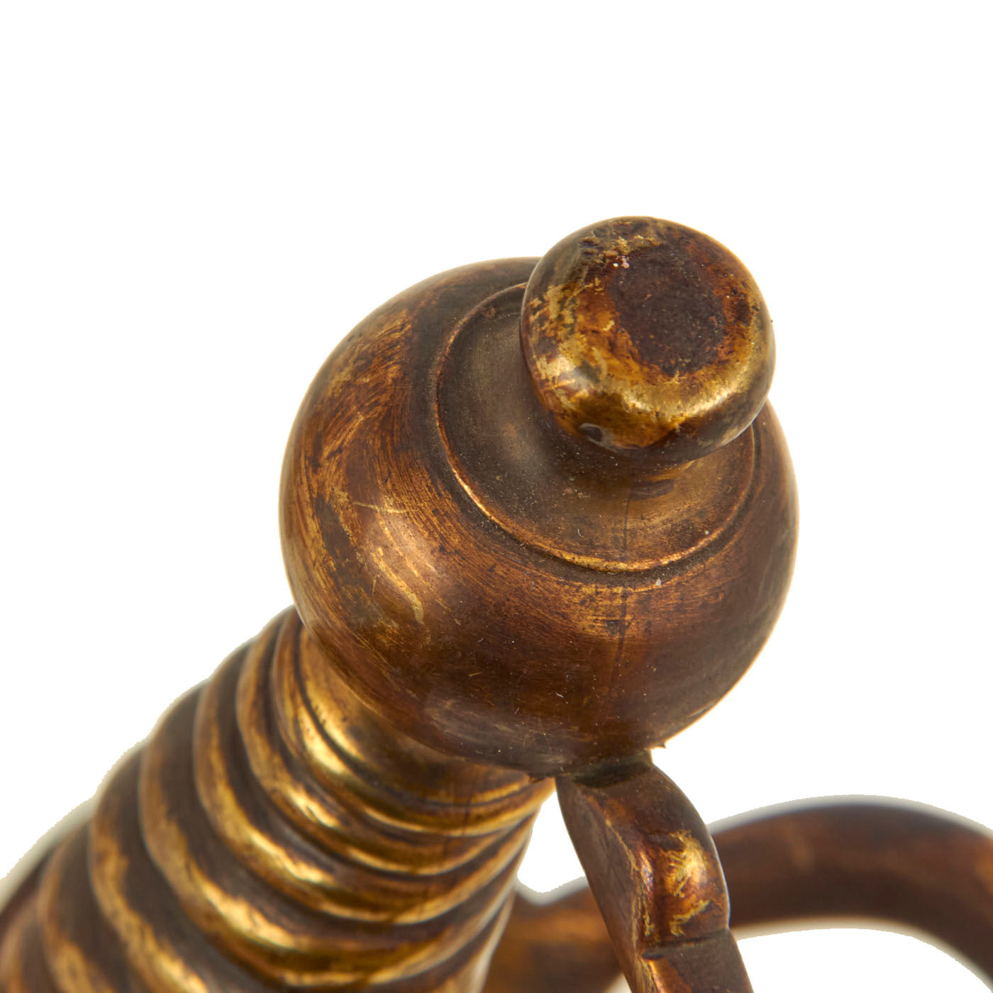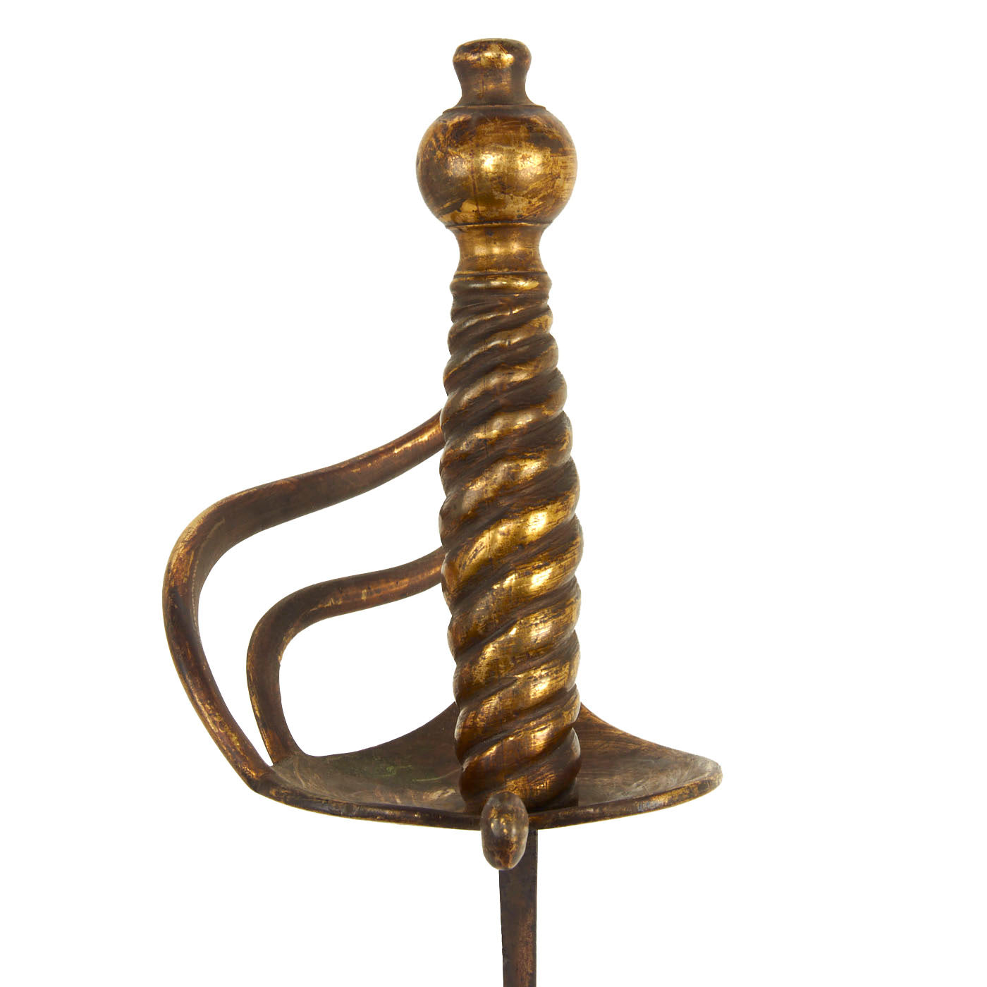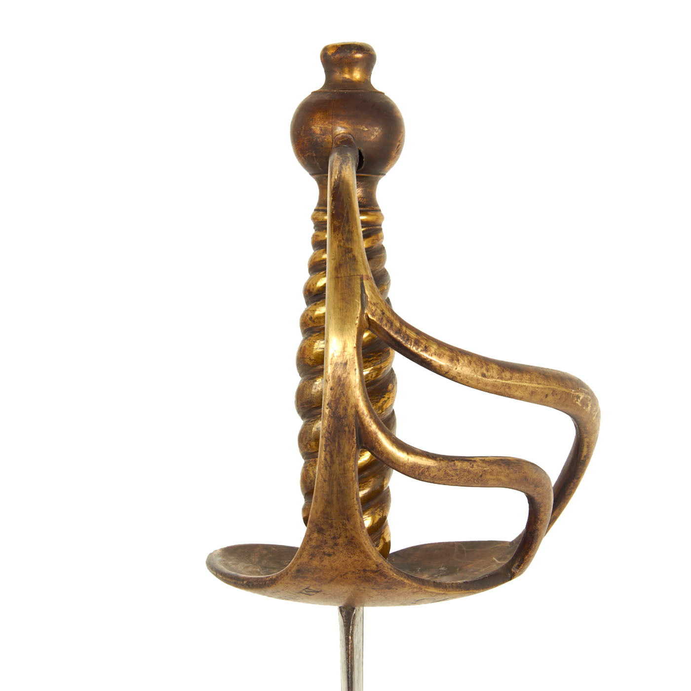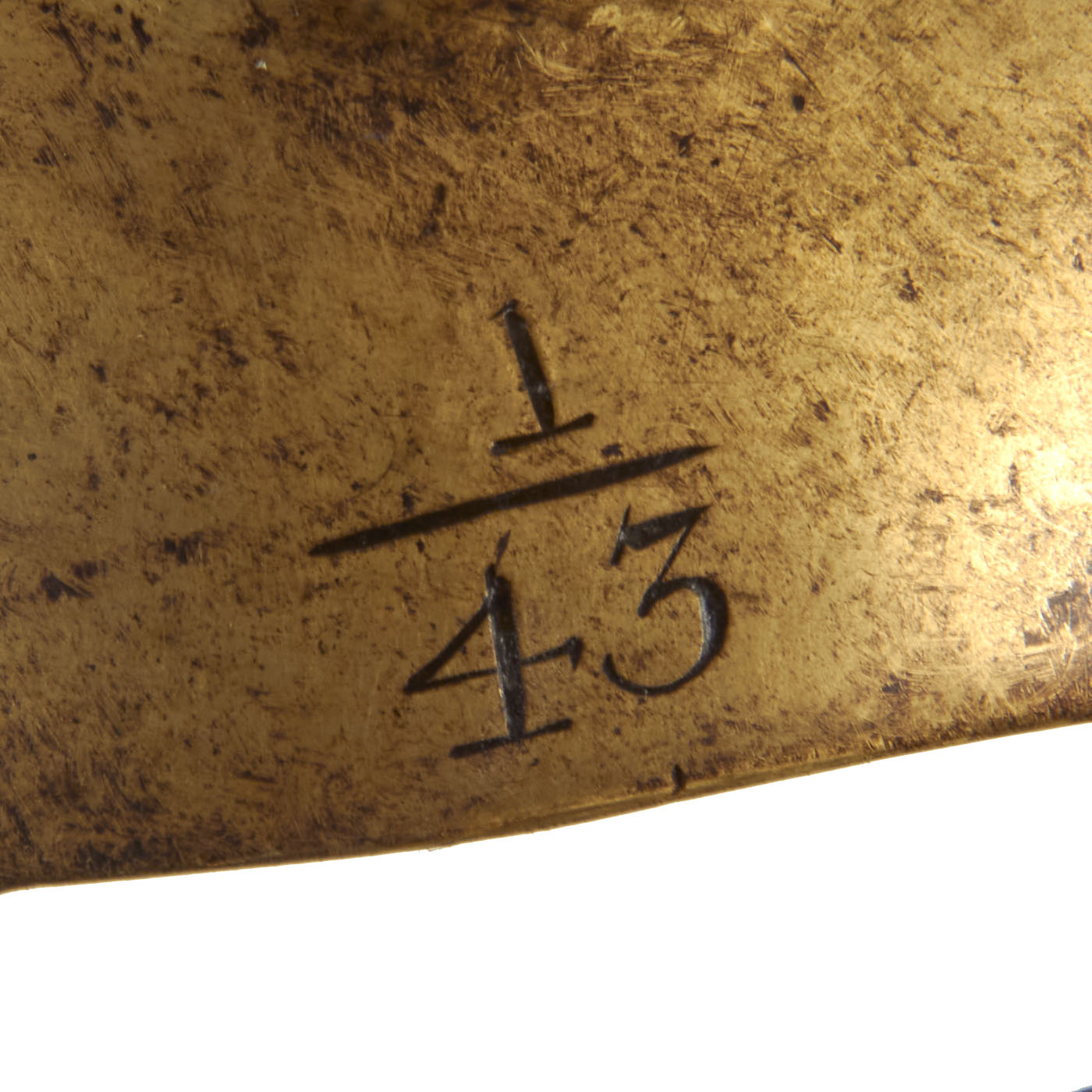 The brass three bar guard is engraved 1 / 43 M=HUNTINGDON, indicating that it was from the First Company of the 43rd Regiment of Foot, Huntingdon Militia. The blade is slightly curved with a single narrow fuller down each side near the spine, and there is an unmistakable British Military manufacturer mark punched into both sides of the 25" blade. The markings are a “Running Wolf” with the initials SH on the body, for maker Samuel Harvey, a cutler that looks to have been based on Birmingham in the 18th century. His markings have been seen on other similar militia hangers of the period. Overall condition is very nice with a great look.