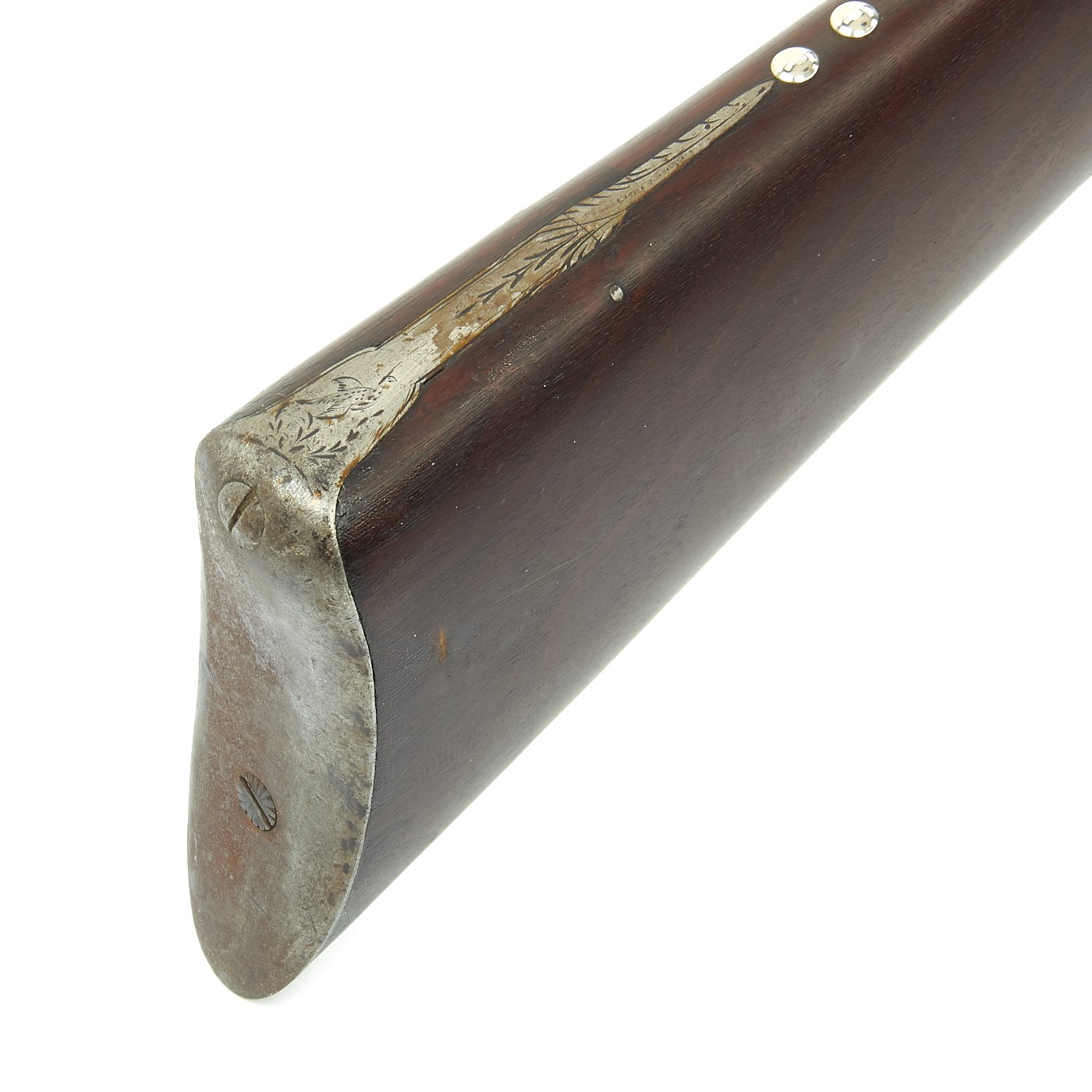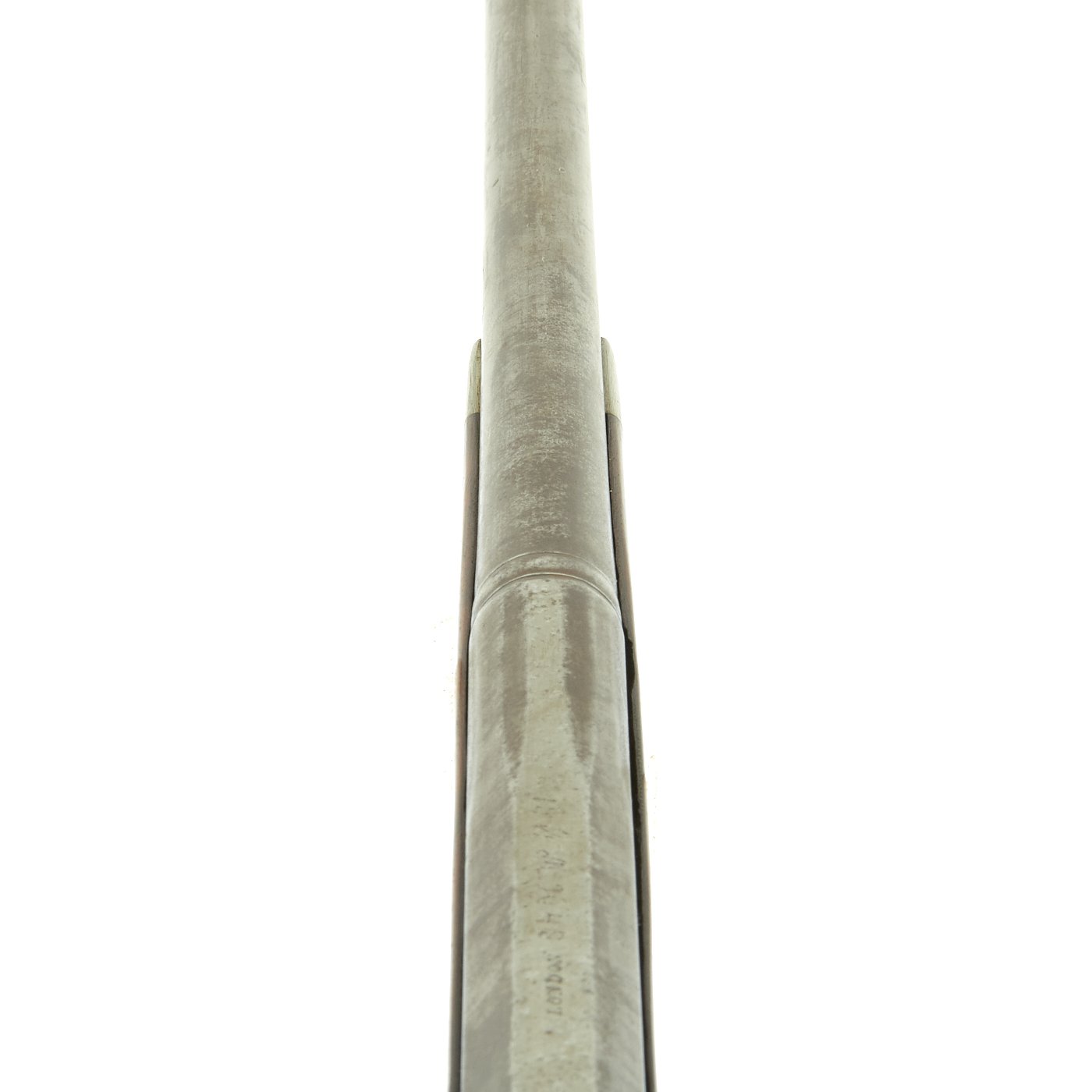 The 31 inch long barrel is octagonal for the first third of the way up the barrel turning to round on up to the muzzle. The Walnut stock is exceptionally nice and the butt plate and trigger guard are engraved iron. The nose cap and escutcheon which appears under the stock are both silver or German silver. The lock is marked RICHD HOLLIS, and the top of the barrel is marked LONDON. There are also some personalized initials and numbers after this, but we are not able to decipher them.
