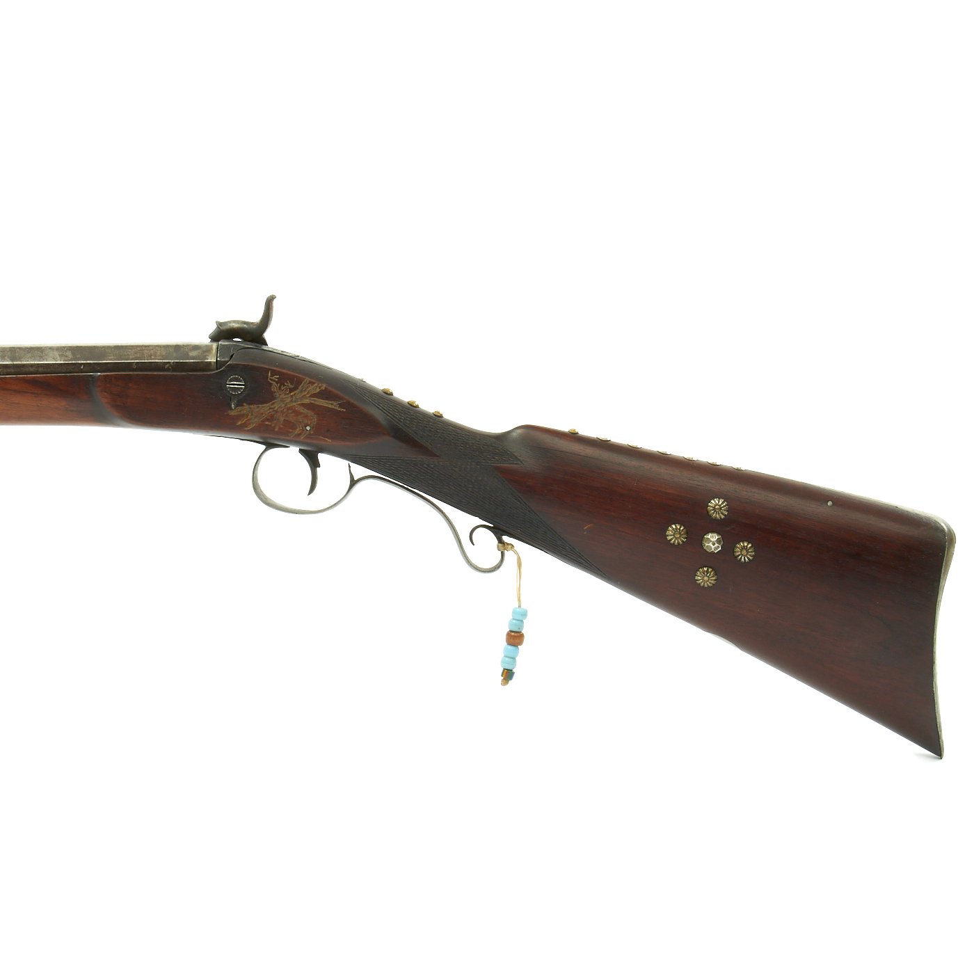 The left side of the lock has a carving of a Deer in a wood cut into it and the butt stock has some nickel thumb tacks added for decoration, perhaps the work of an American Indian. Lock functions but does not hold correctly at half cock. In basically truly nice condition, ready to display!