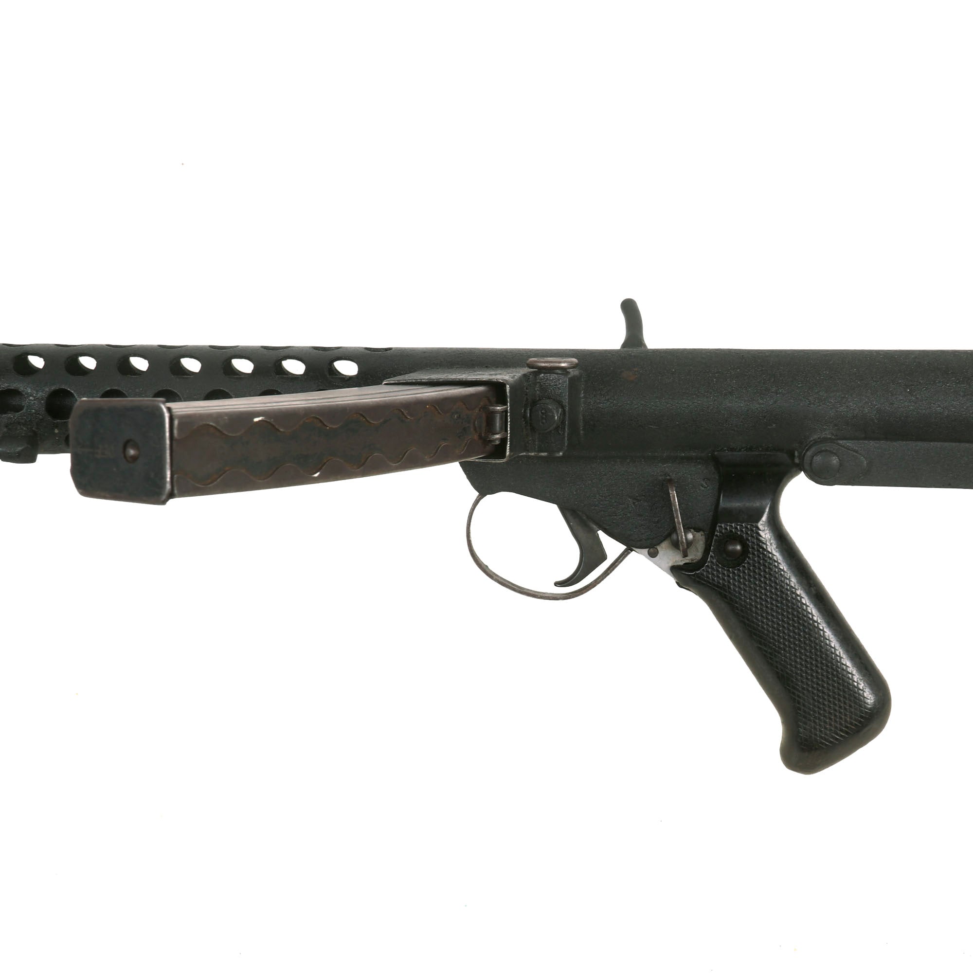 This display gun is superbly built from all original post WWII parts then fitted to the re-welded display receiver. It still has the complete markings mostly visible on the magazine well: