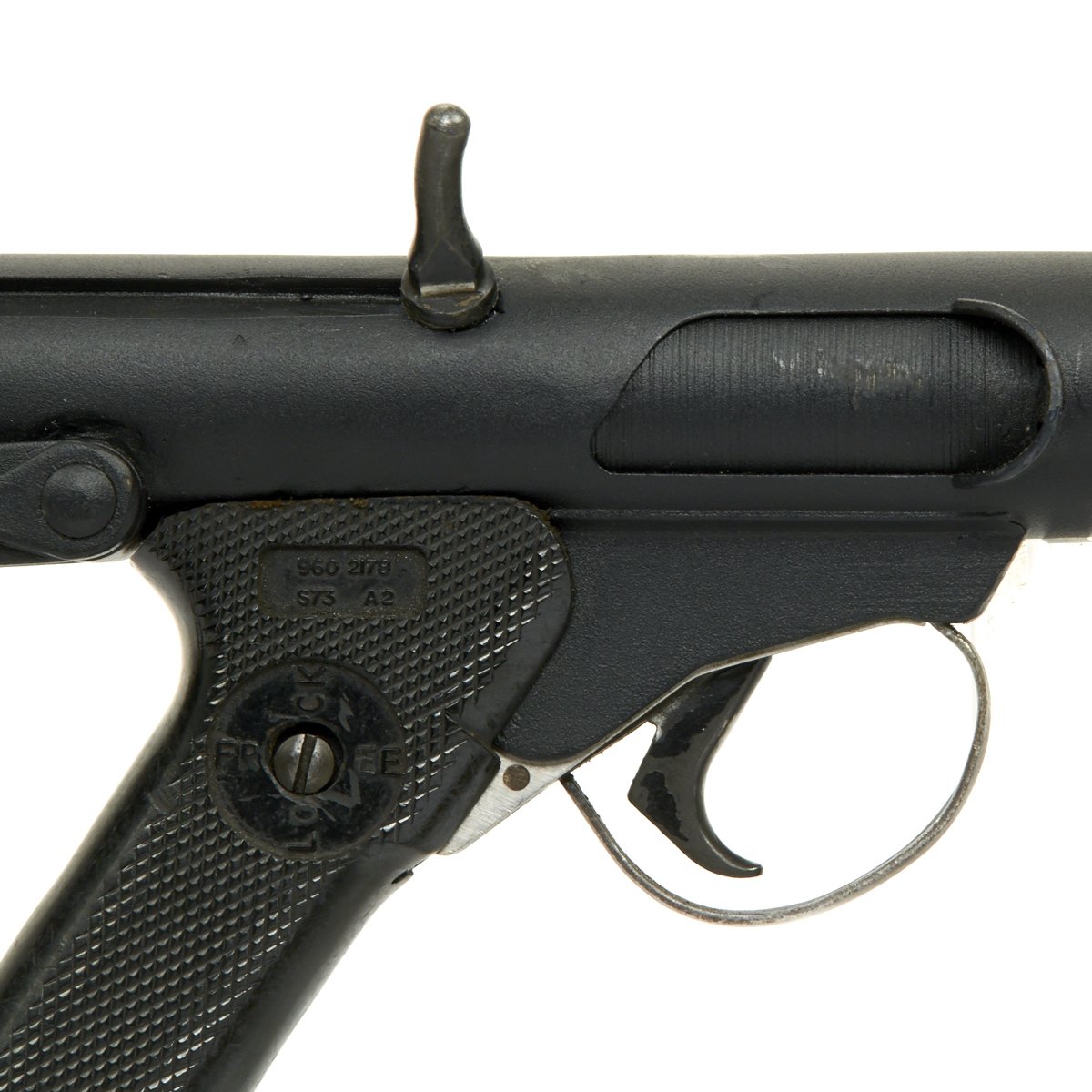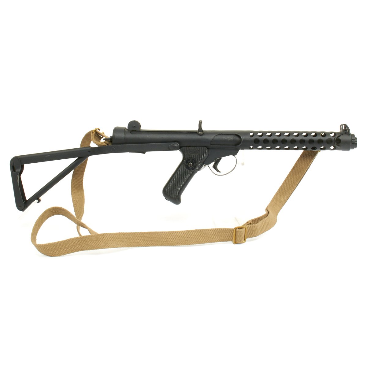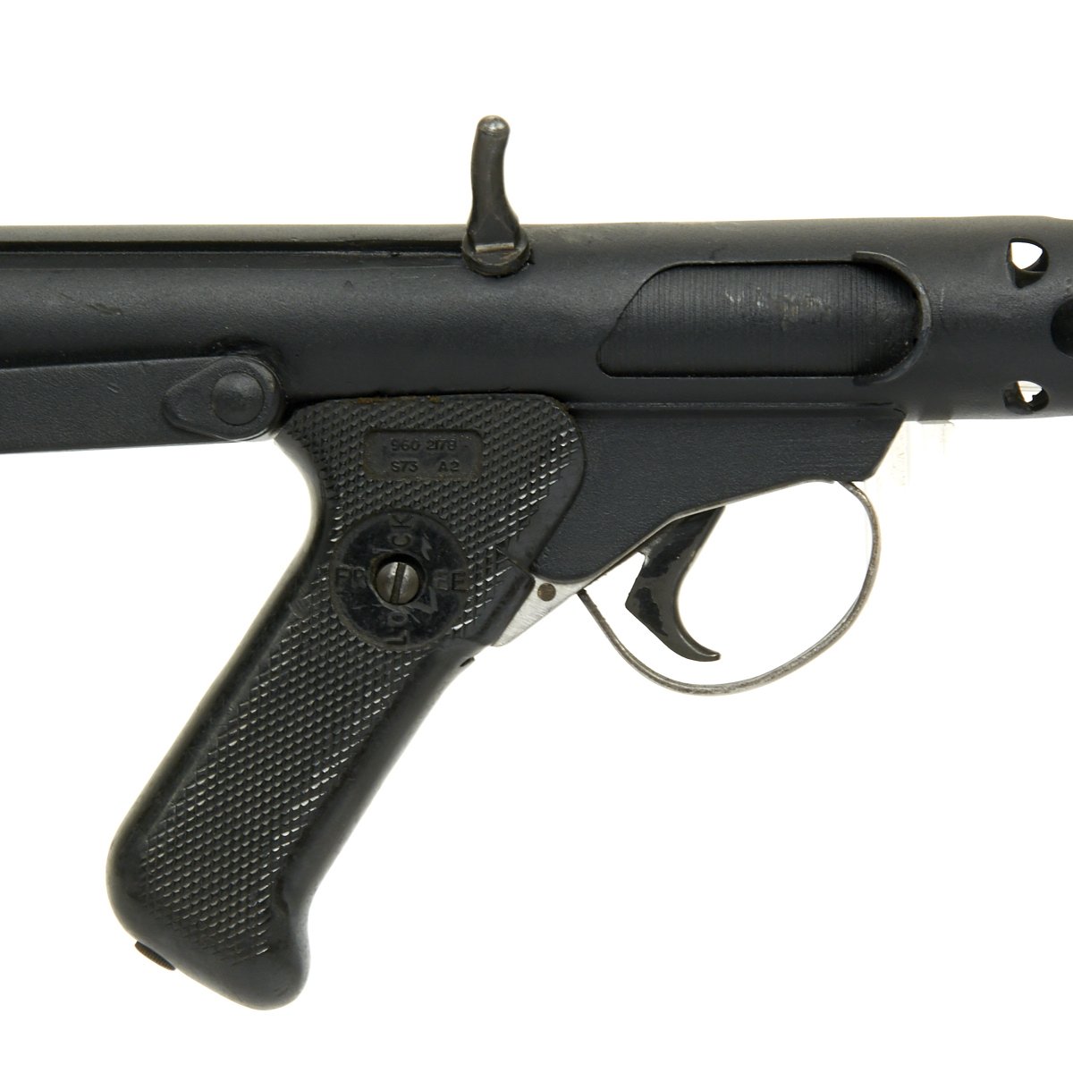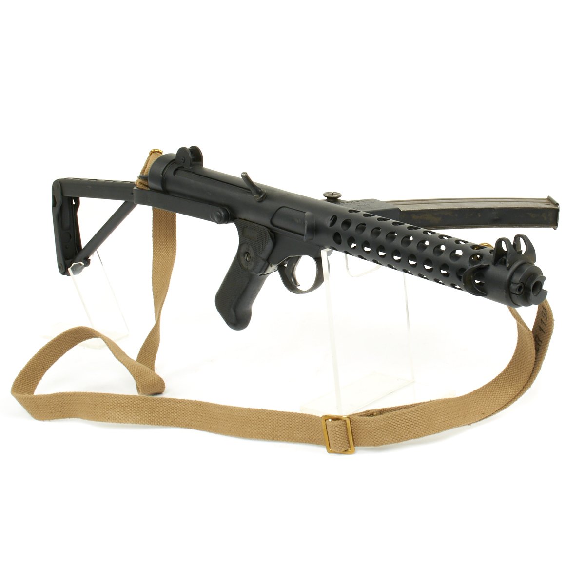 This display gun is superbly built from all original post WWII parts then fitted with a solid steel totally non-operational BATF approved display receiver, making it legal to own in the USA. Features of our exclusively built display gun include: correct "black crinkle" paint finish, fully operational folding stock, original markings, Serial No KR 112644, active trigger with satisfying "click", original 1956 dated sling, and it even comes complete with a curved Sterling 9mm Magazine (where permitted).