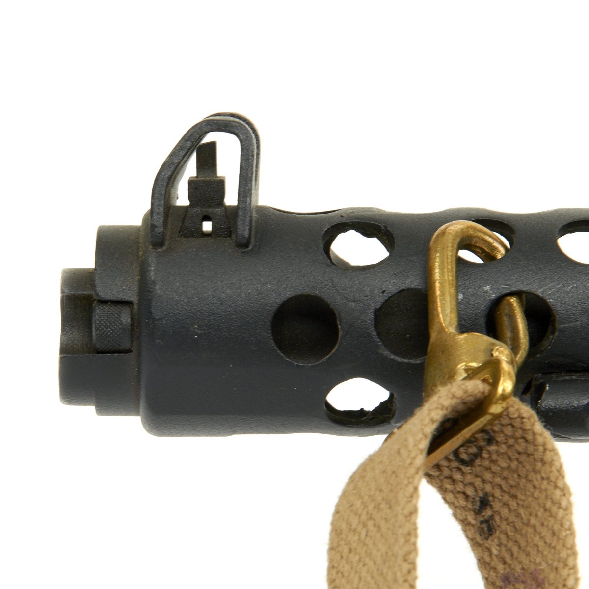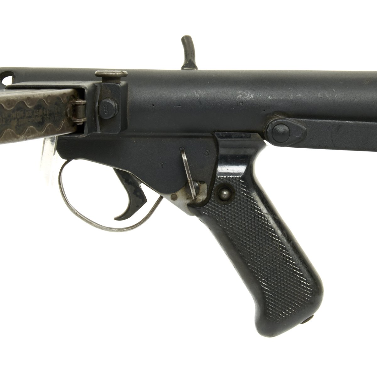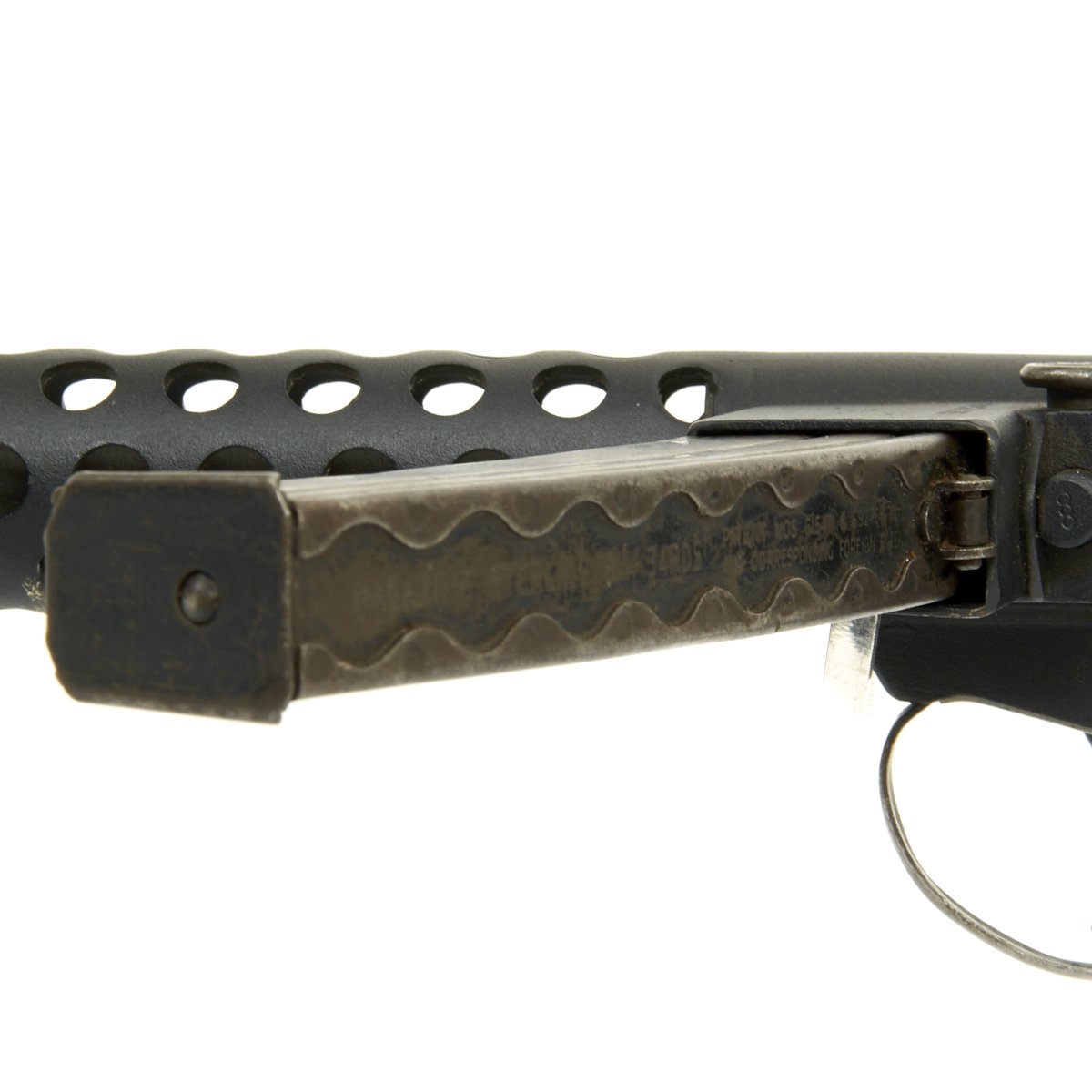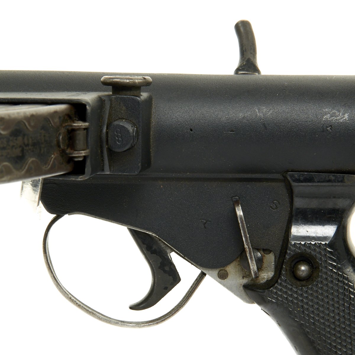 This display gun is superbly built from all original post WWII parts then fitted with a solid steel totally non-operational BATF approved display receiver, making it legal to own in the USA. Features of our exclusively built display gun include: correct "black crinkle" paint finish, fully operational folding stock, original markings, Serial No KR 112644, active trigger with satisfying "click", original 1956 dated sling, and it even comes complete with a curved Sterling 9mm Magazine (where permitted).