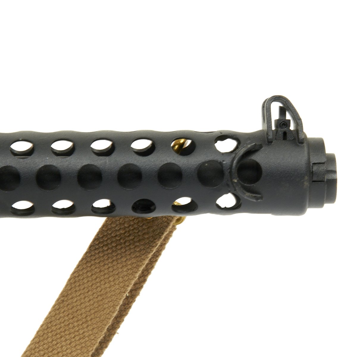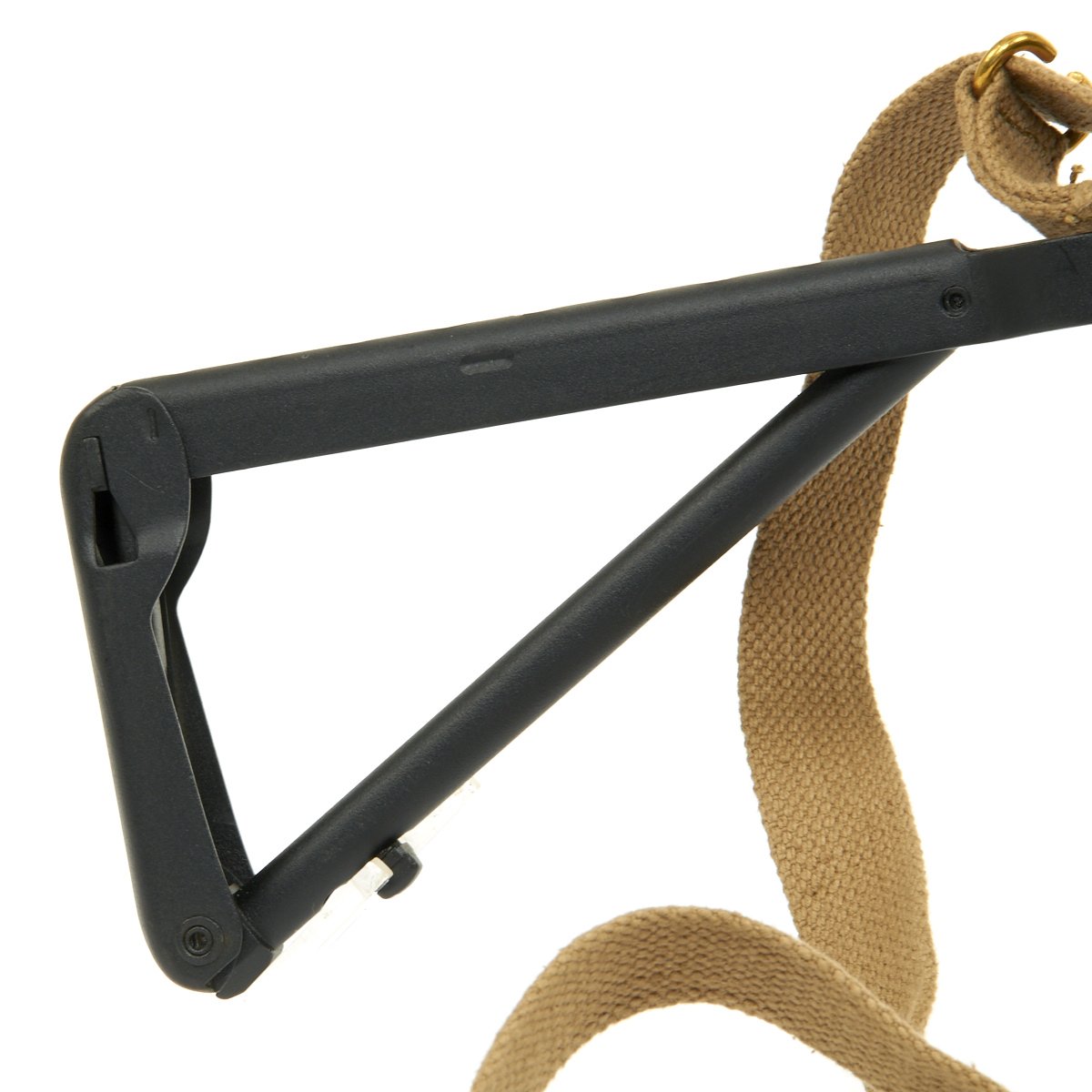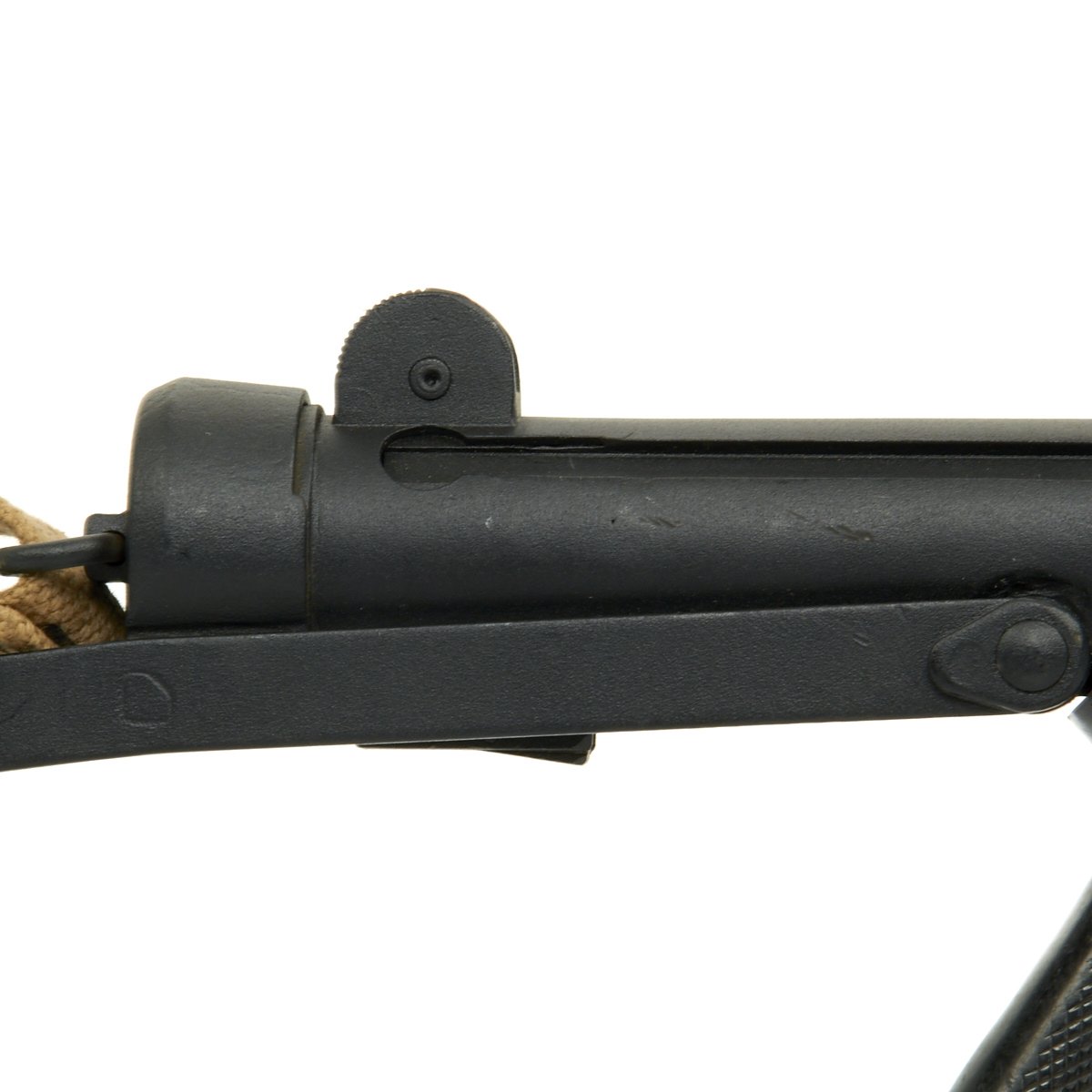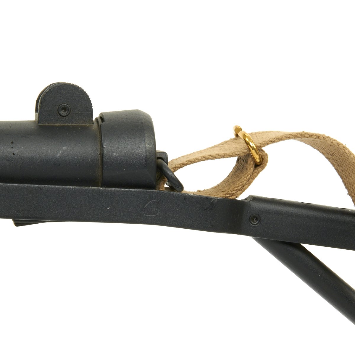 This display gun is superbly built from all original post WWII parts then fitted with a solid steel totally non-operational BATF approved display receiver, making it legal to own in the USA. Features of our exclusively built display gun include: correct "black crinkle" paint finish, fully operational folding stock, original markings, Serial No KR 112644, active trigger with satisfying "click", original 1956 dated sling, and it even comes complete with a curved Sterling 9mm Magazine (where permitted).