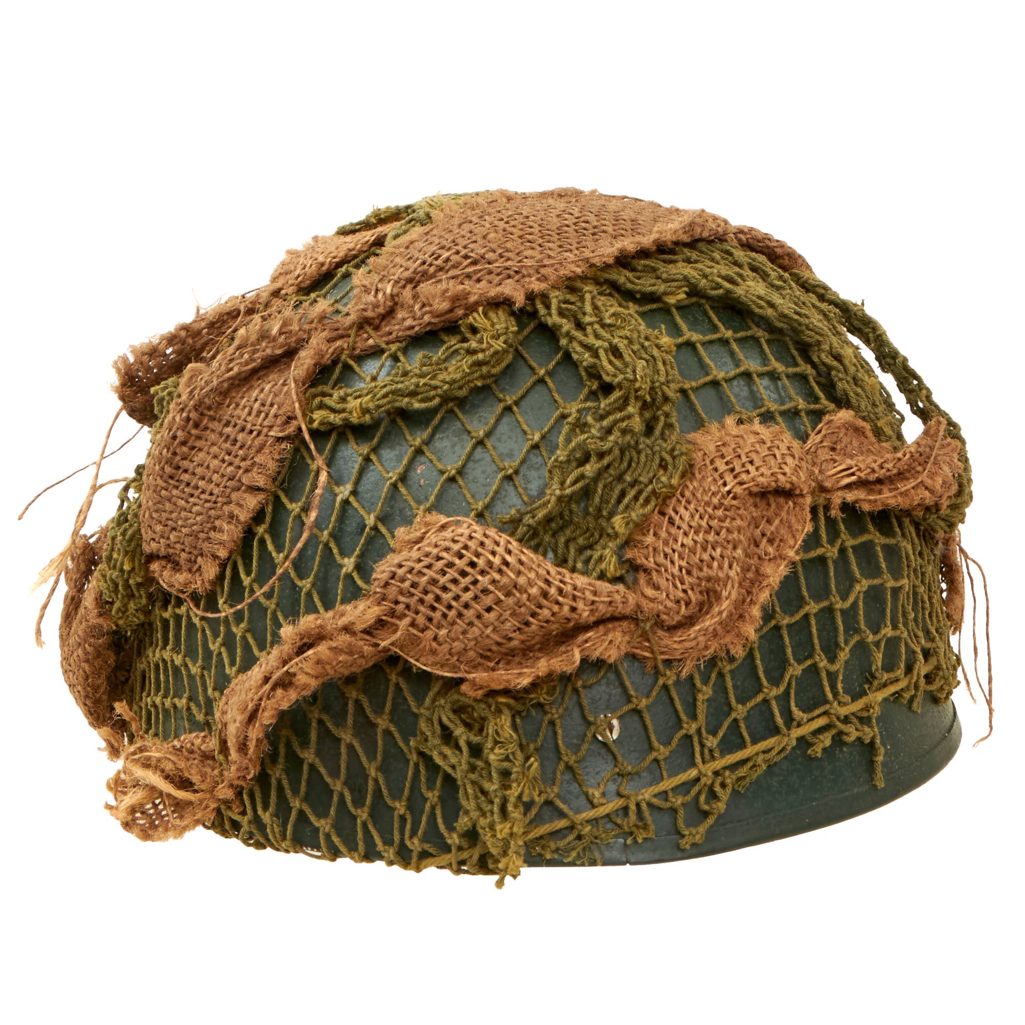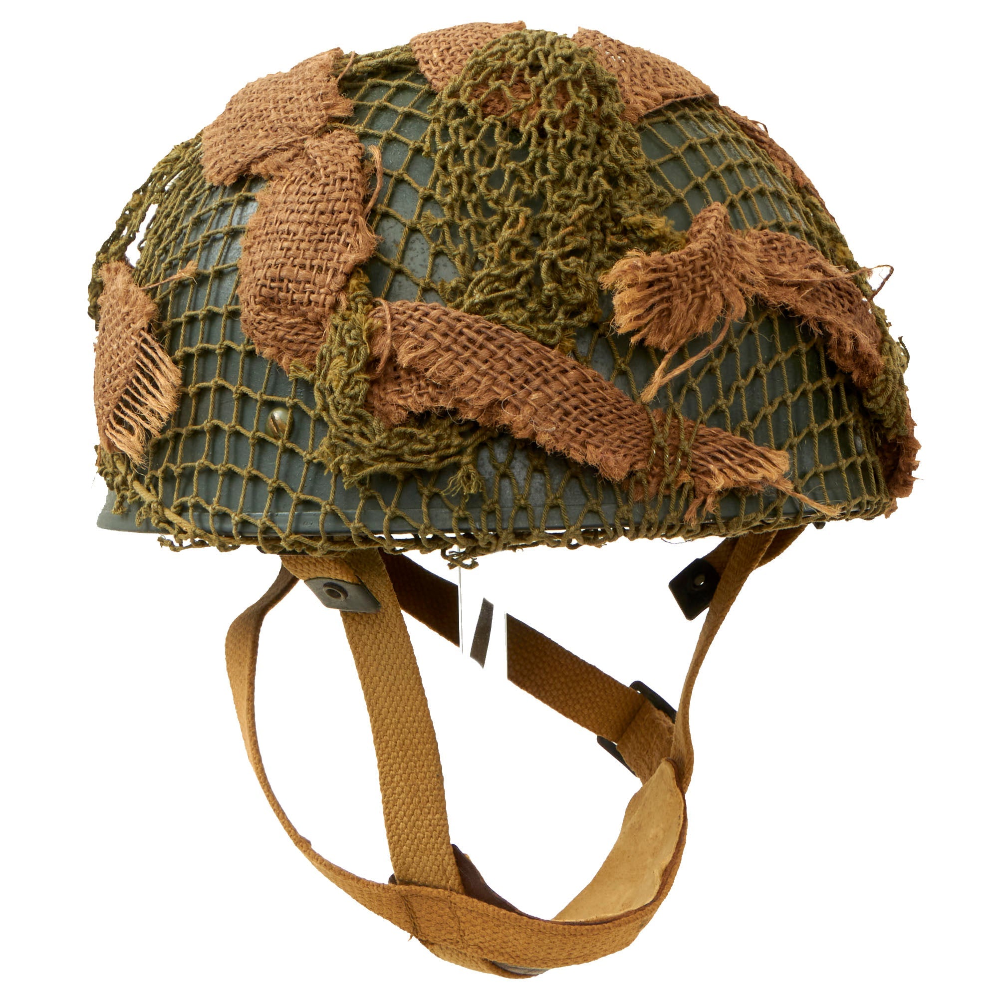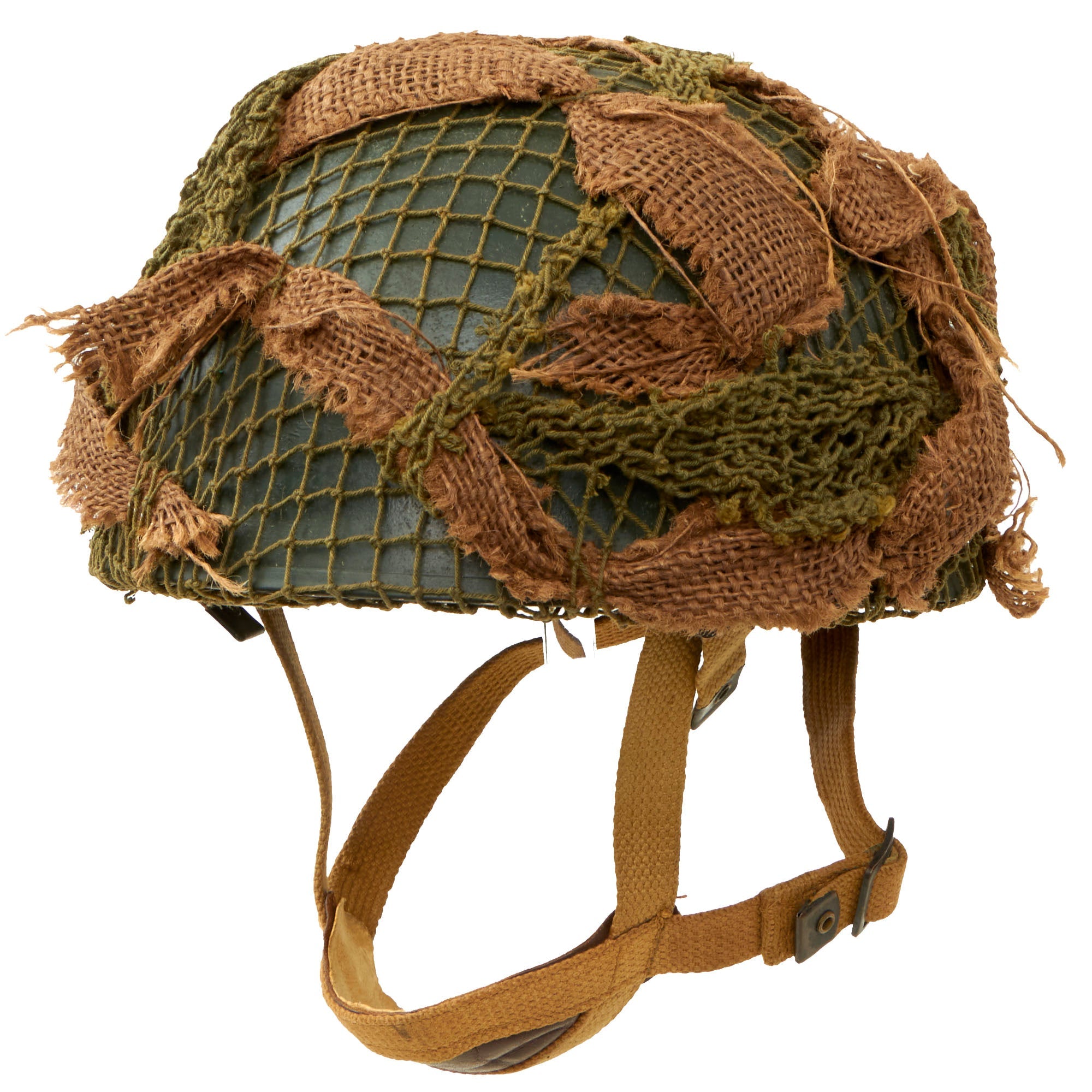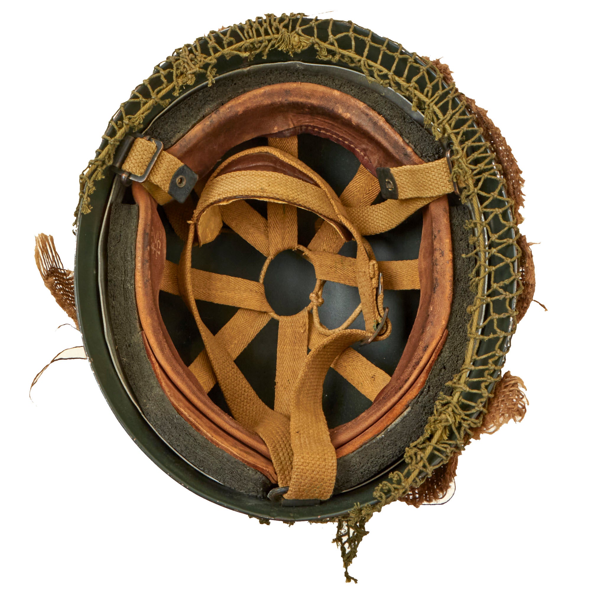 The chinstrap and leather cup are present and in great condition. The helmet retains nearly all of its original factory applied exterior paint. What makes this helmet truly exceptional is the camouflage net with integrated burlap over the helmet, most likely done for this Operation Musketeer.