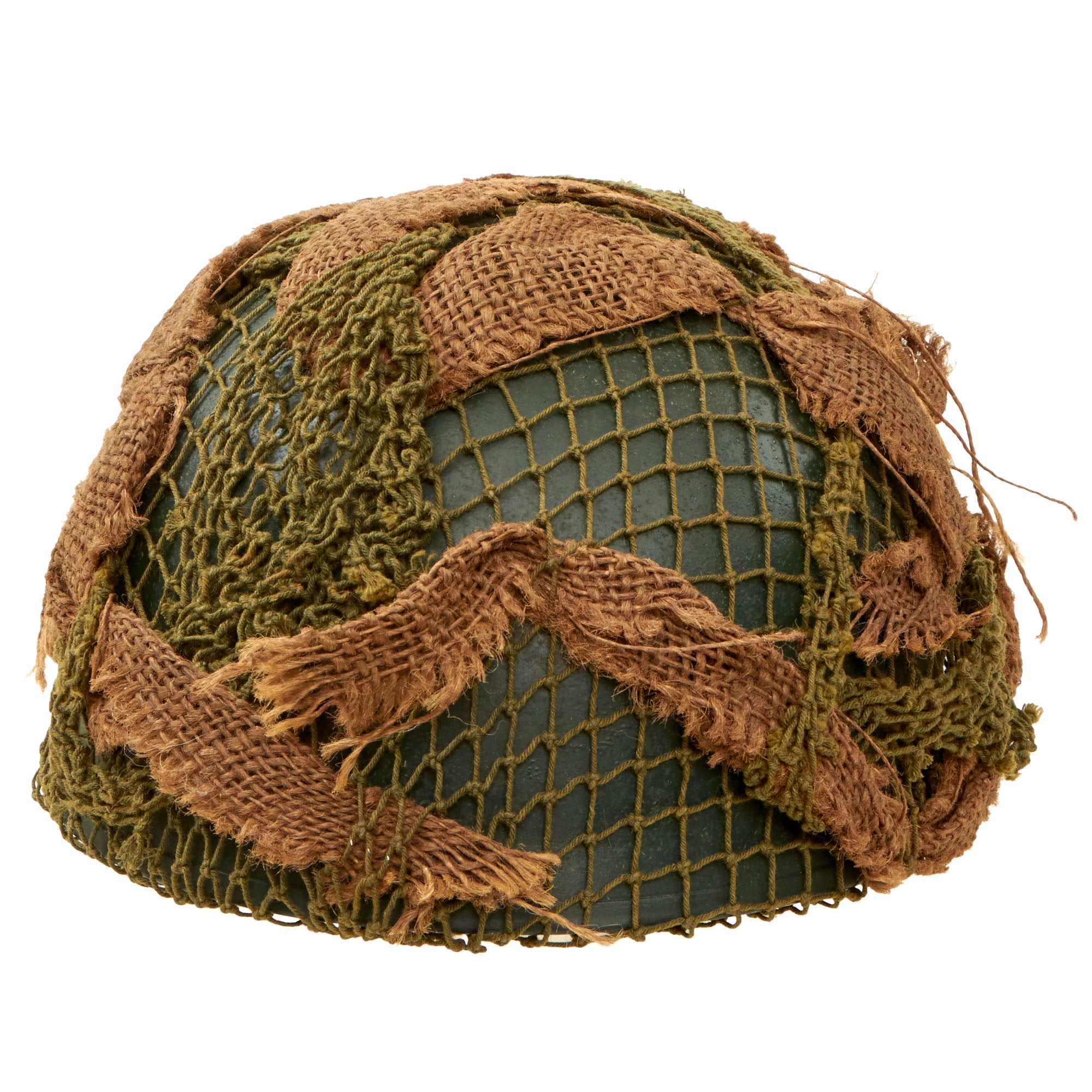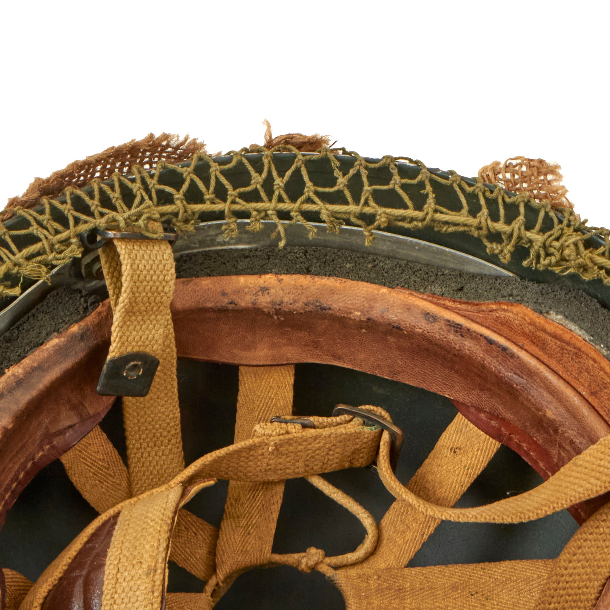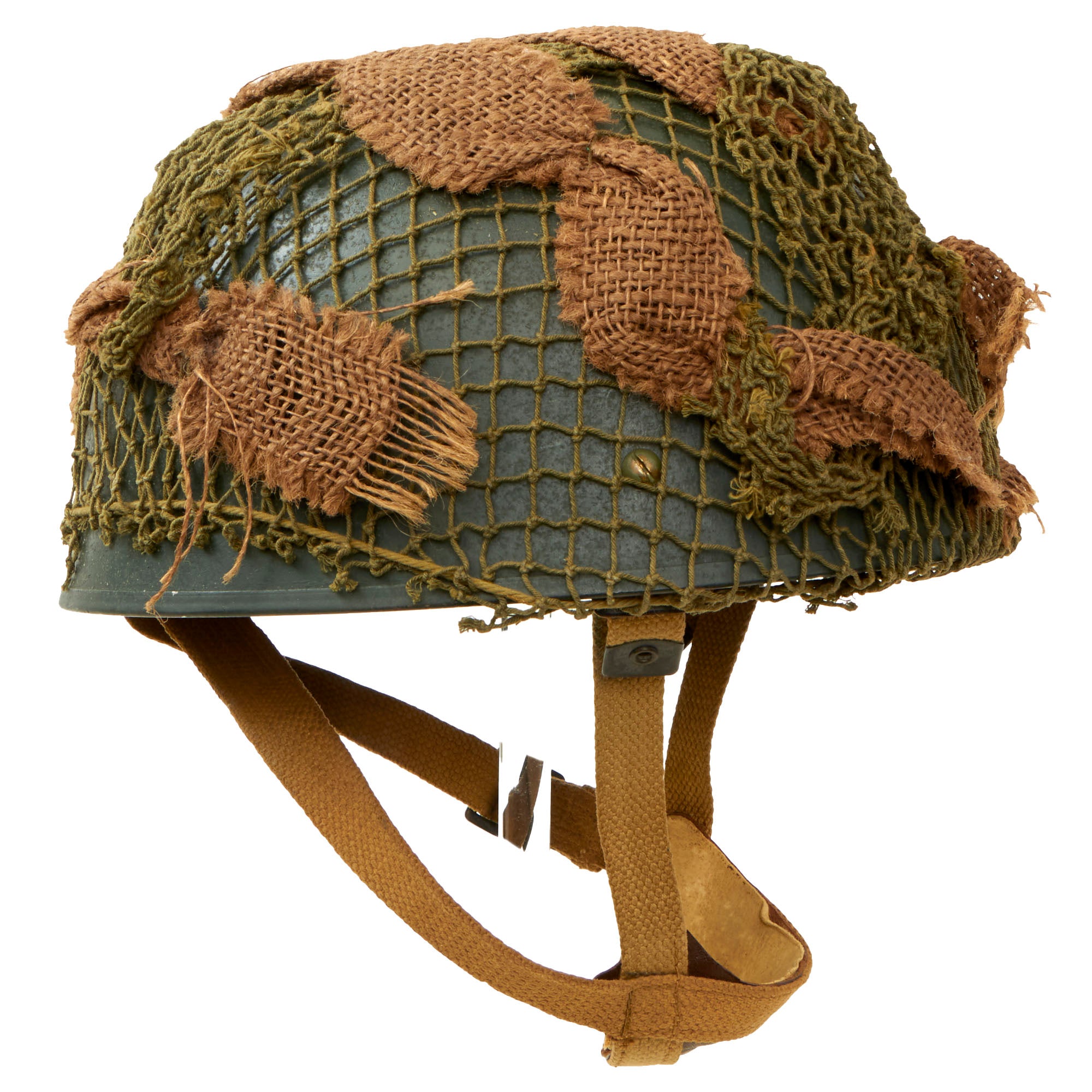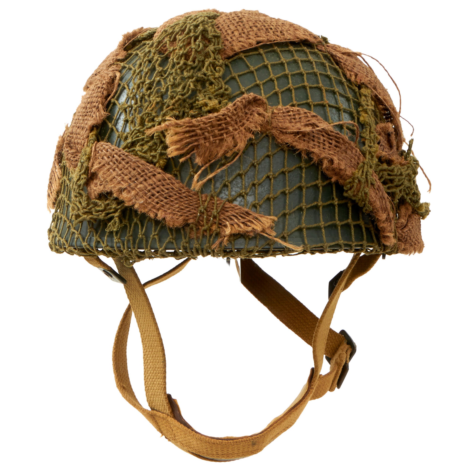 The chinstrap and leather cup are present and in great condition. The helmet retains nearly all of its original factory applied exterior paint. What makes this helmet truly exceptional is the camouflage net with integrated burlap over the helmet, most likely done for this Operation Musketeer.