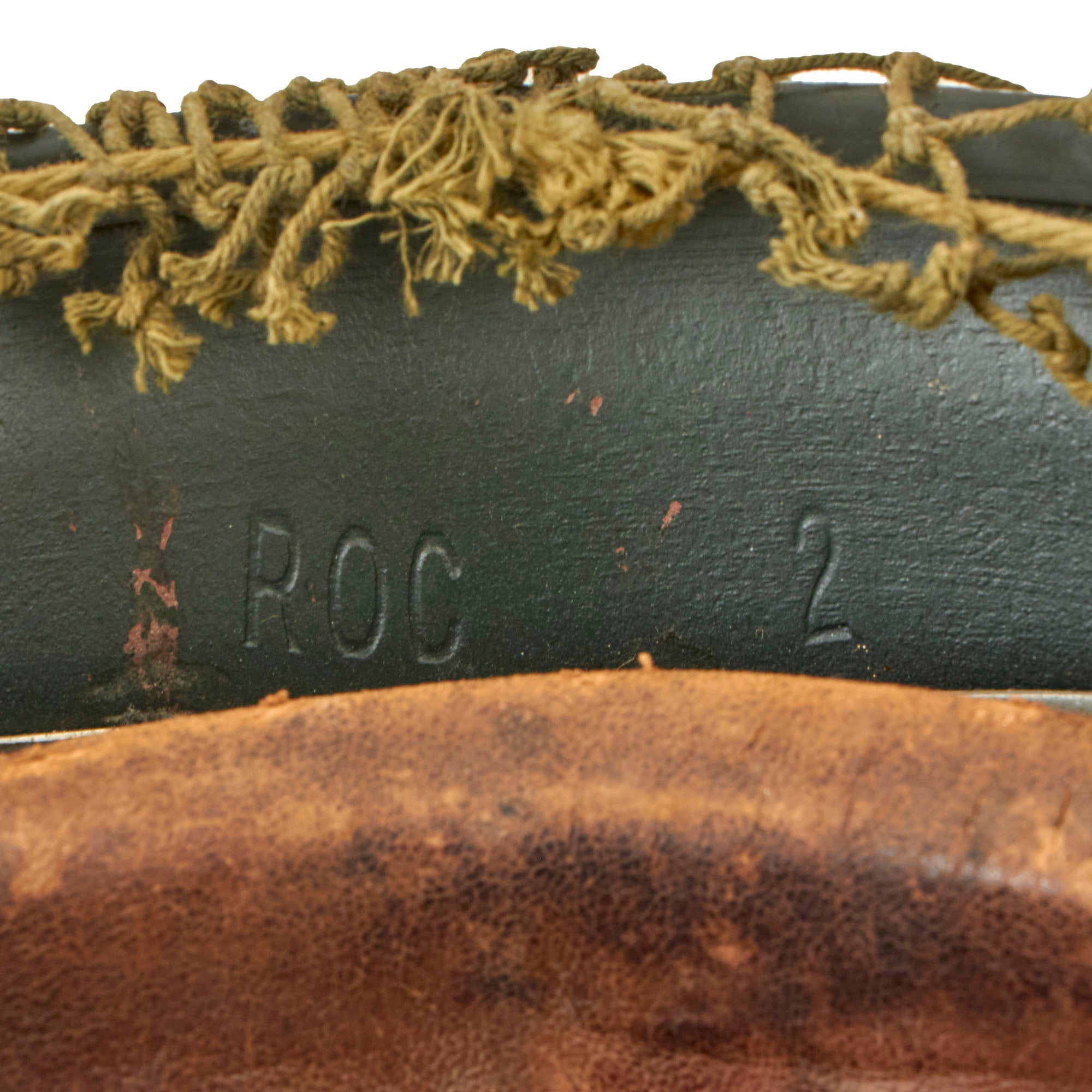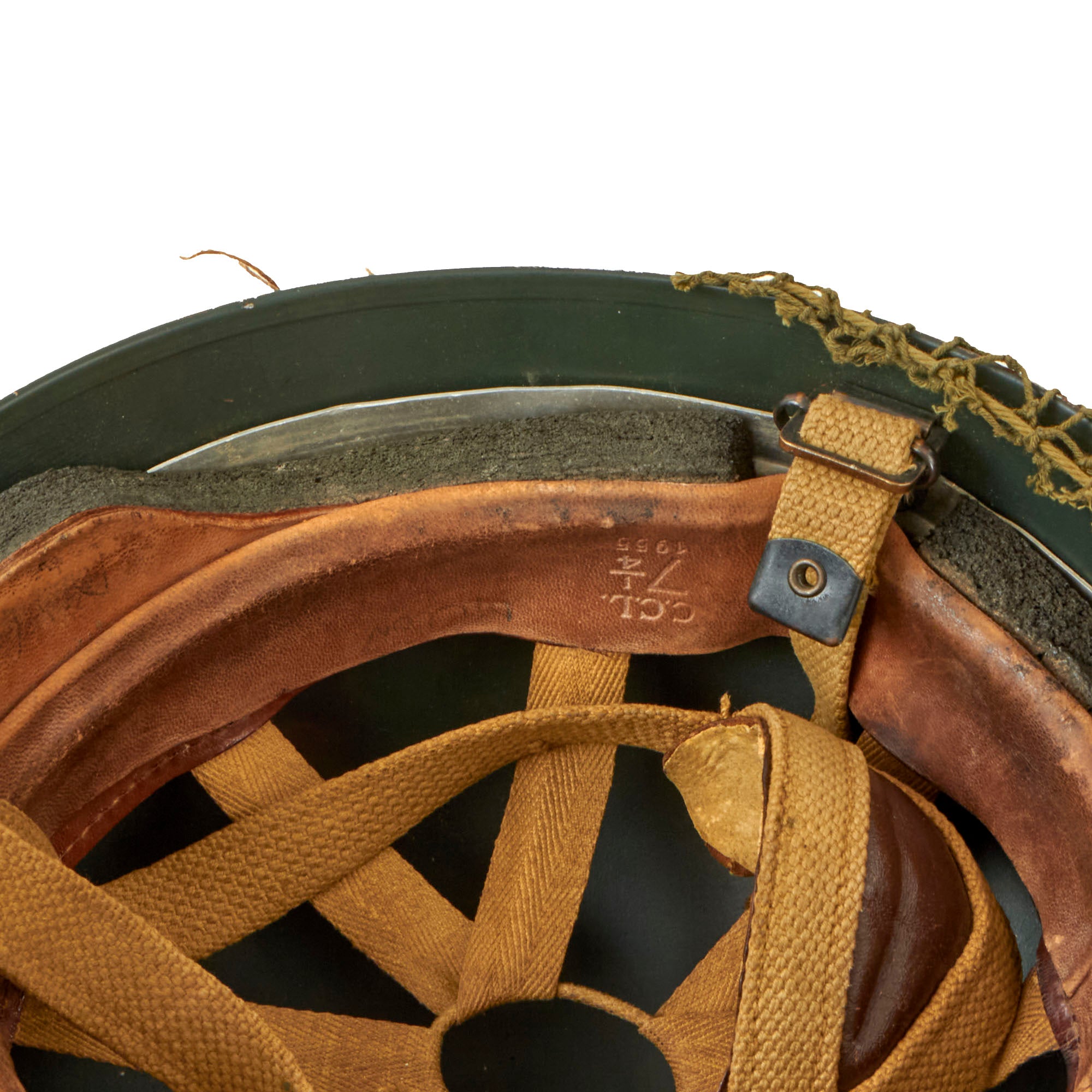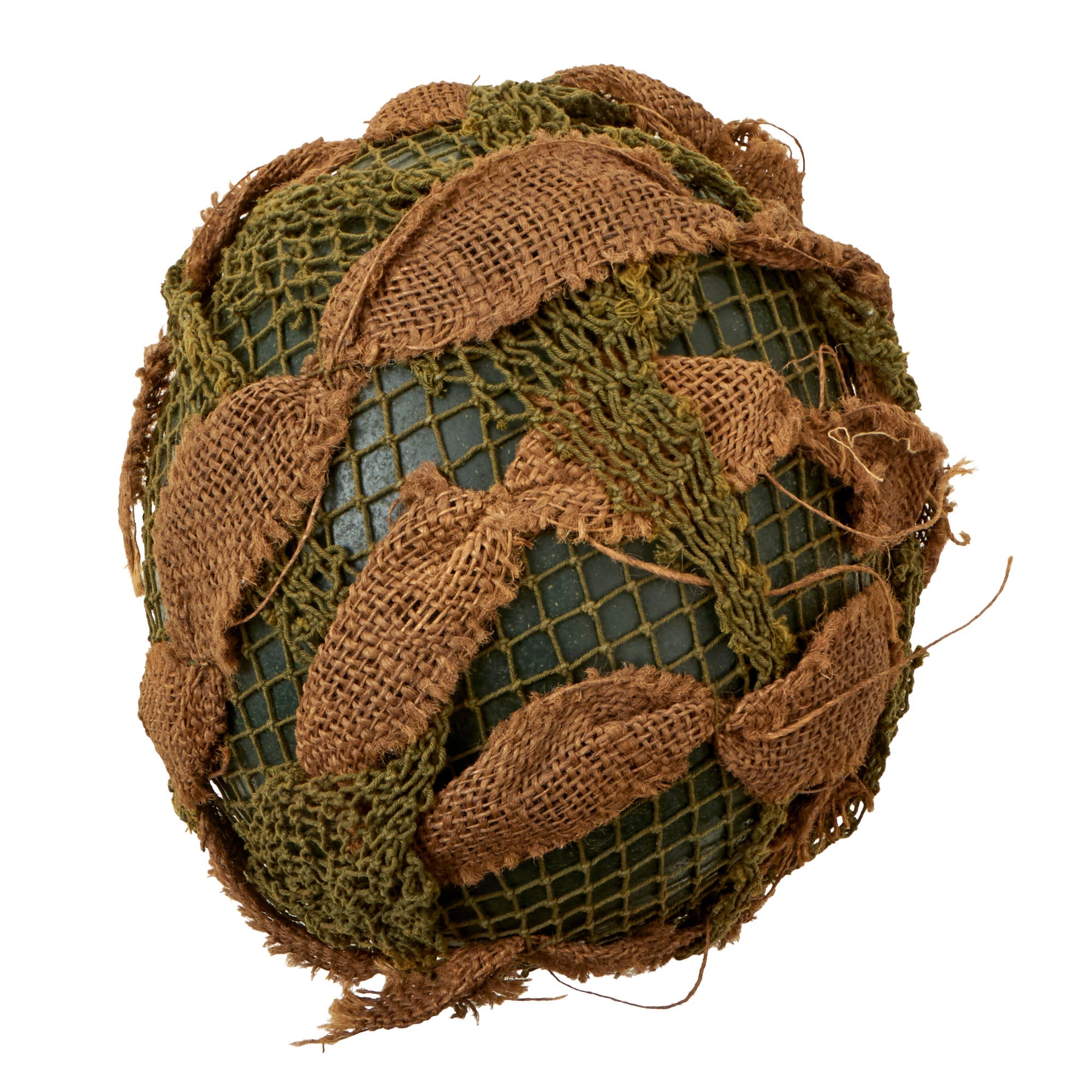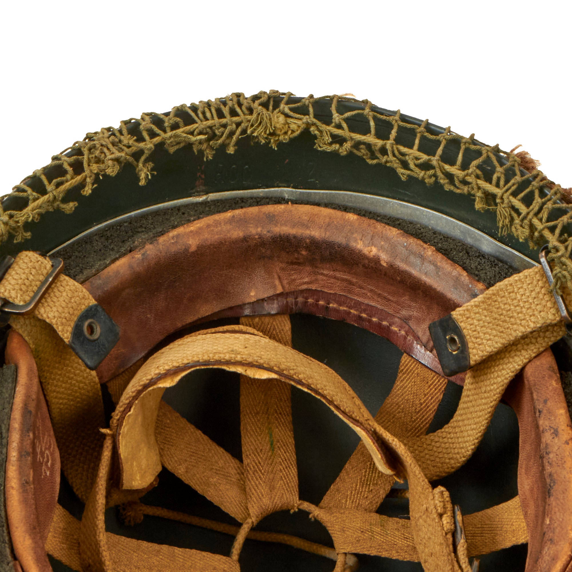 The chinstrap and leather cup are present and in great condition. The helmet retains nearly all of its original factory applied exterior paint. What makes this helmet truly exceptional is the camouflage net with integrated burlap over the helmet, most likely done for this Operation Musketeer.