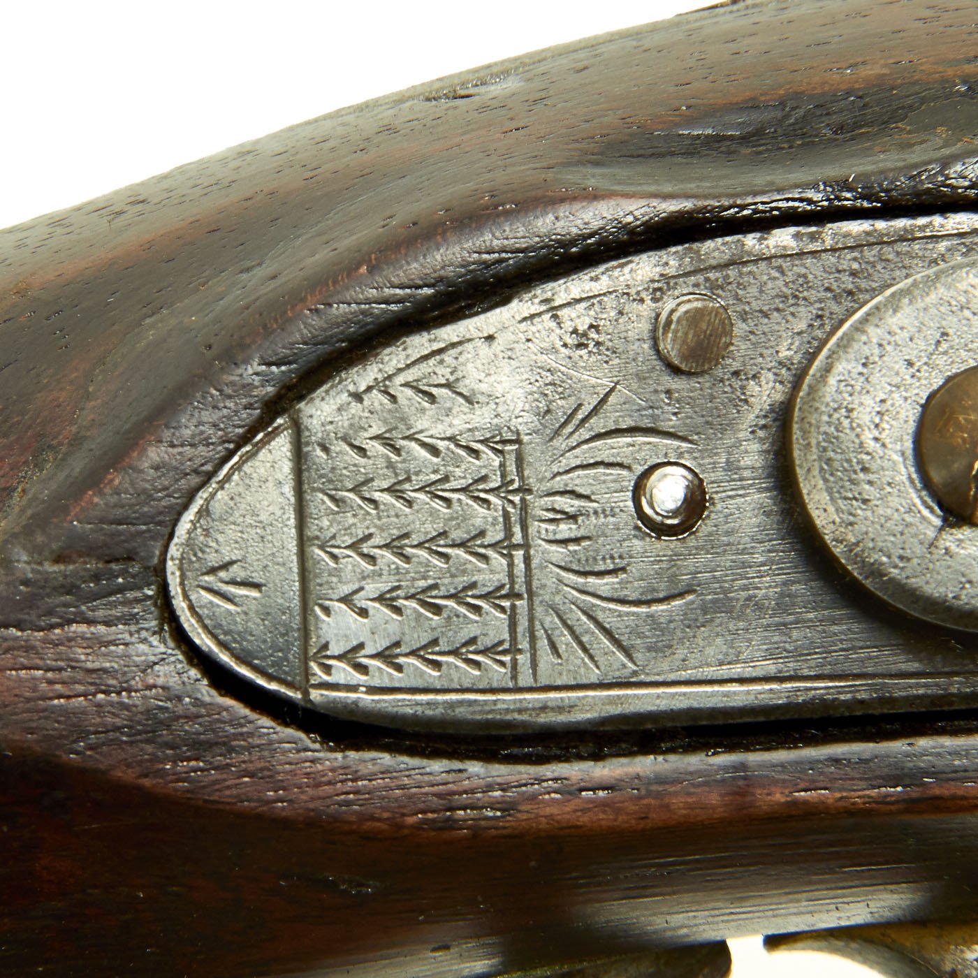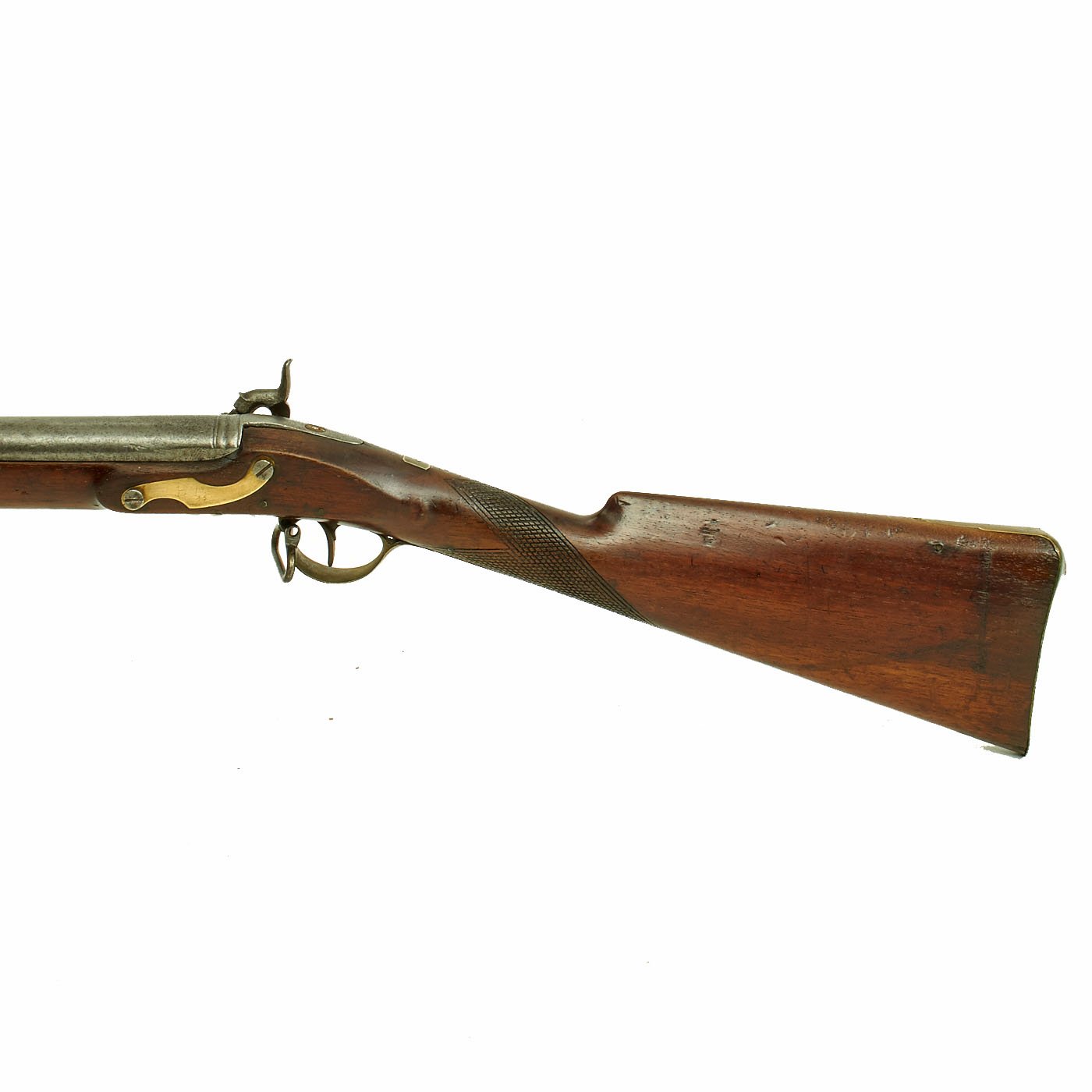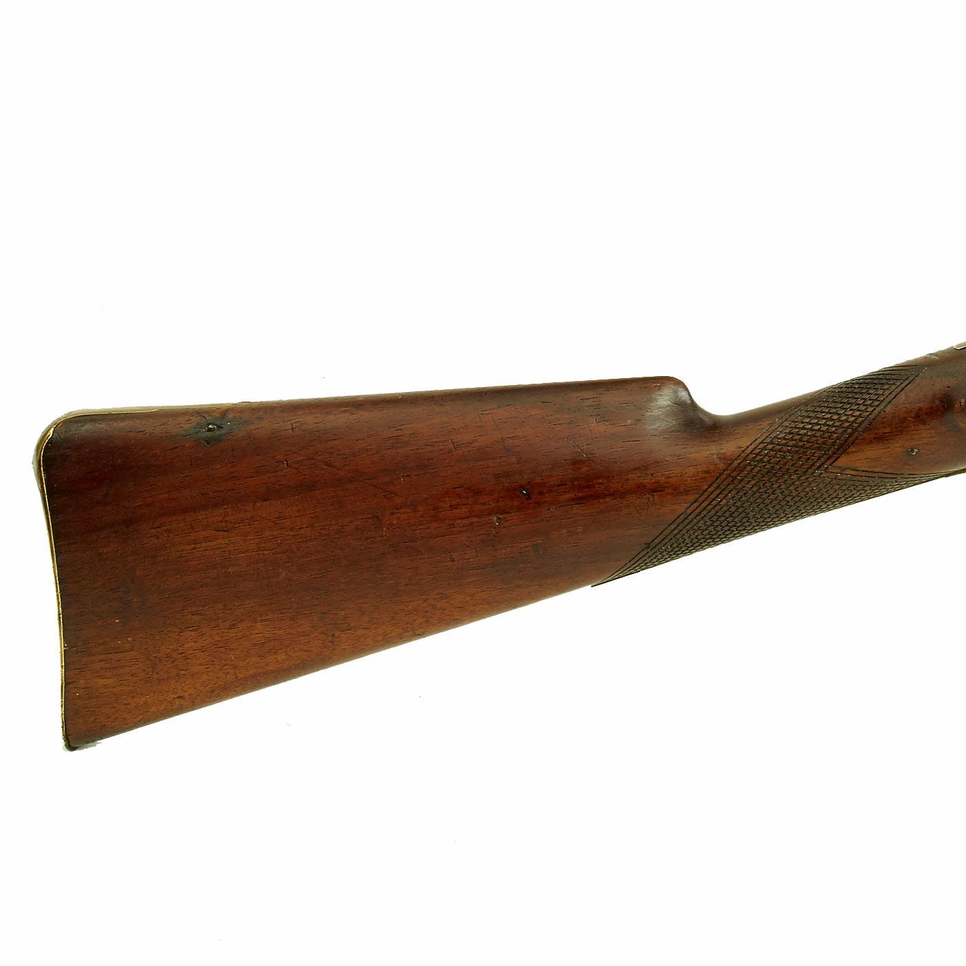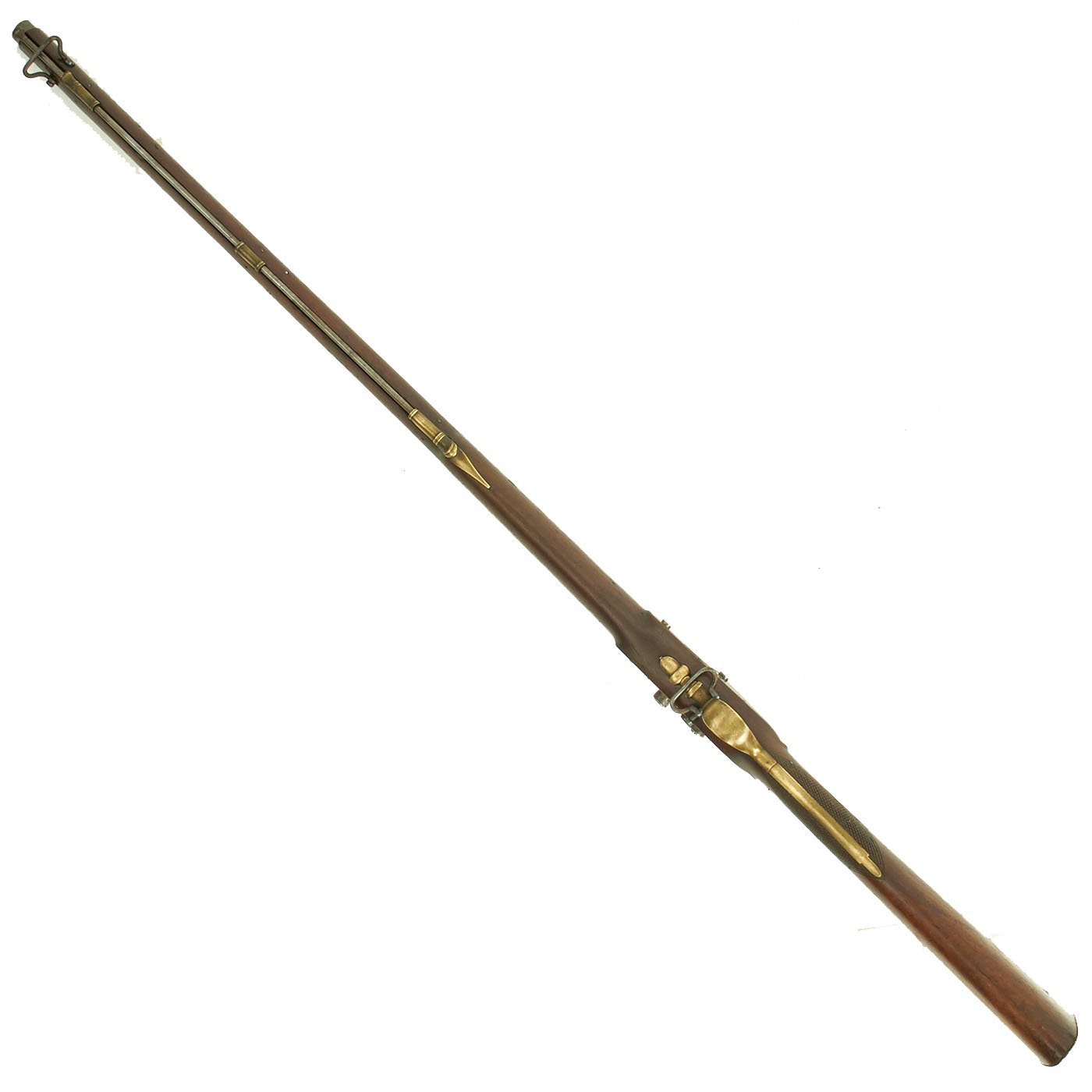 Fine Walnut full stock nicely checkered at grip with all Brass Mounts of British style from the early 1800's. Barrel is 32 1/2" and the gun measures 48 1/2 overall. The stock comes almost to the muzzle, which indicates that the weapon has been slightly shortened by approximately 2" - 3" during its working life. The lock functions, but fires at both half cock and full at present, so it is in need of a tumbler adjustment.